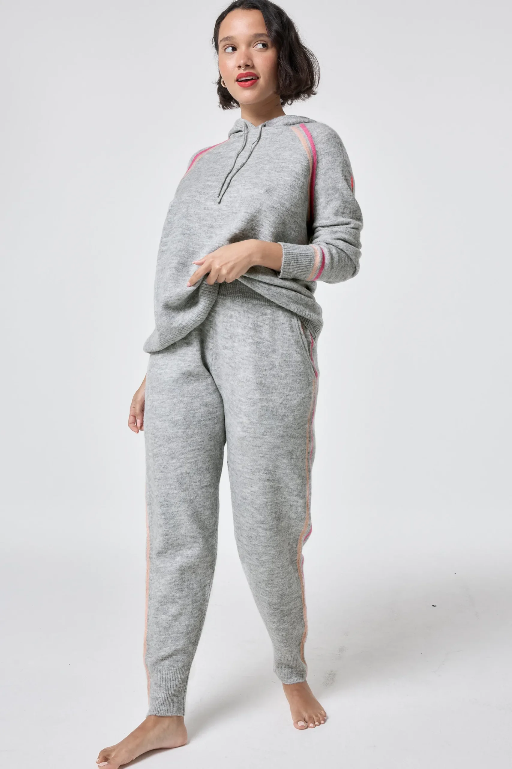 Our grey with peach and pink stripe knitted joggers deliver a perfect blend of comfort and style. Team them with the matching knitted hoodie and a pair of trainers to run errands on the weekend.