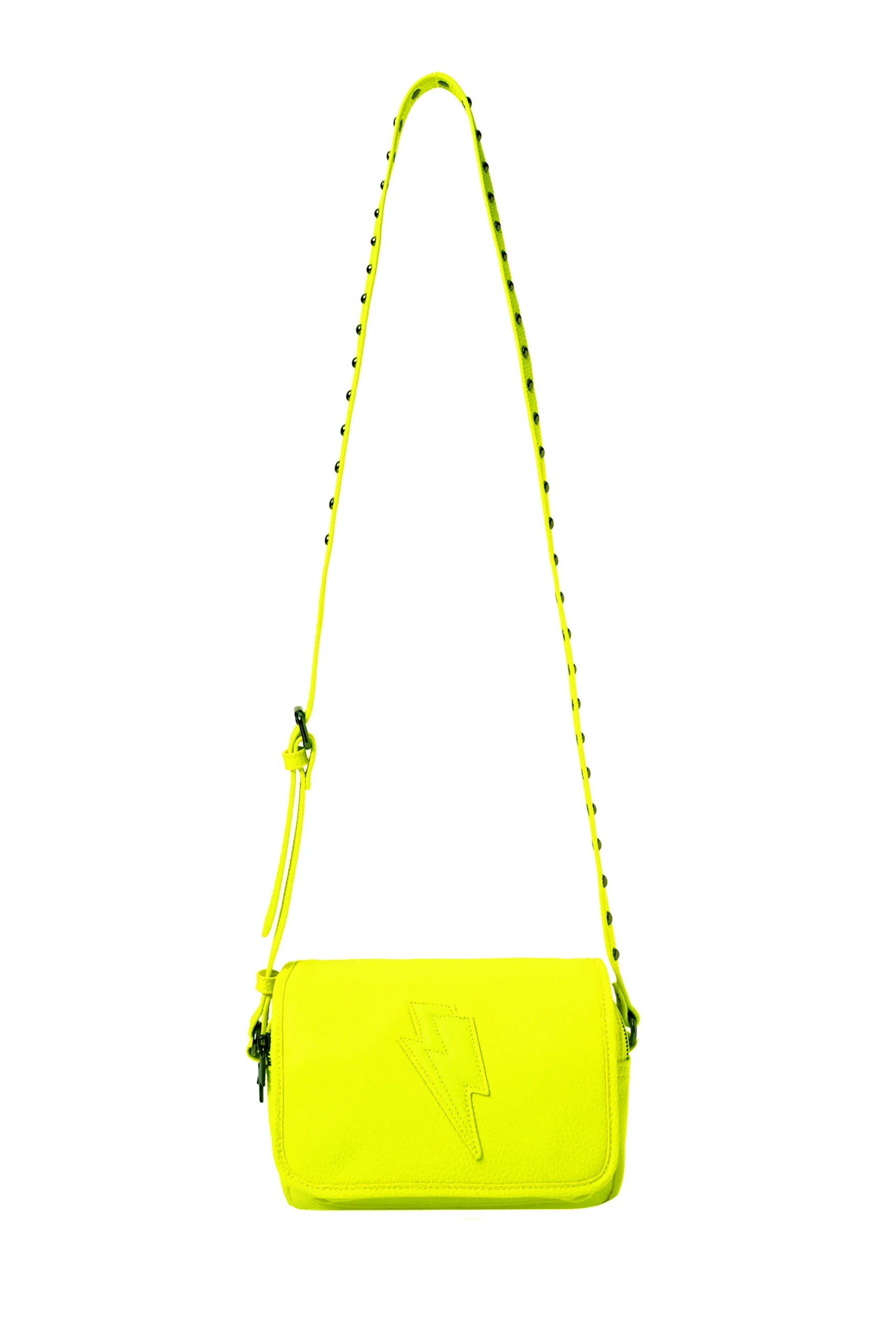 Our neon yellow twin compartment cross body bag will add a fun pop of colour to your weekend wardrobe. Ideally sized and spacious enough to store all your essentials, this sleek bag is detailed with a lightning bolt on the front. Finished with a studded adjustable cross body strap. Please note, the yellow on this bag is a little camera-shy. It’s a true, vibrant neon and pops in real life. Enjoy!