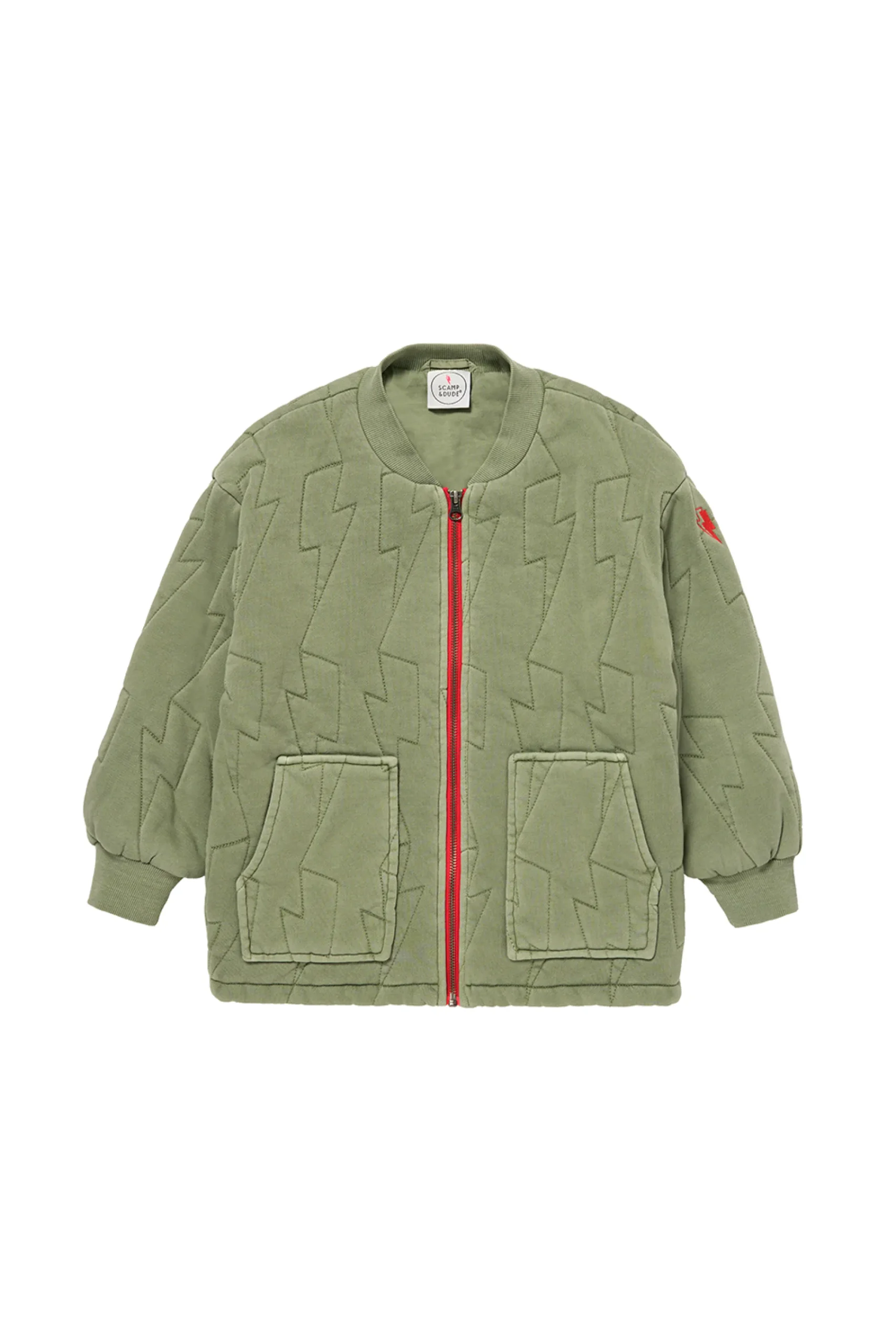 Our kids khaki quilted lightning bolt bomber jacket can be easily thrown on when the weather’s being unpredictable. It has a comfy oversized fit and a zipper fastening.