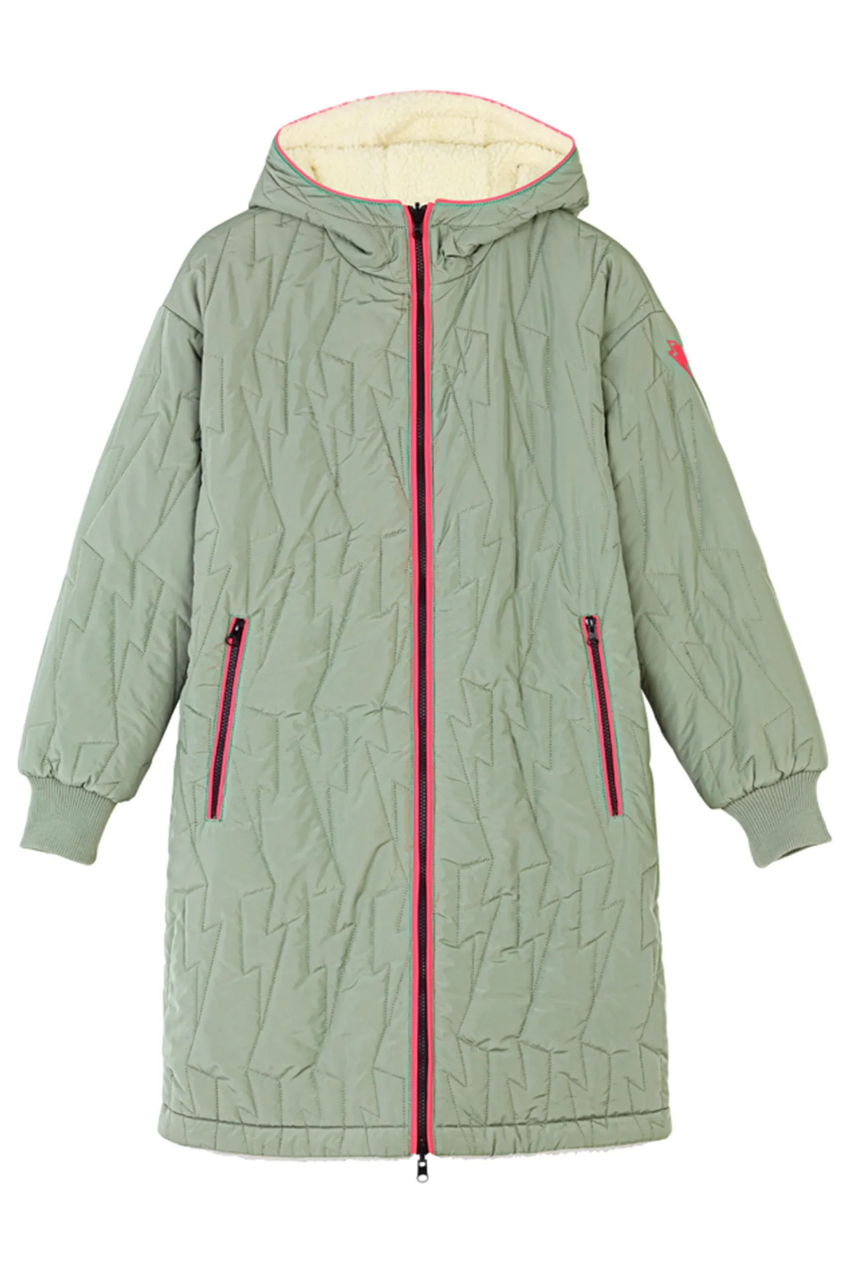Reversible pale khaki padded coat with signature lightning bolt quilting detail on one side and cosy soft cream borg on the other.