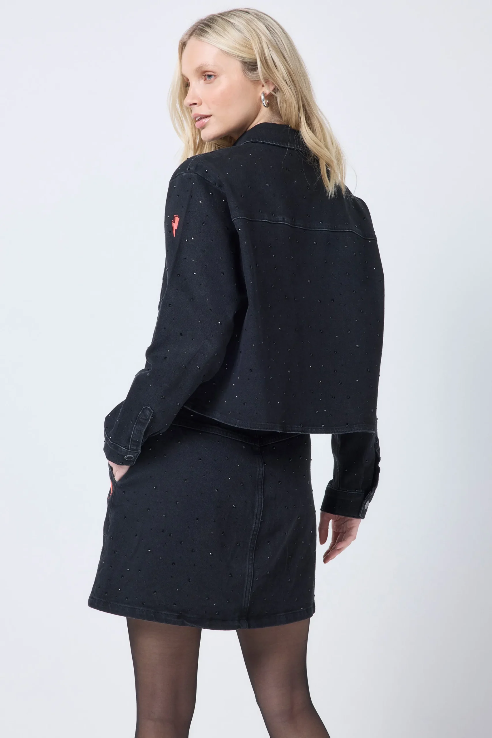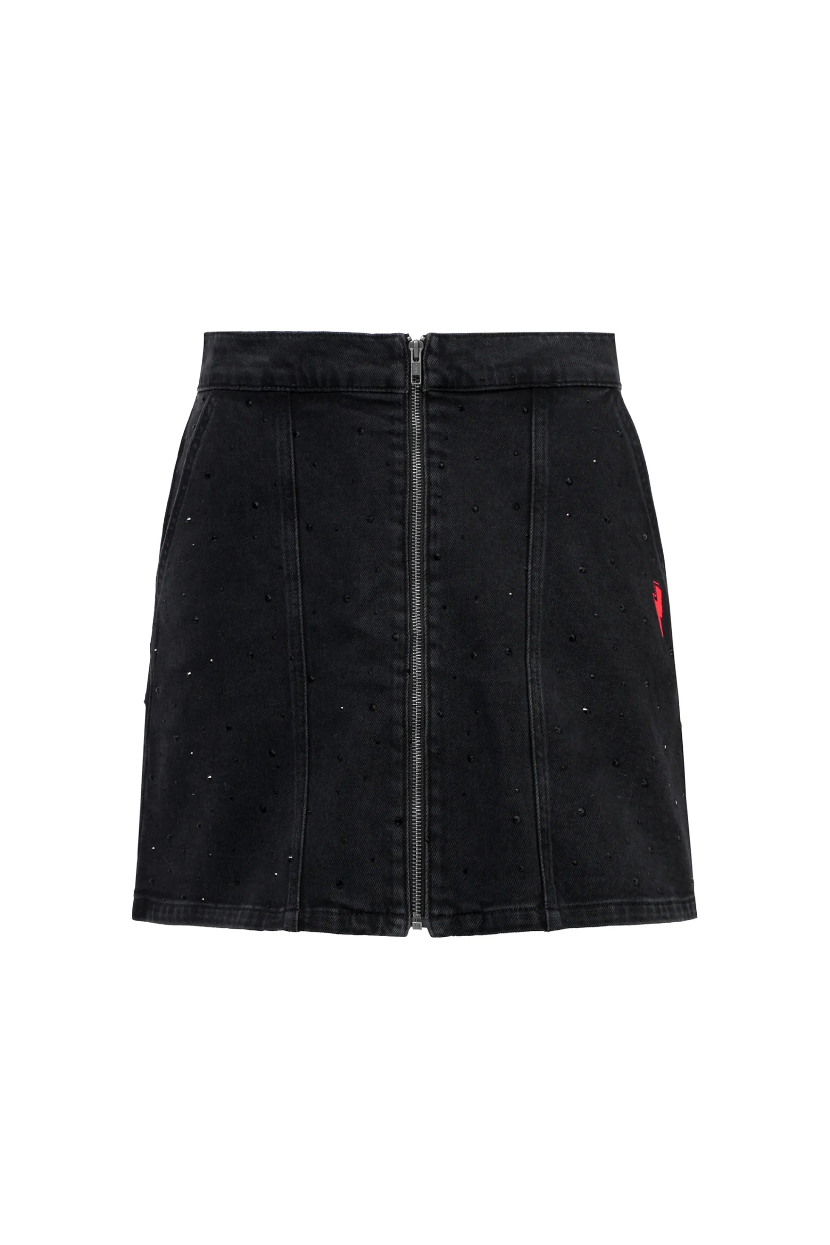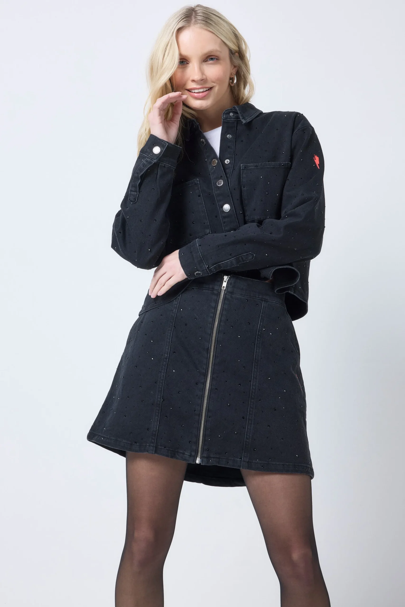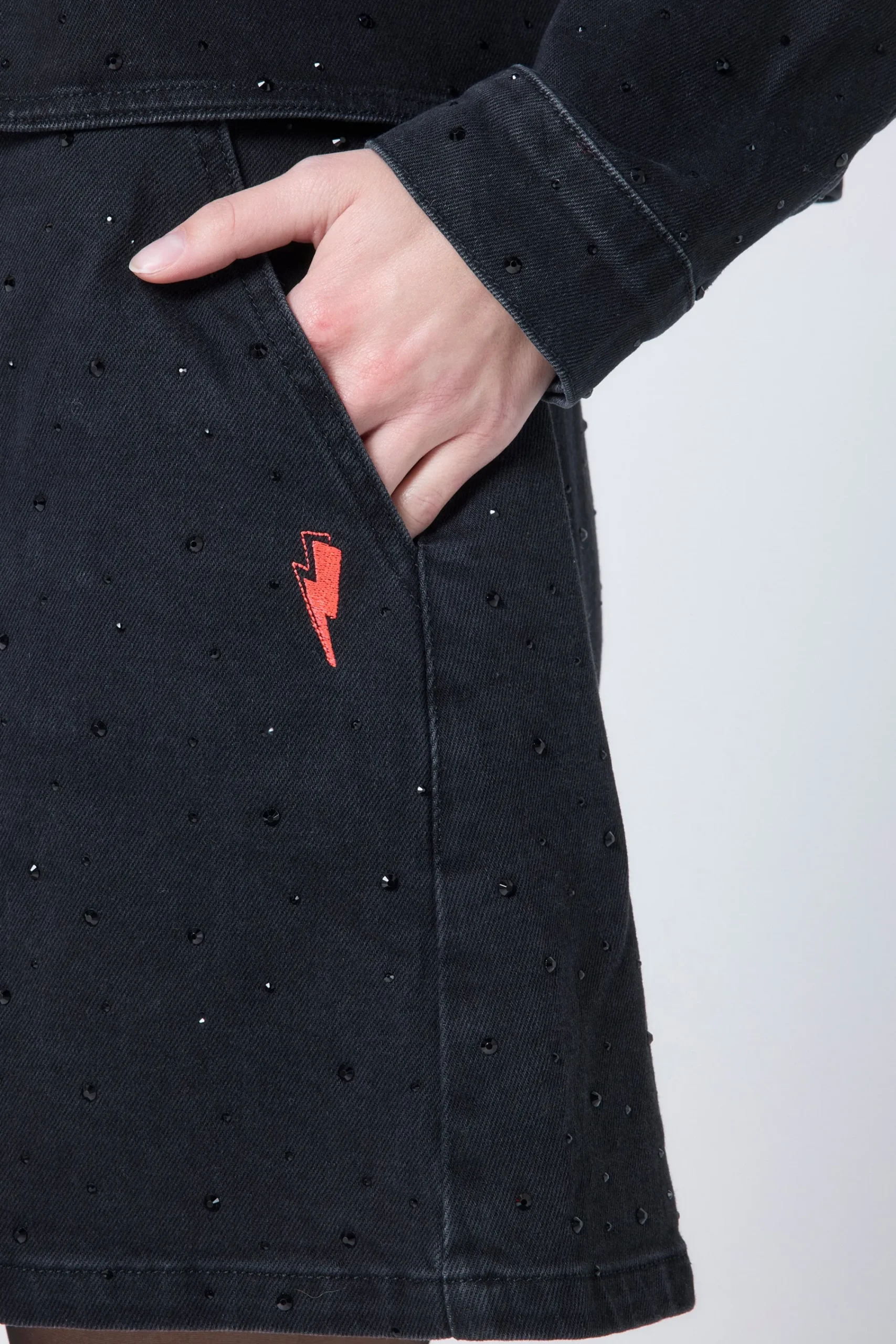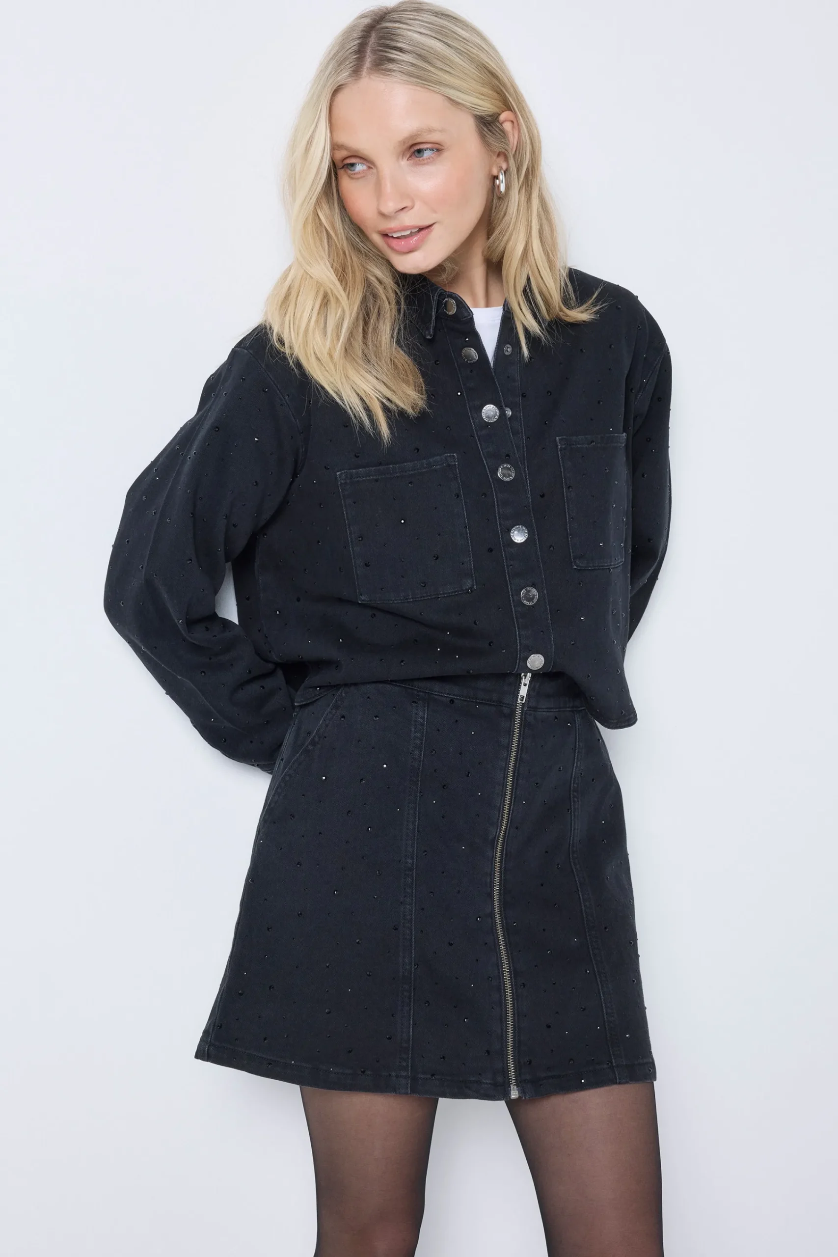 Giving your jeans the day off just got easier. This black embellished mini skirt has both structure and softness making it perfect for every day. With a mini length and front zip detail, you can make a statement with any day or evening outfit.