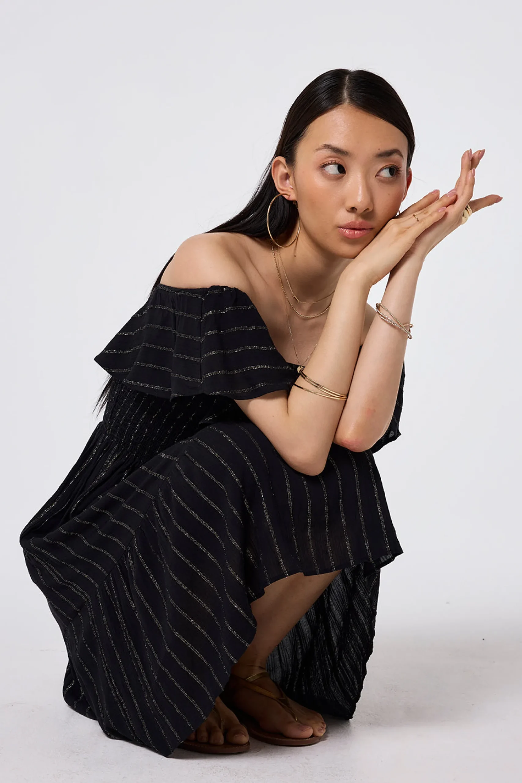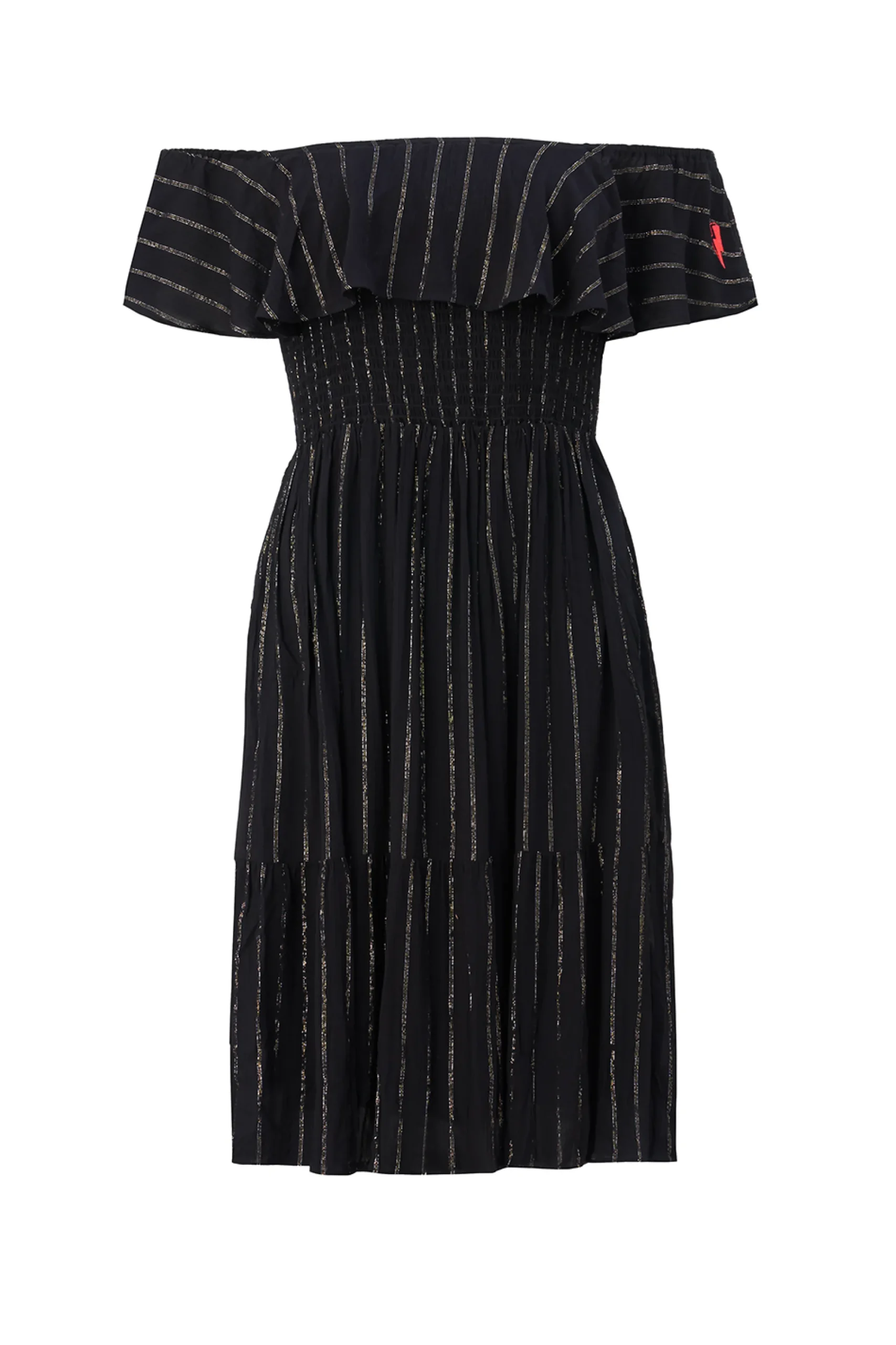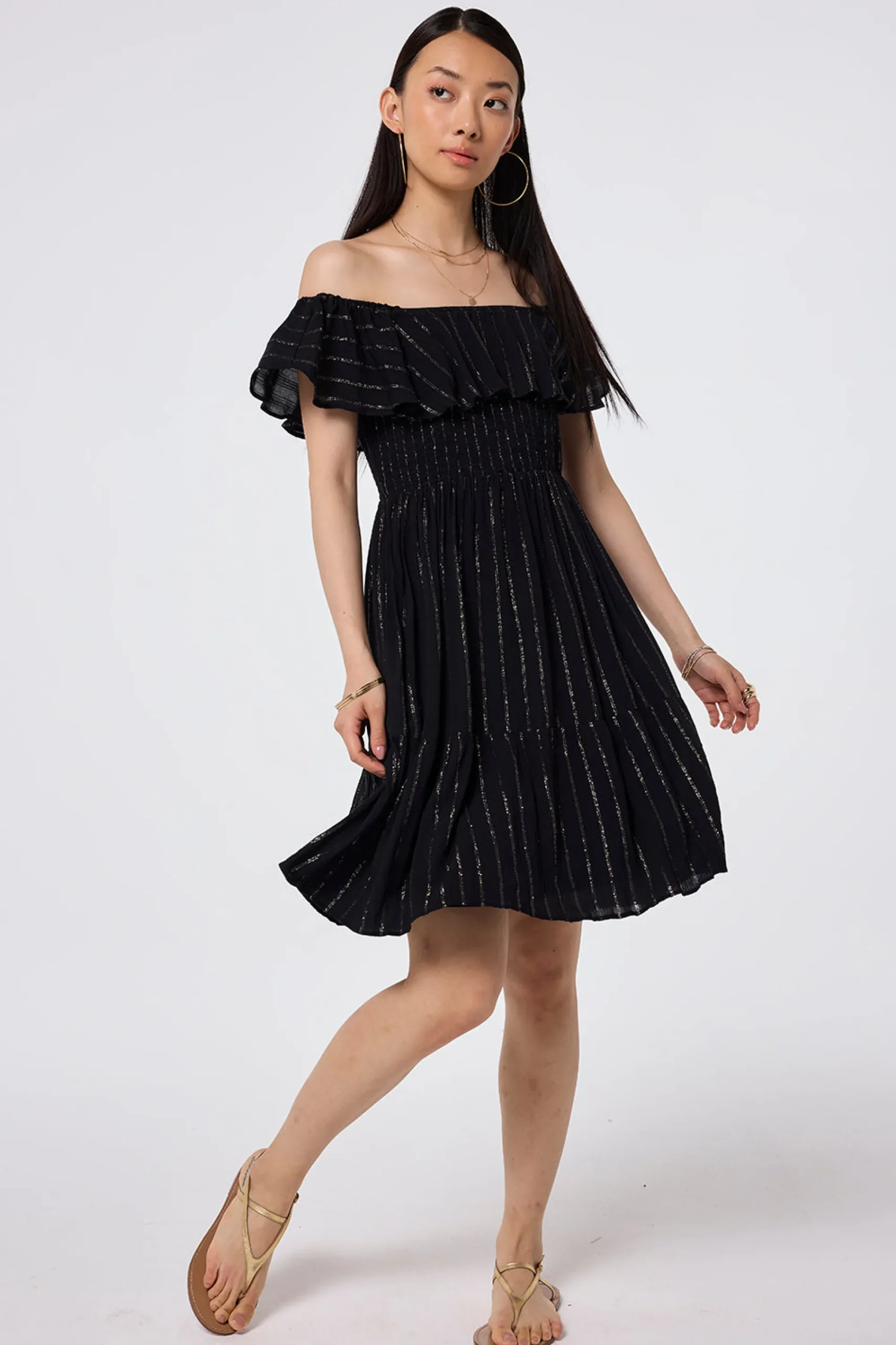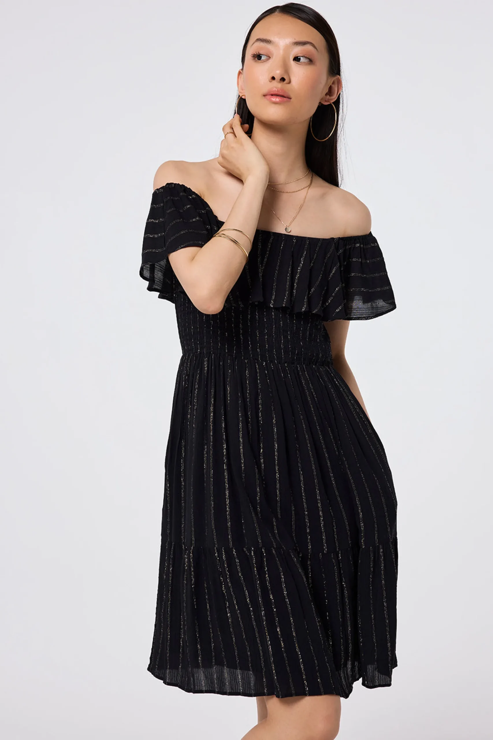 Combining comfort and glamour, our stunning black with lurex short bardot dress is made to flatter. Style it three different ways, depending on your mood – on the shoulder, off the shoulder or strapless, by tucking the lightweight fabric in under your arms for a bandeau style. A versatile addition to any summer wardrobe, this dress can be pared back for casual days or up styled for evening affairs with shimmering accessories and strappy heels.