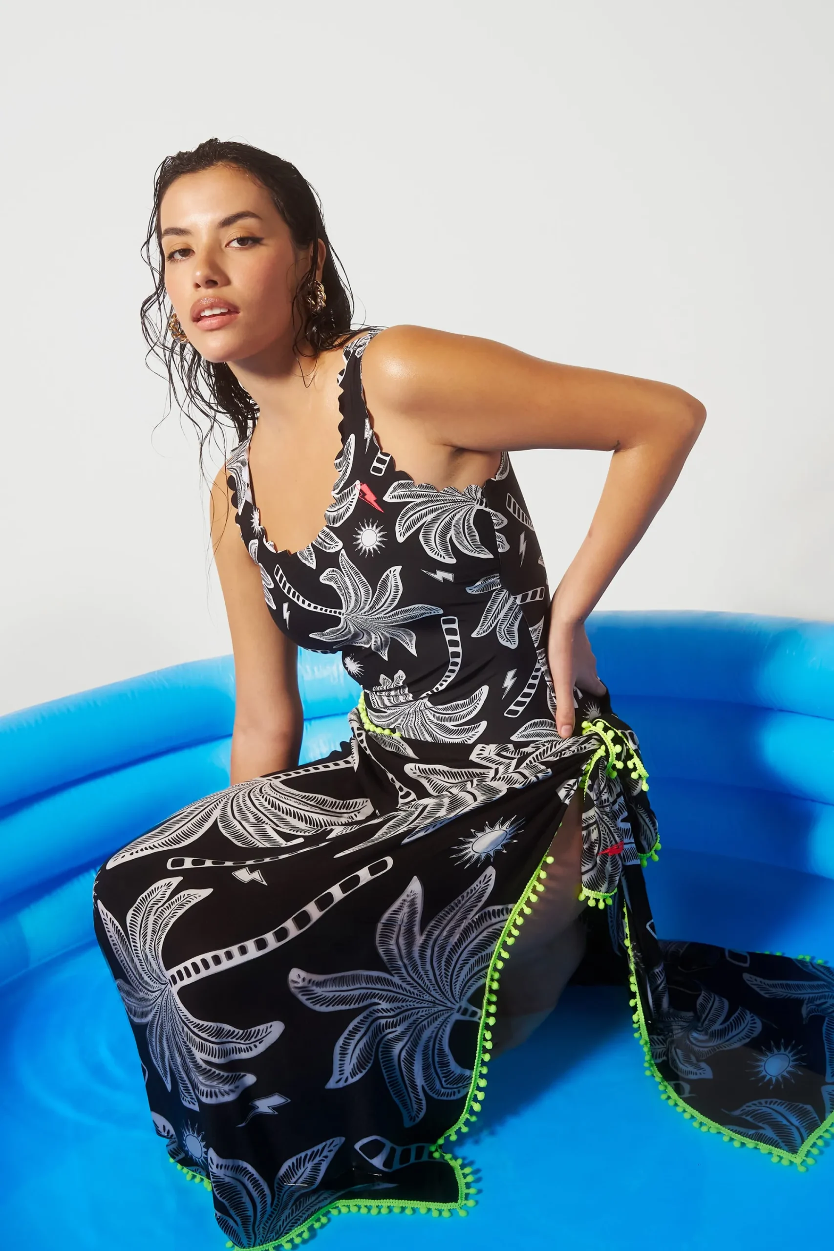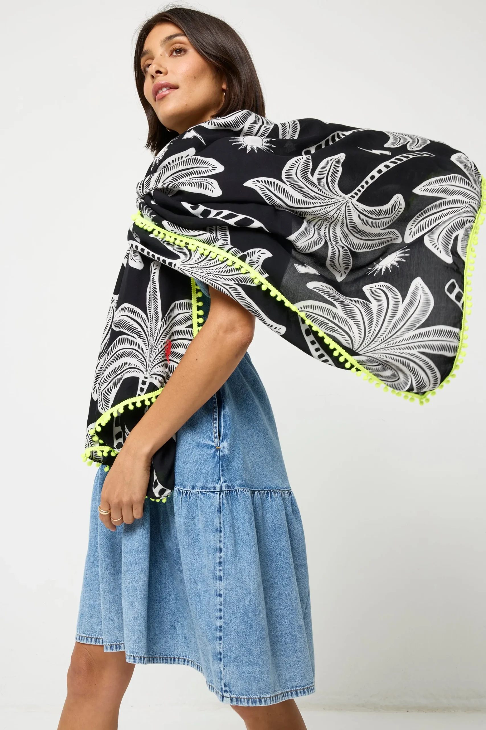 A super soft, superpower infused scarf in our black palm spring and lightning bolt print. Featuring a neon yellow pom pom trim and neon pink embroidered lightning bolt.