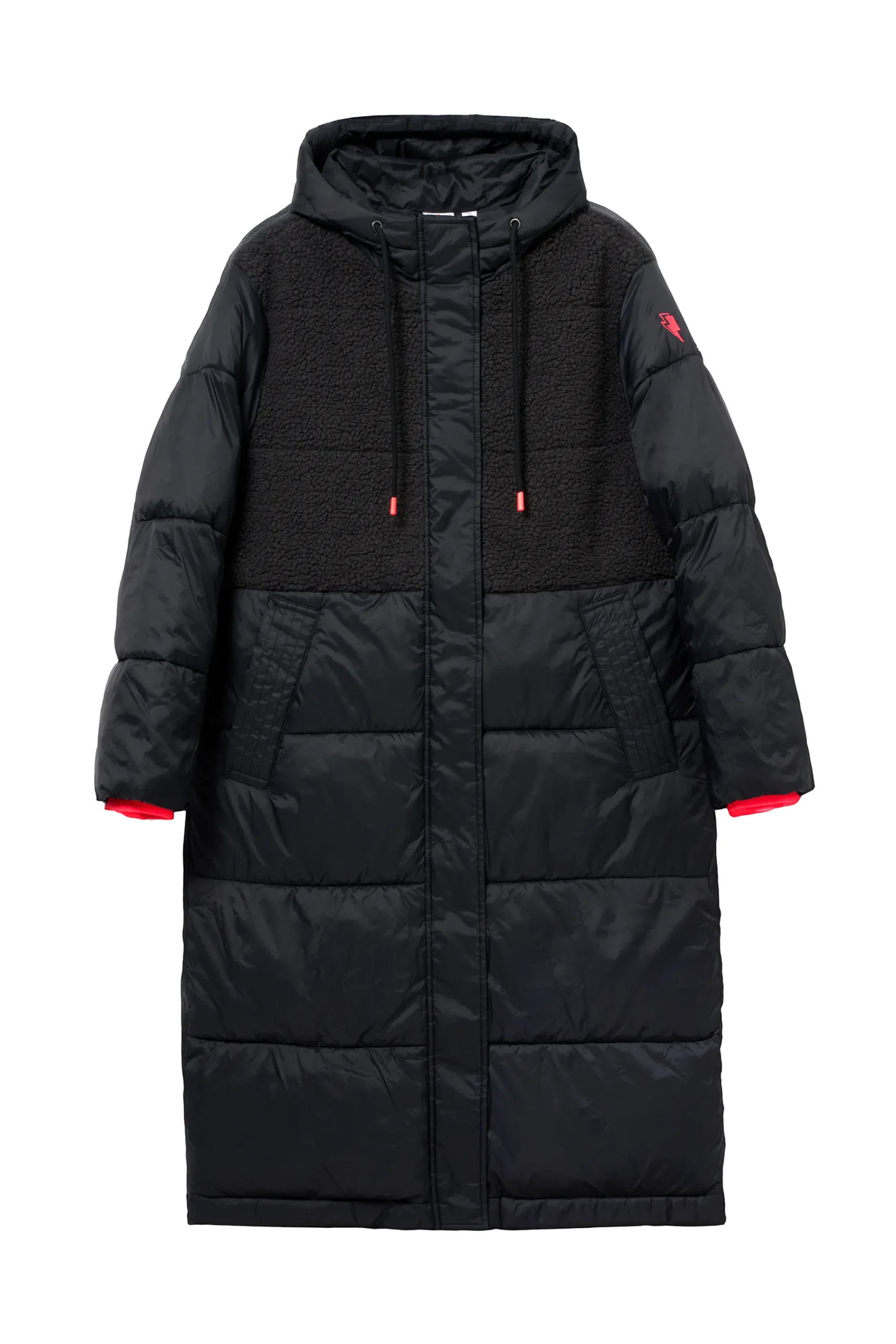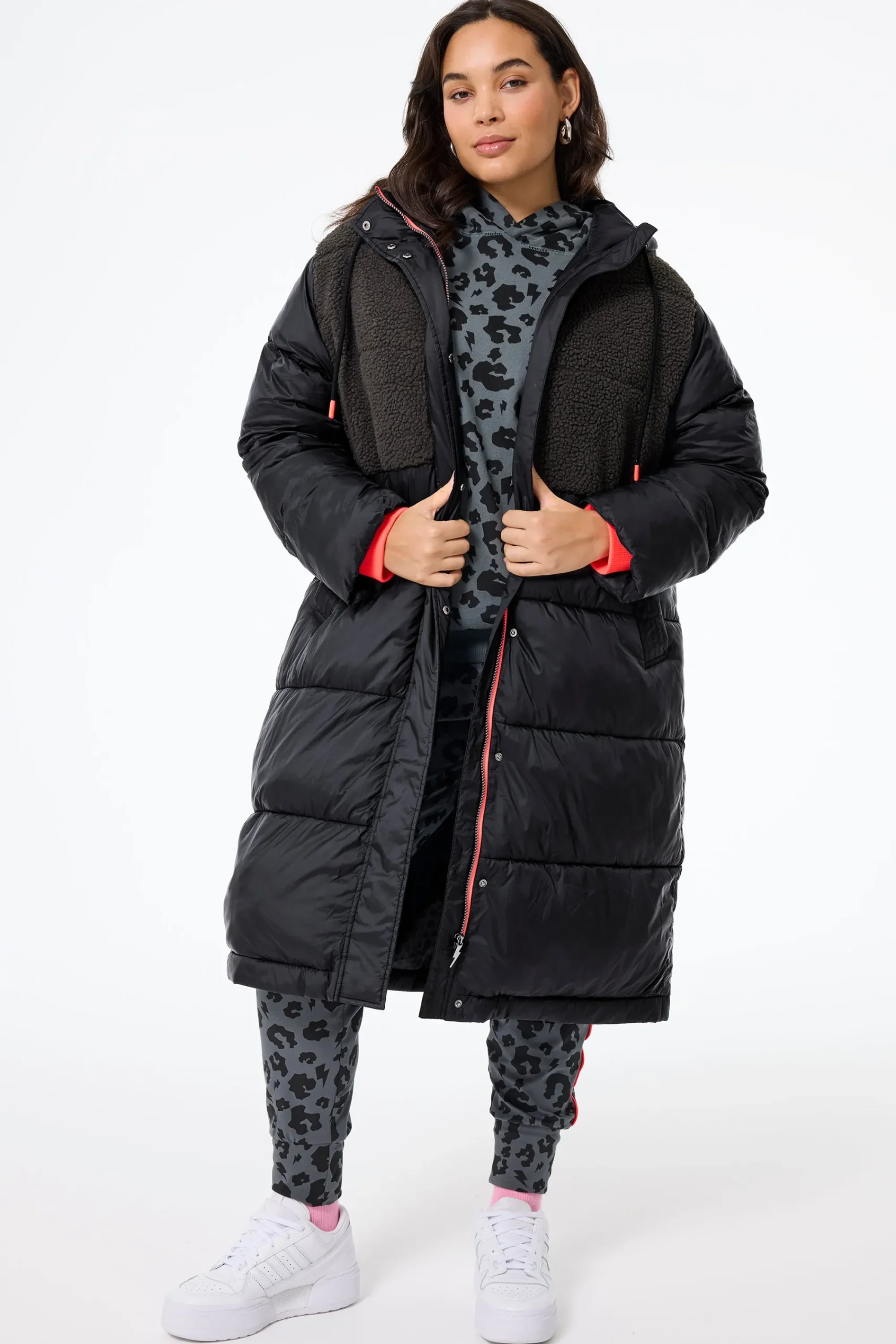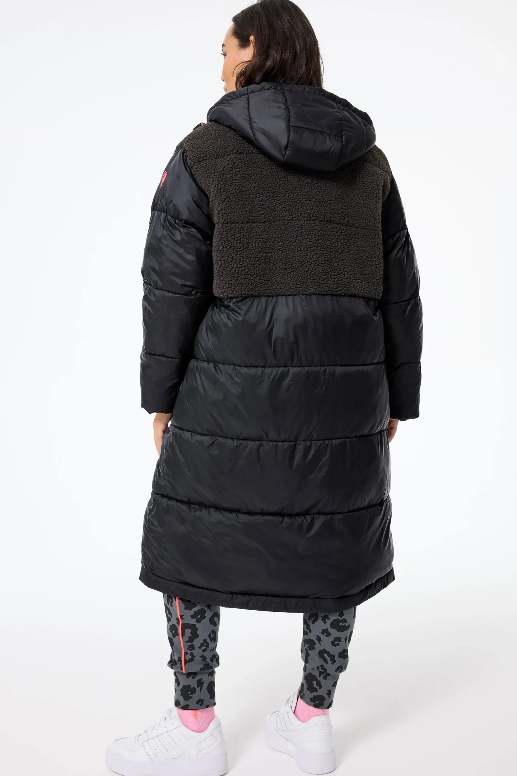 Take cover and cosy up in this black quilted longline puffer coat, your Autumn/Winter wardrobe staple. Adorned with borg detail, the long length style can be layered over your loungewear, jumpers and jeans or dresses to keep you warm and stylish all day long.