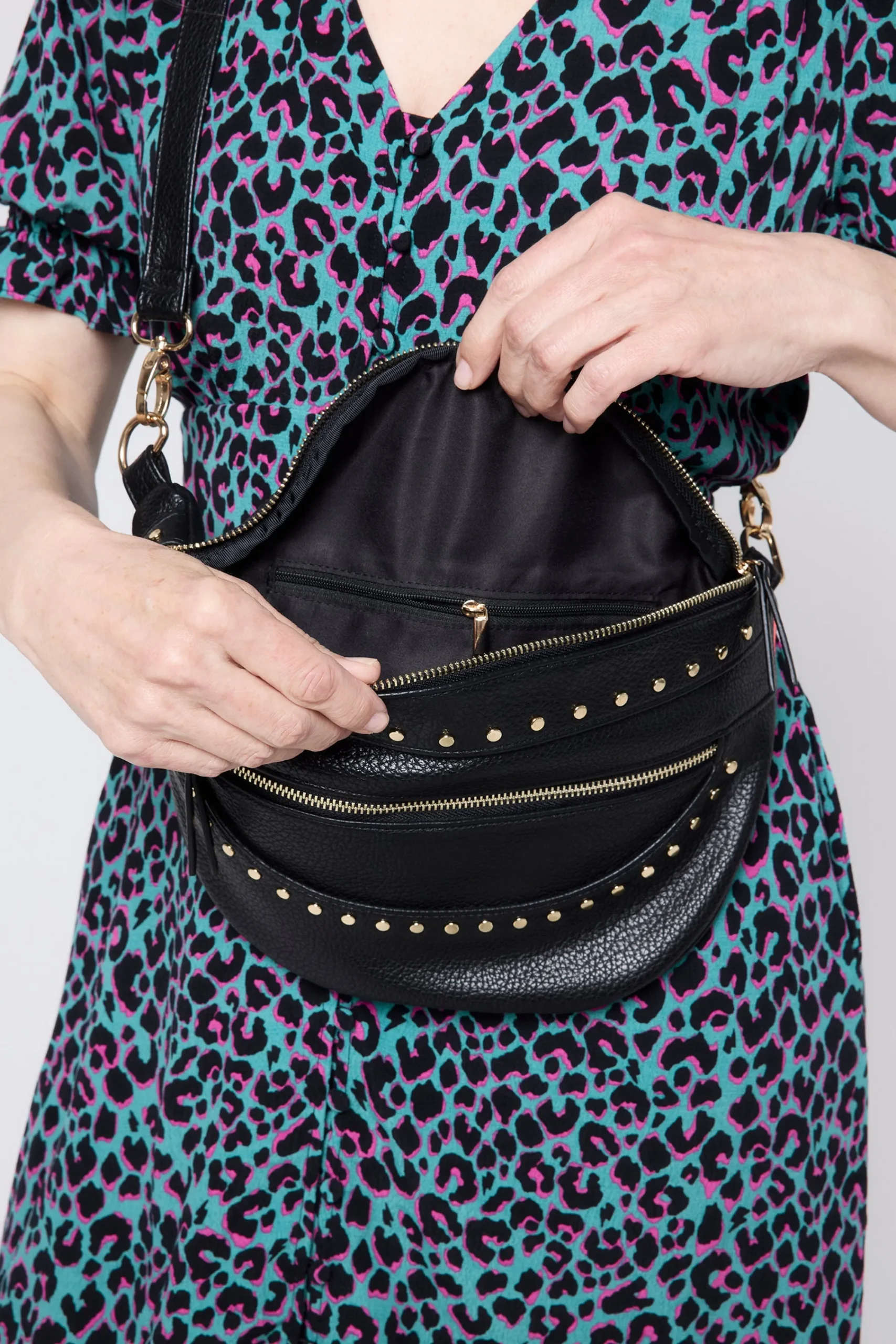 Our black bum bag with stud detailing provides hands-free convenience with zip pockets to keep you organised on the go. Roomy, practical and secure so you can keep everything safe and stylish this festival and holiday season, we’re popping sunnies in ours so we’re ready when the sun shines.