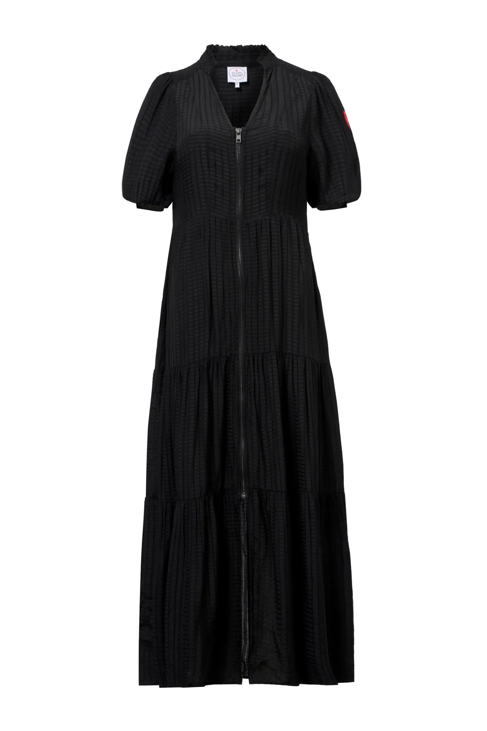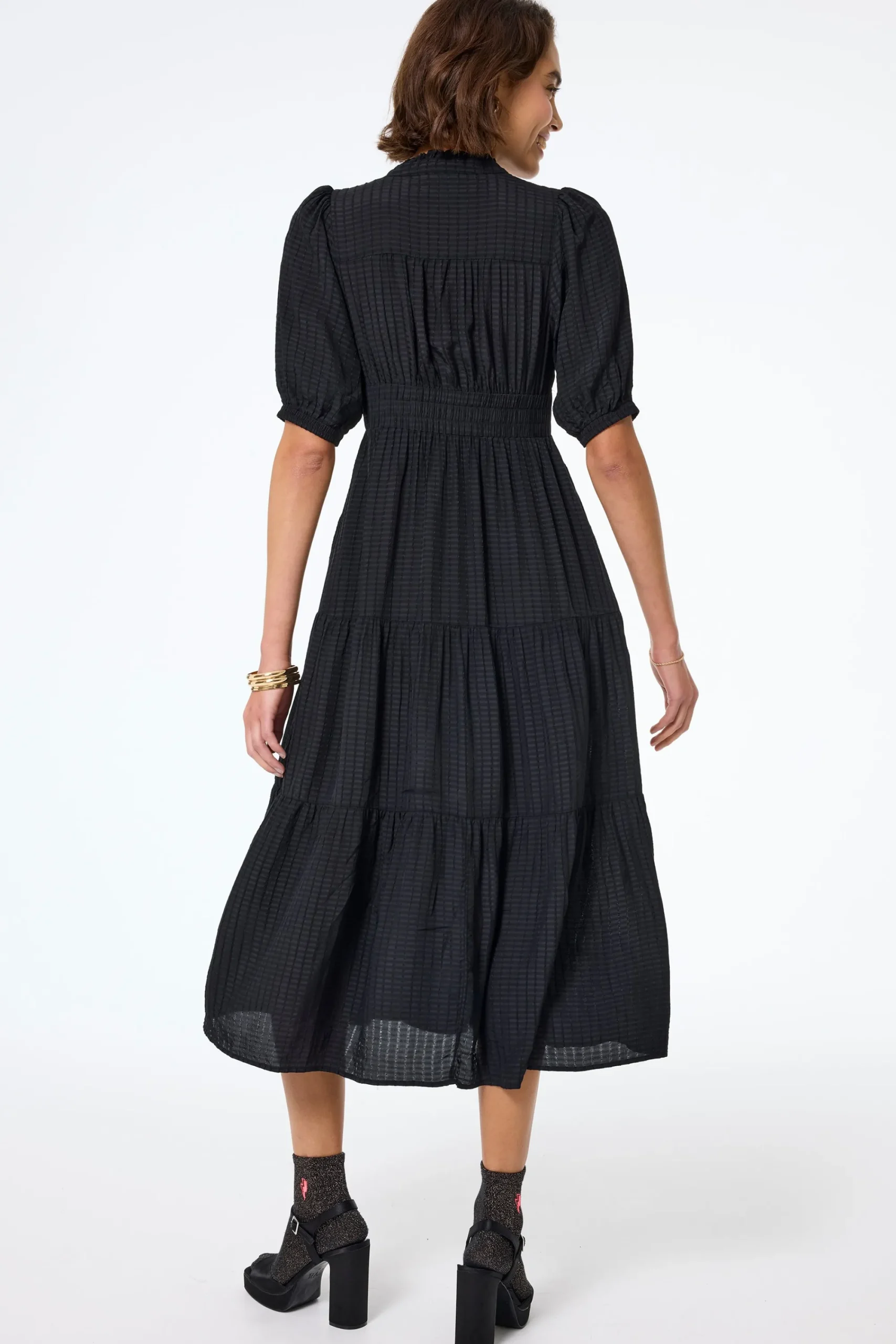Crafted from soft viscose crepe this black zip detail tiered midi dress is all about off-duty charm. It’s crafted with romantic short blouson sleeves, a smart v-neckline and a zip fastening. For a flattering silhouette, the piece is elasticated around the waist while the midi length skirt fall in tiers in a flattering fit and flare style.