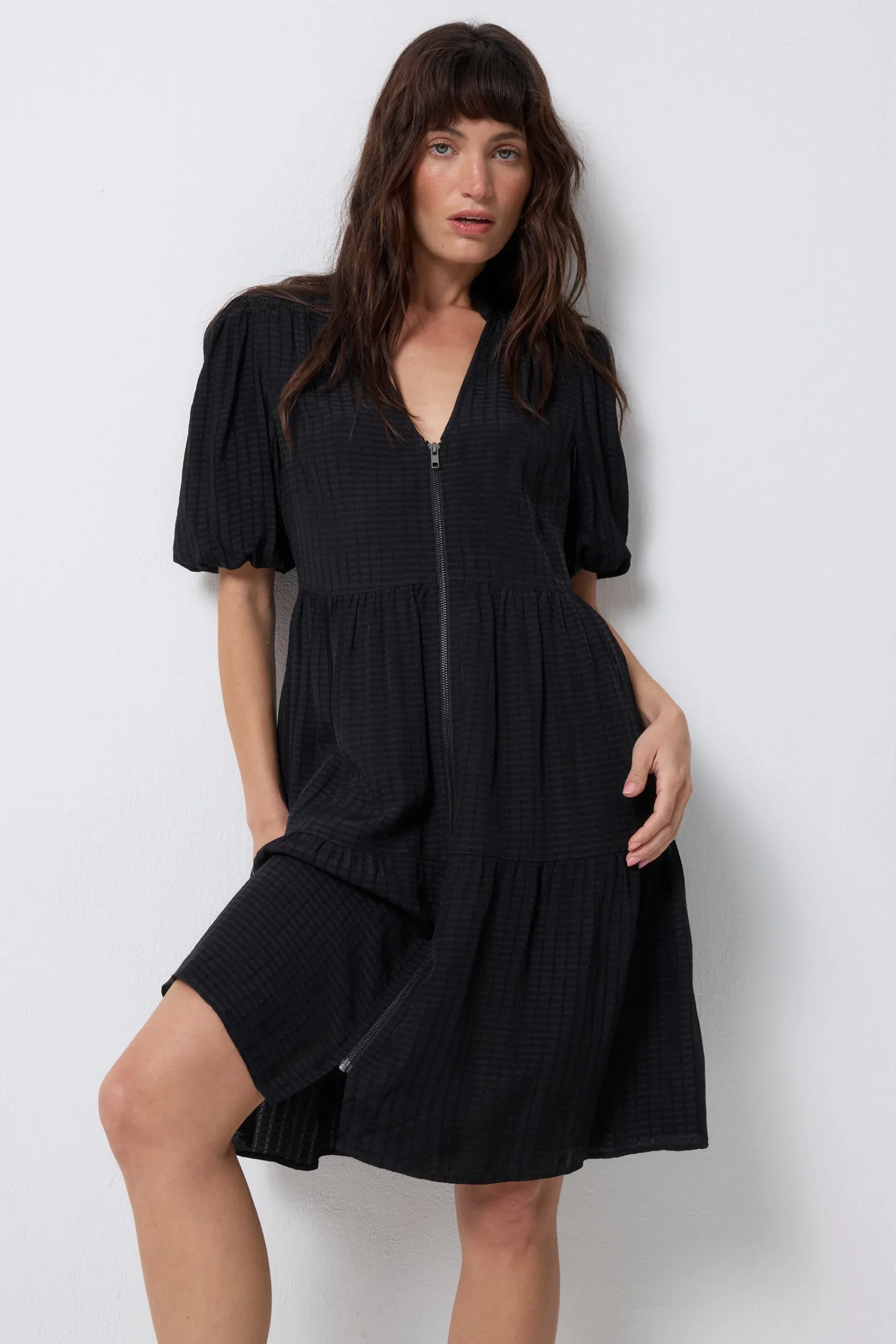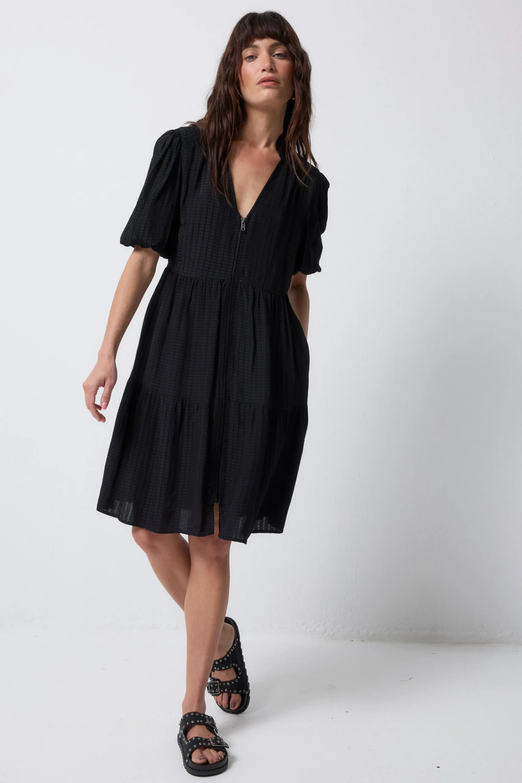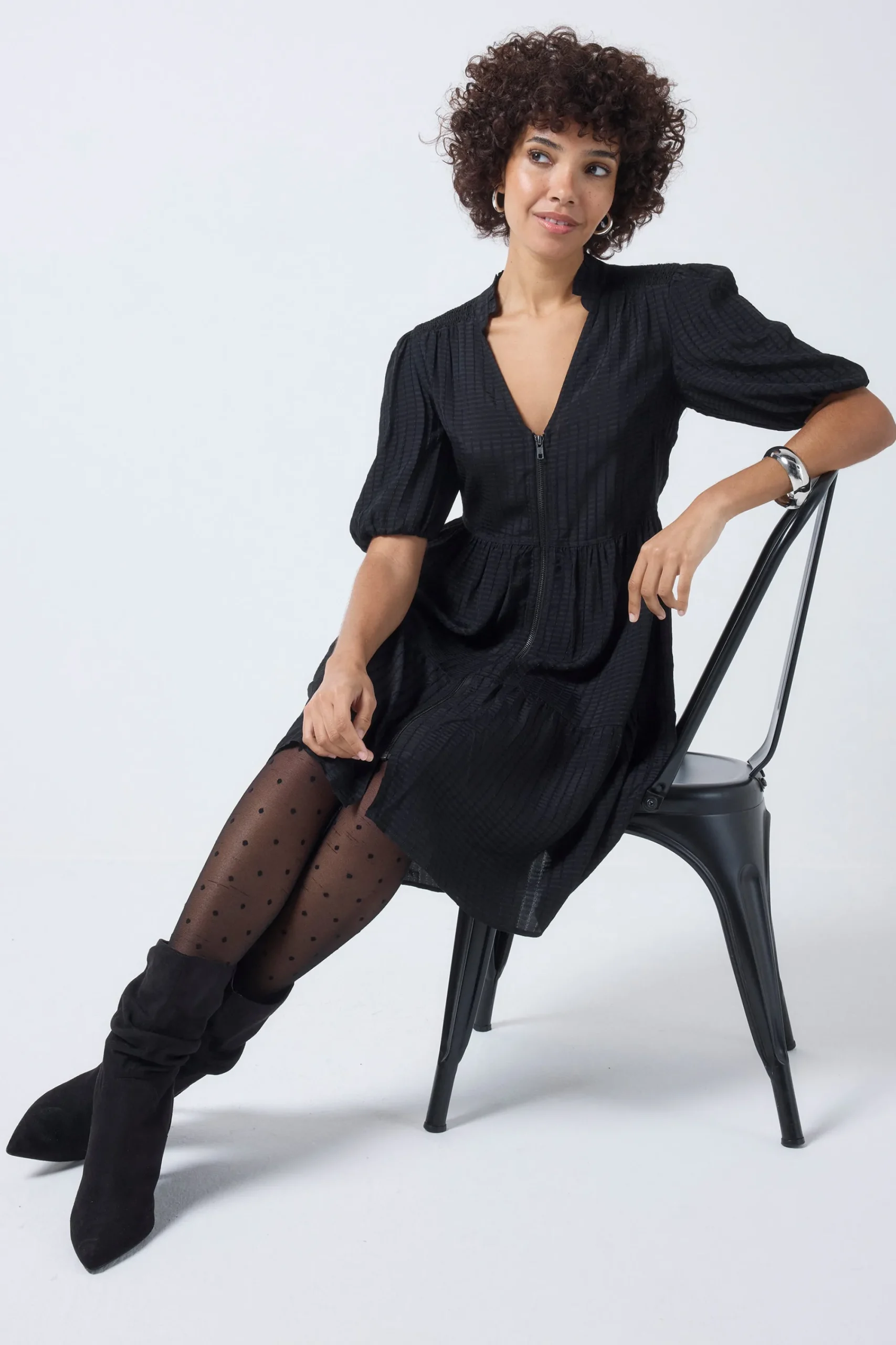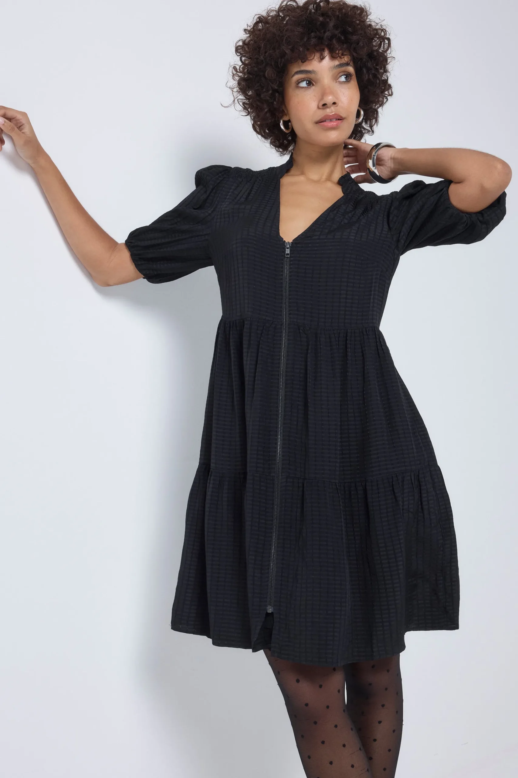 Crafted from soft viscose crepe this black zip detail tiered short dress is all about off-duty charm. It’s crafted with romantic short blouson sleeves, a smart v-neckline and a feature front zip fastening. For a flattering silhouette, the short length skirt fall in tiers in a flattering fit and flare style.