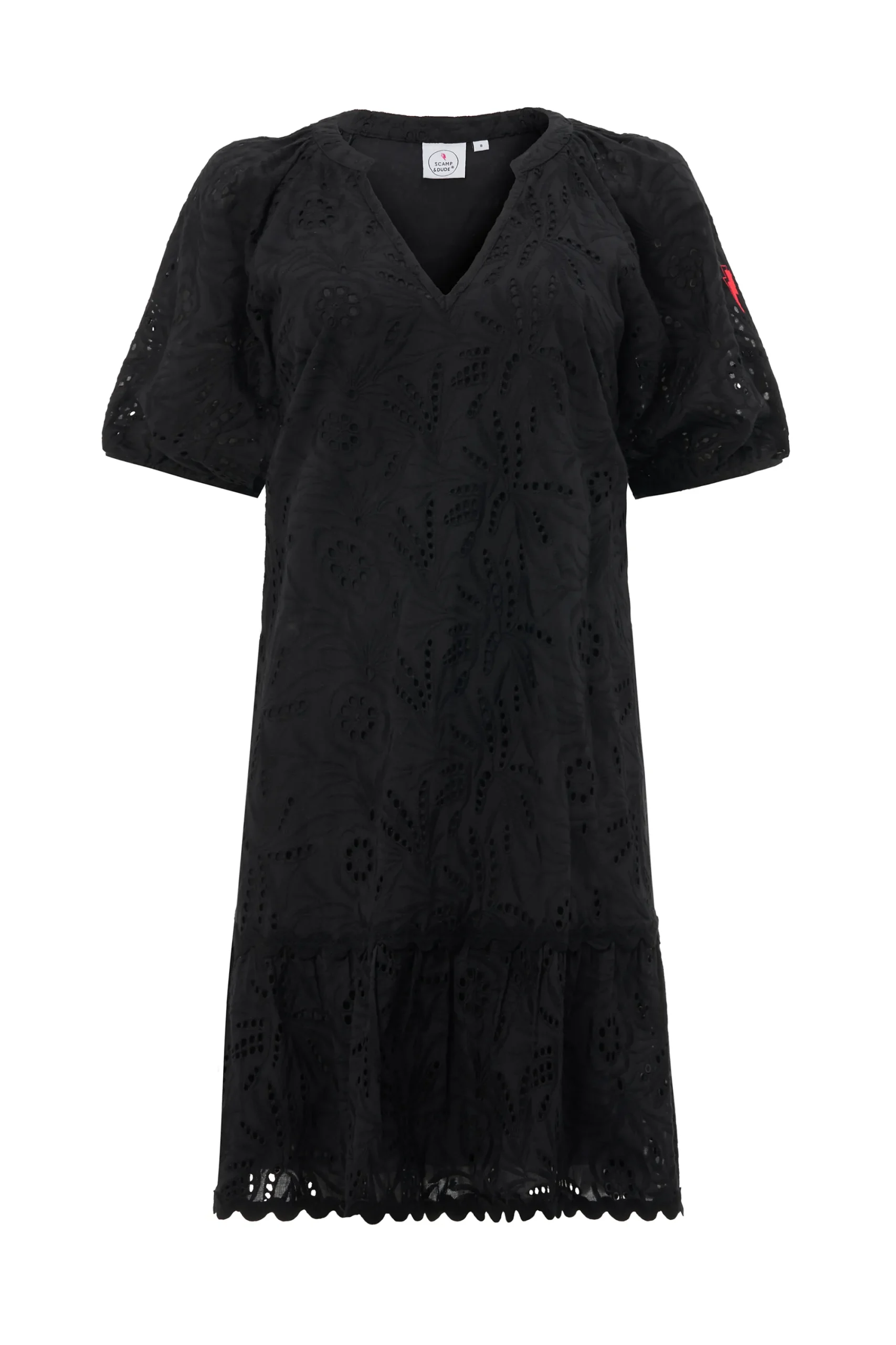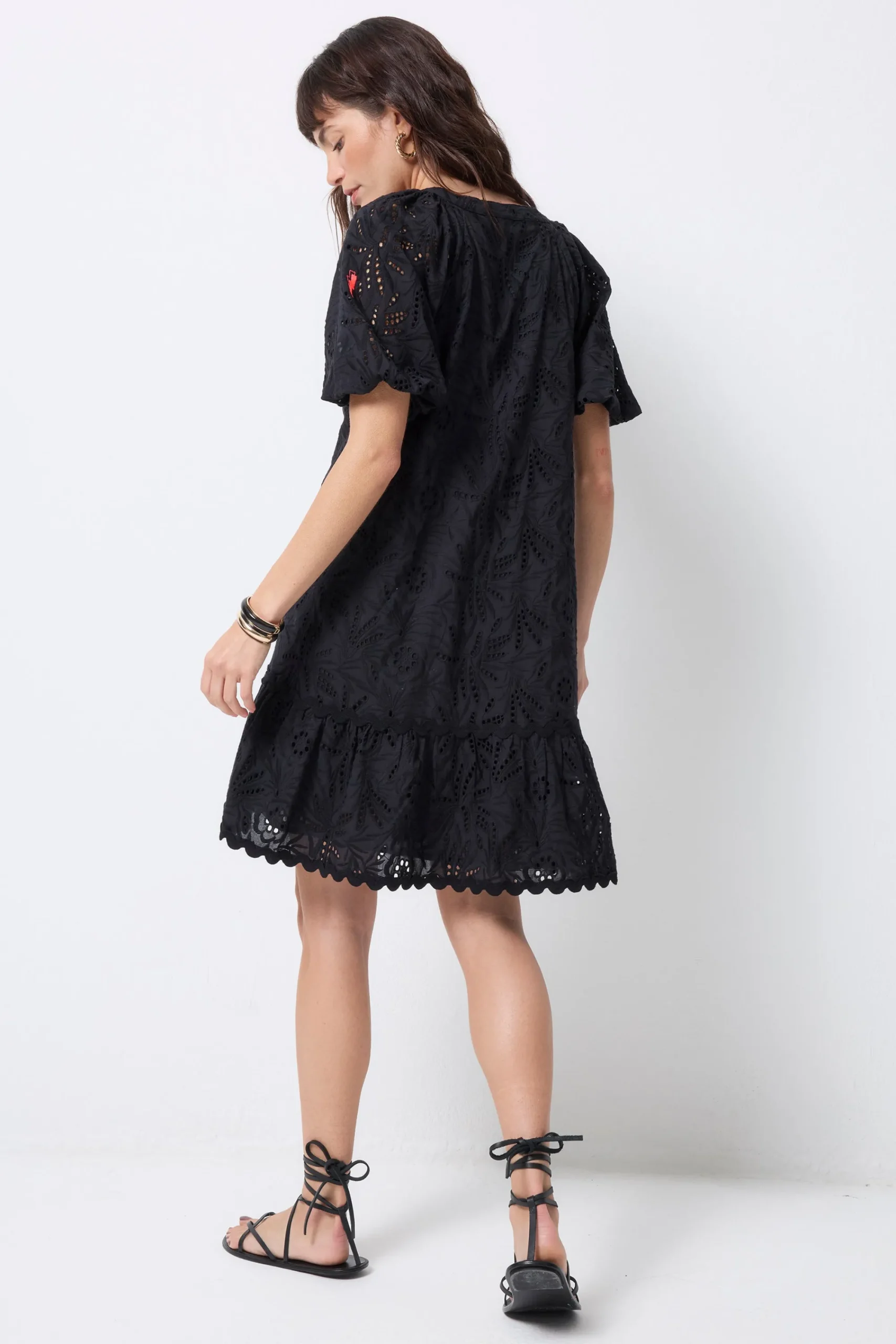 Crafted from soft cotton, this black broderie anglaise dress is all about romantic charm. Featuring blouson sleeves and a tiered hem, throw yours on with sandals and shades for a sunny day brunch.