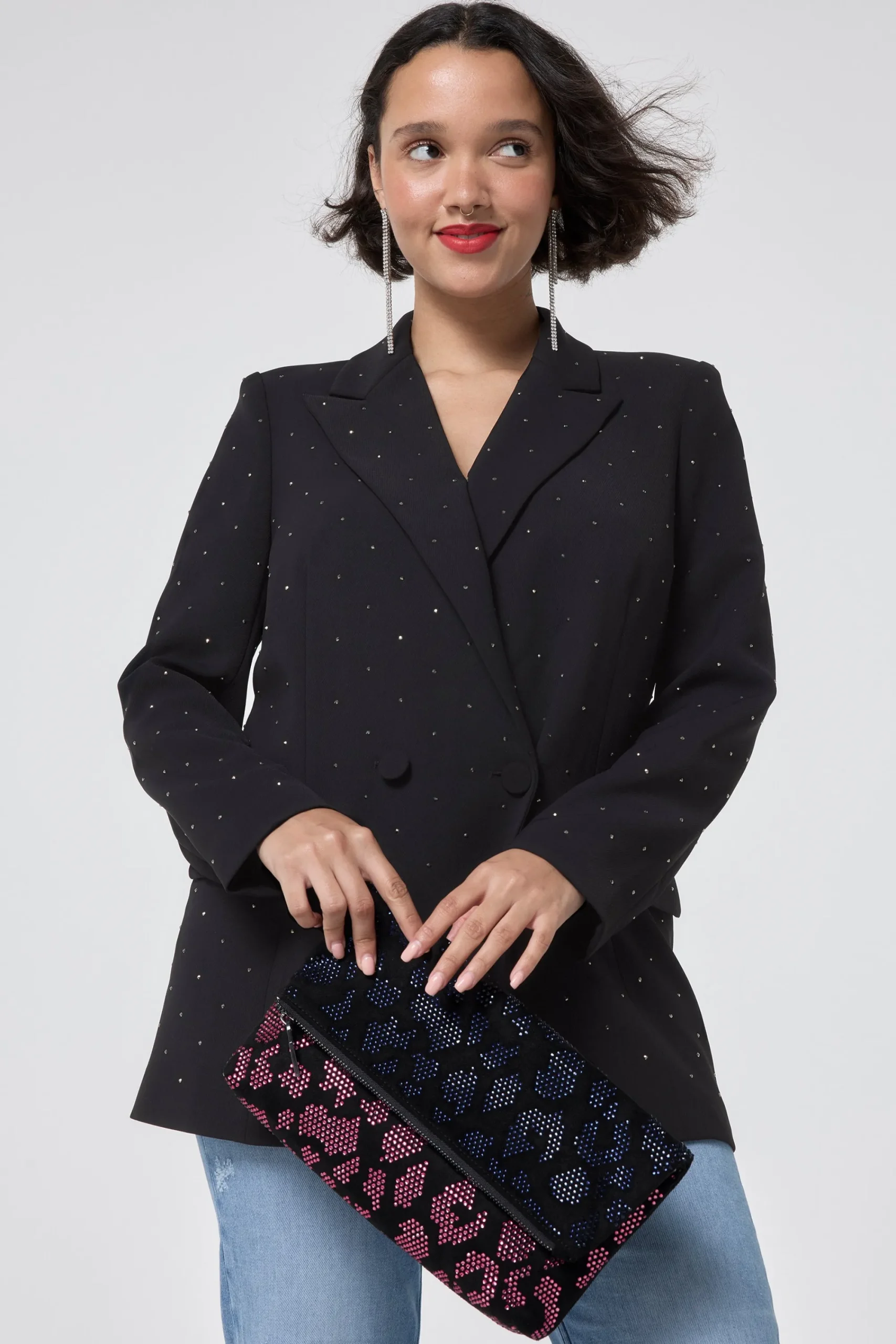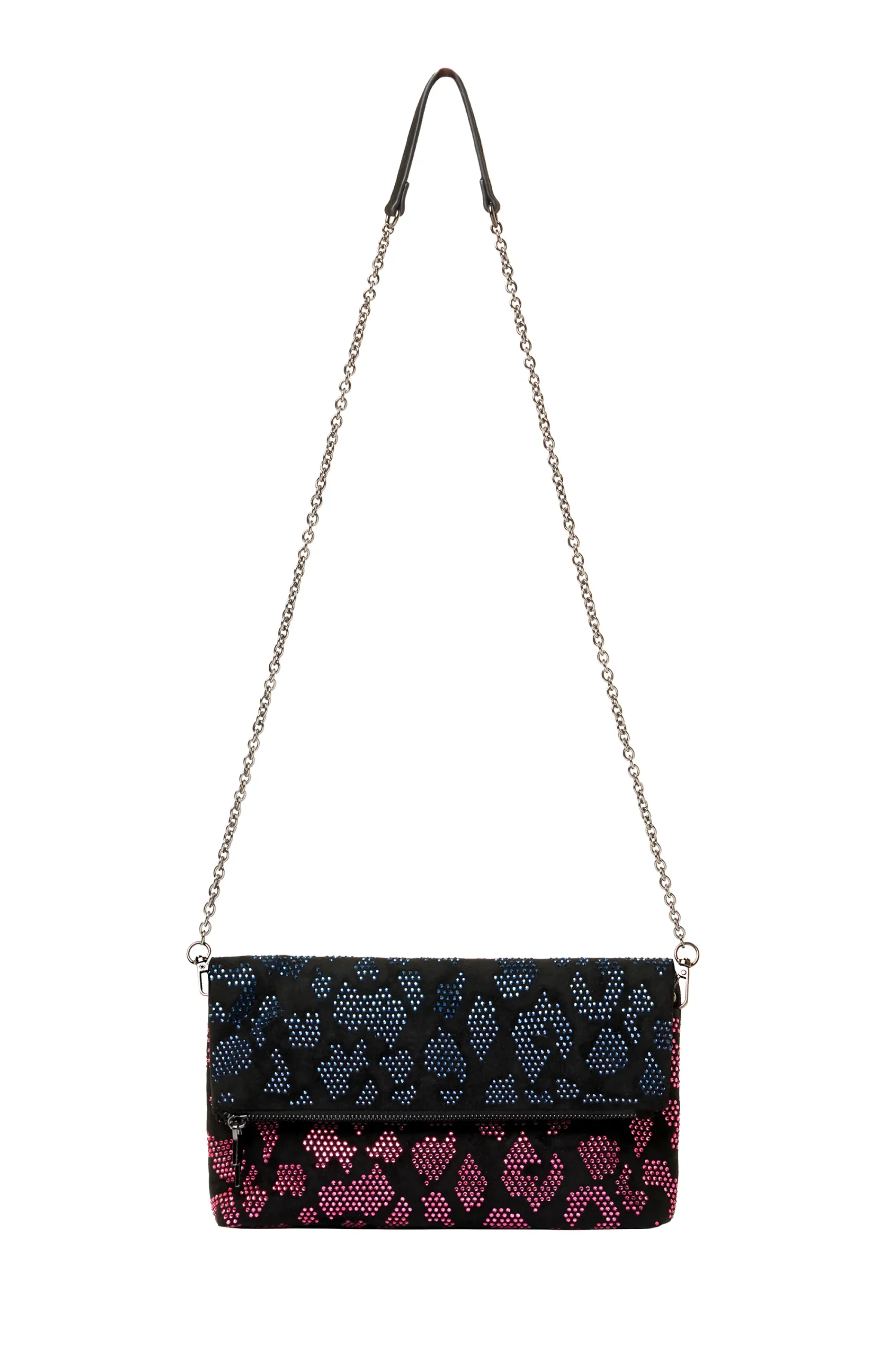 Secure, stylish and easy to wear. This black with blue and pink hot fix leopard cross body bag will complement your everyday wardrobe with ease. Ideally sized and spacious enough to store all your essentials, this sleek bag is detailed with gunmetal hardware and leopard print. Finished with a lightning bolt zip pull and chain cross body strap.
