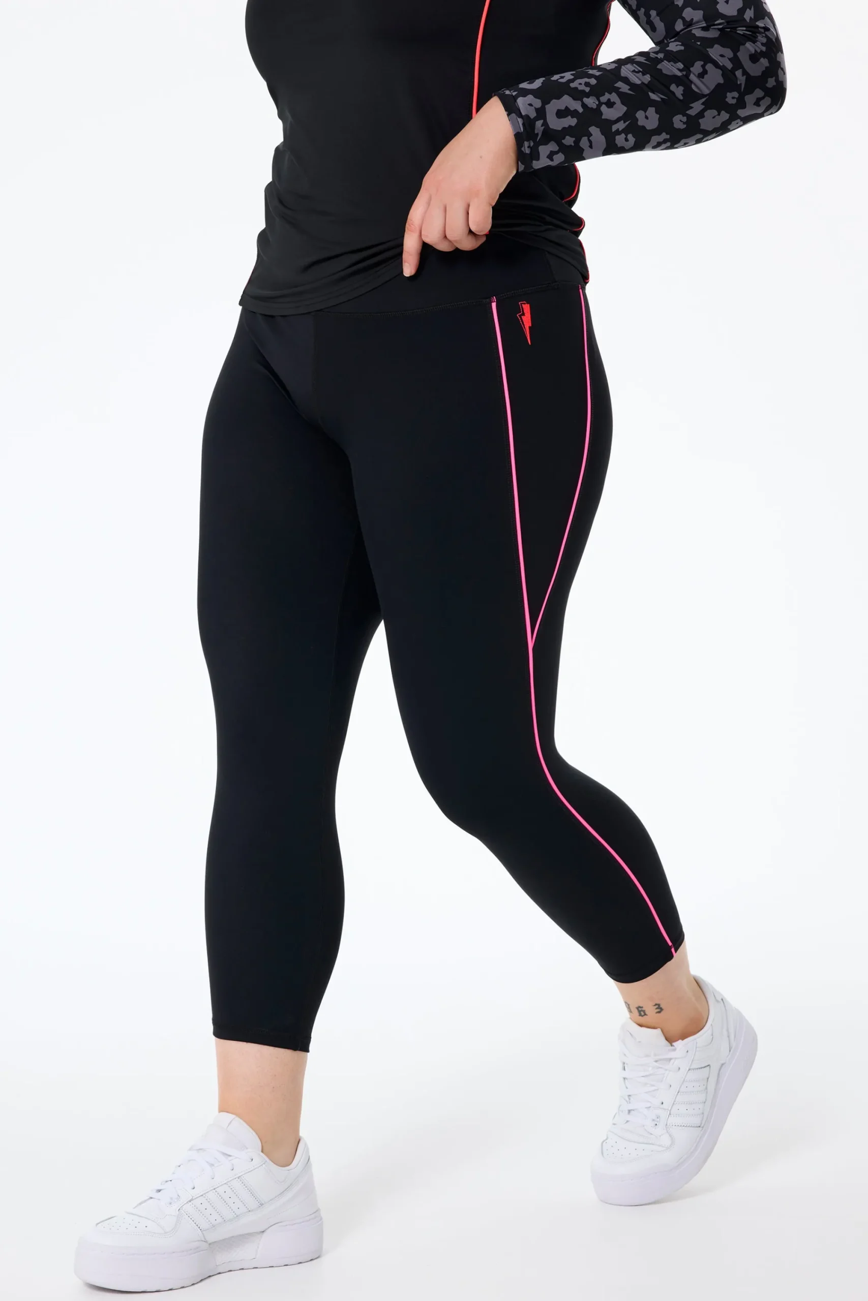 - Signature neon pink embroidered lightning bolt on the top hip
