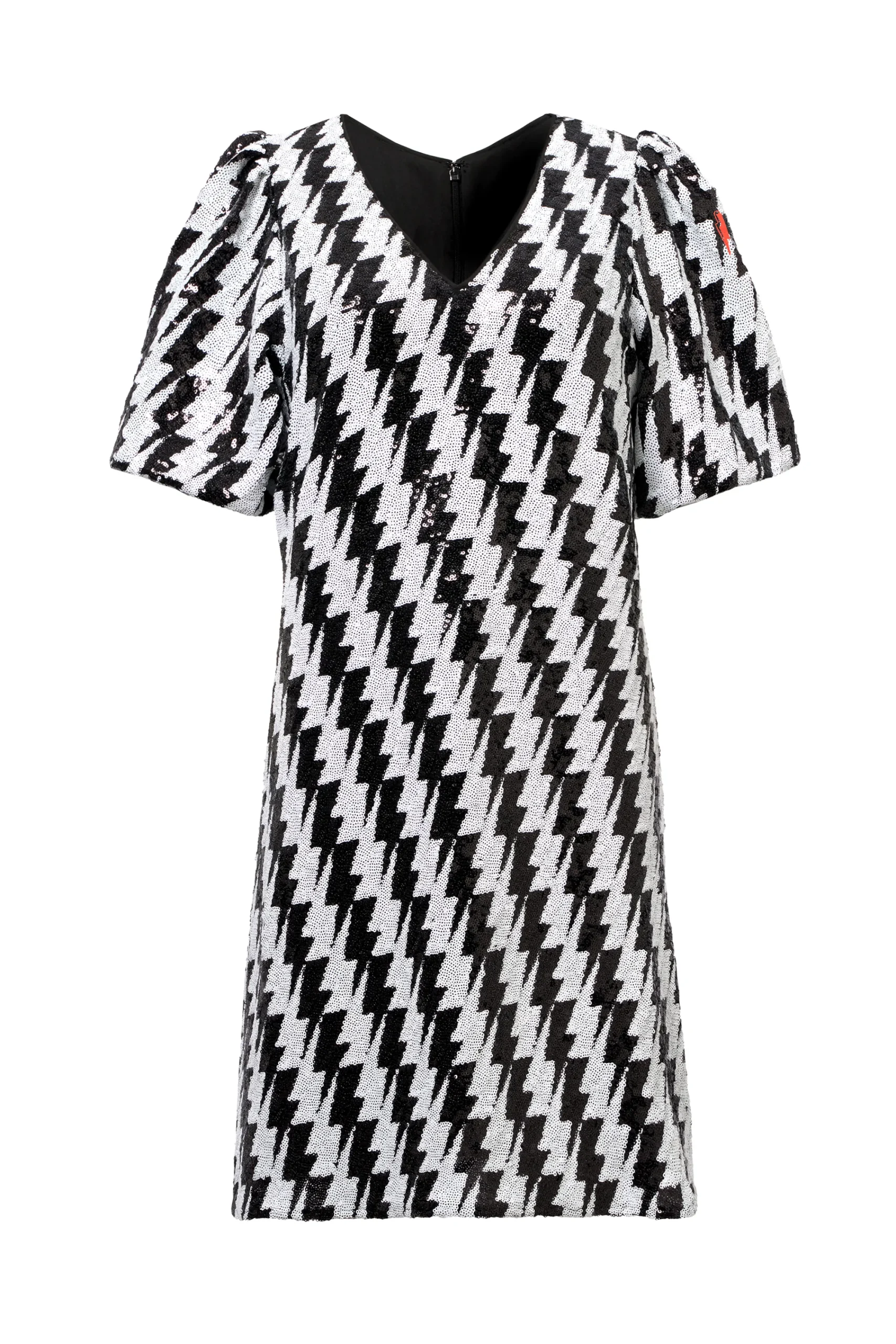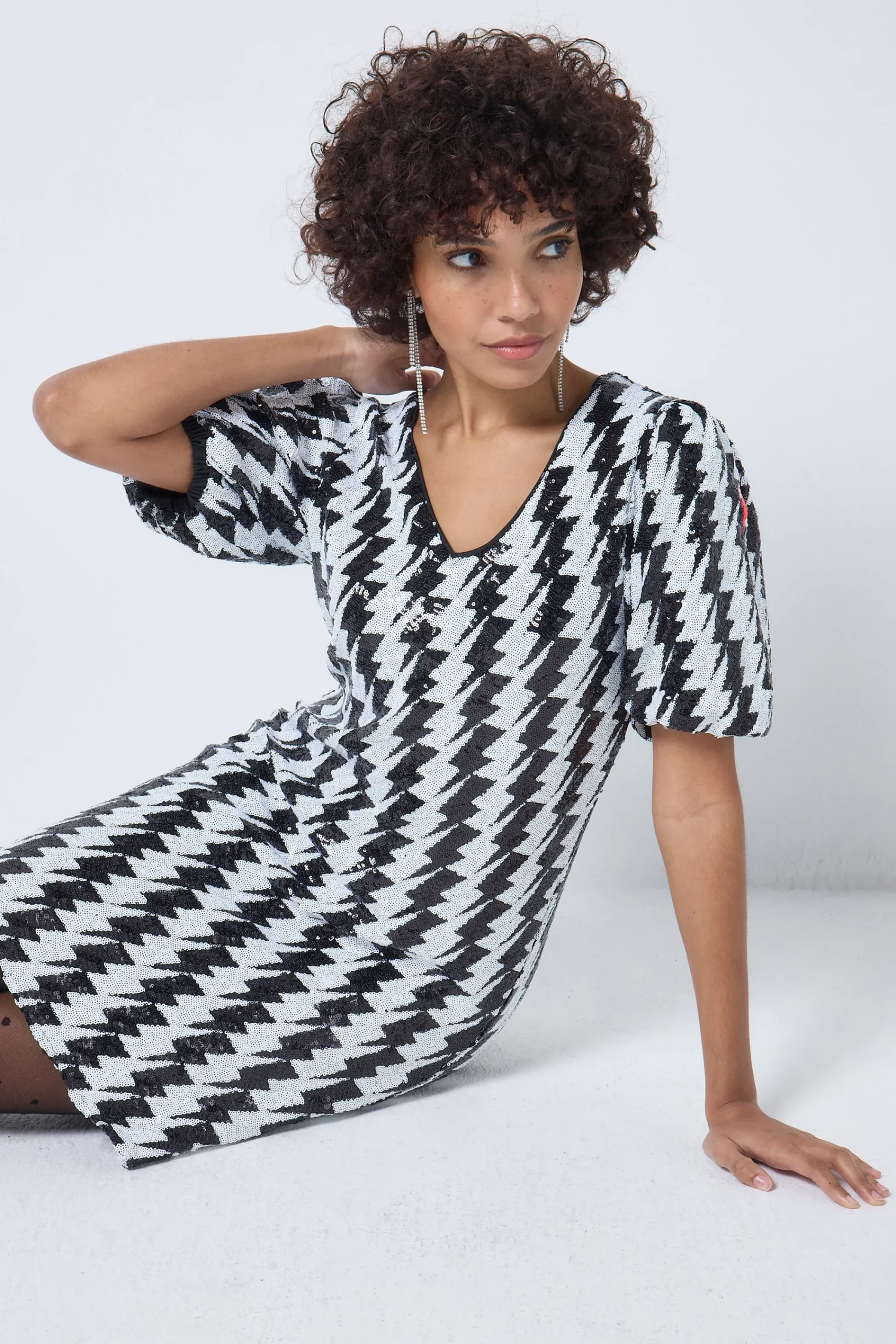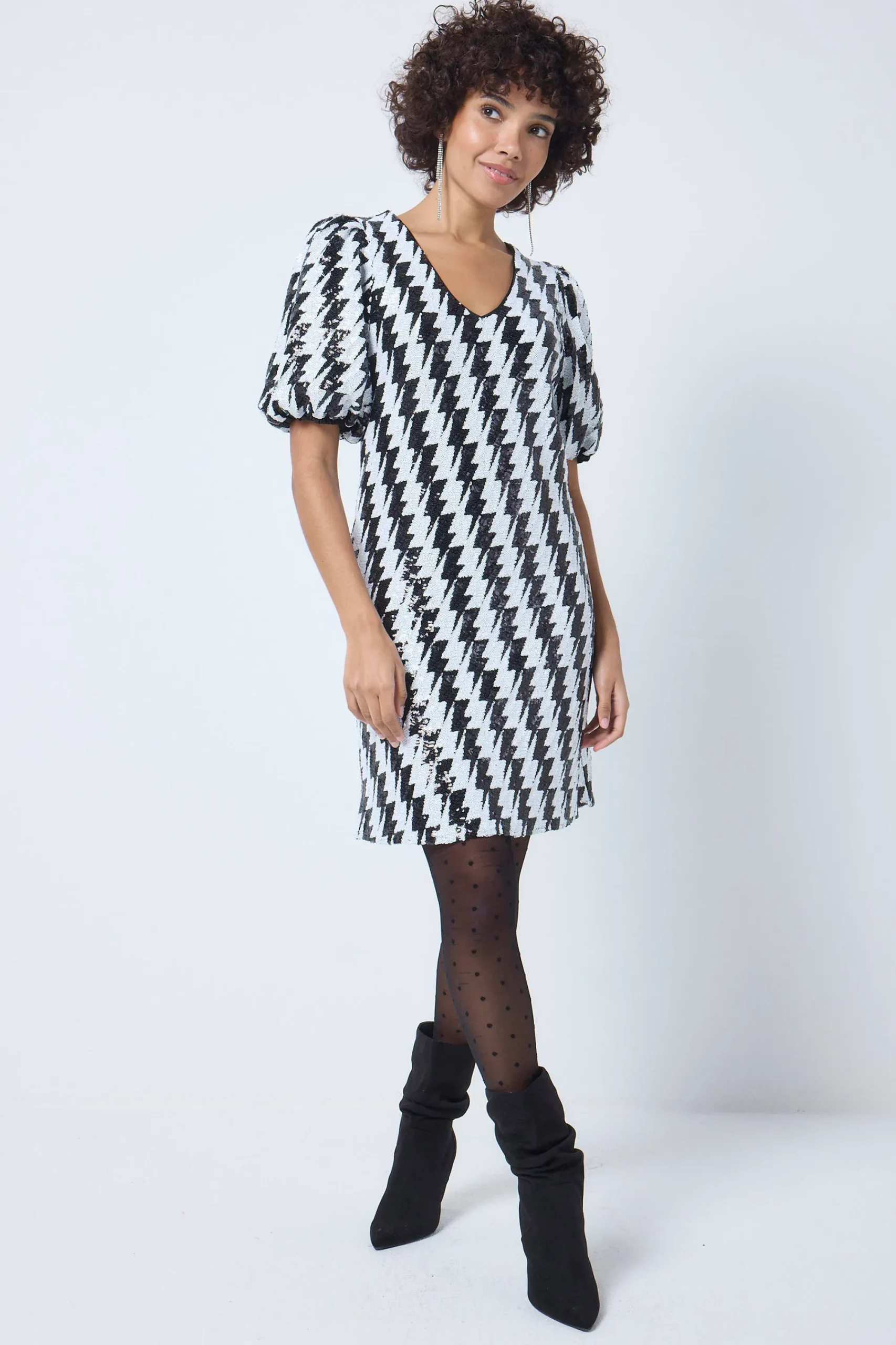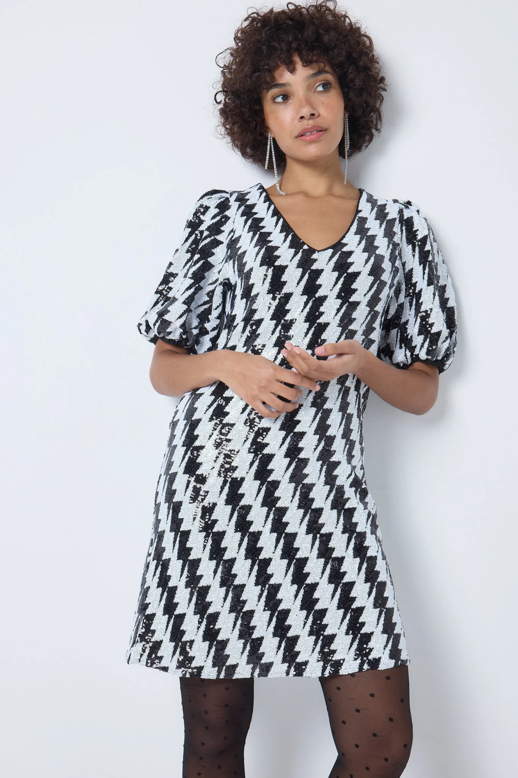 Elevate your style with our black with white lightning bolt sequin short v-neck dress, a fusion of comfort and glamour. The eye-catching dress is easy to slip on and lined with super soft viscose jersey. This isn’t just a dress, it’s a statement and perfect for partying day or night.