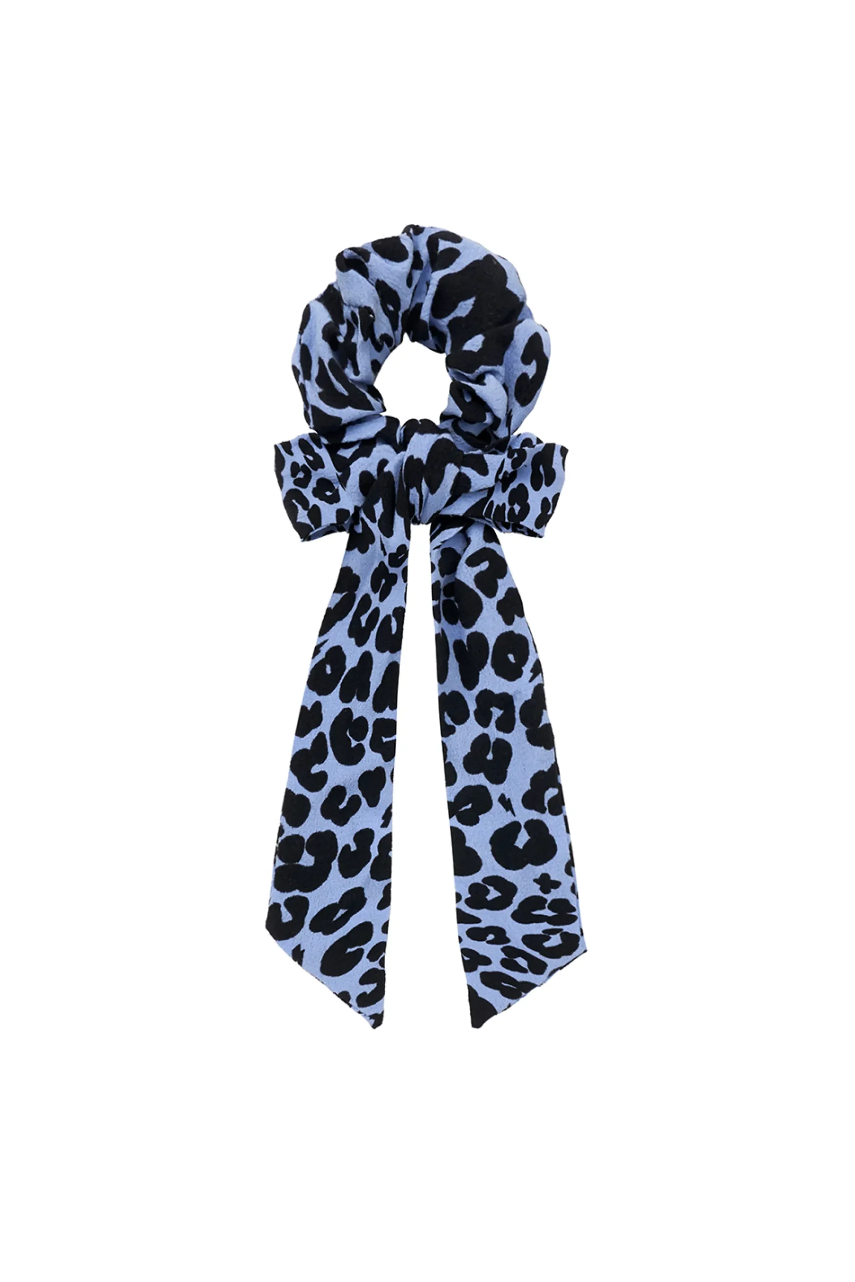- Blue bow scrunchie in with black floral, leopard and lightning bolt print