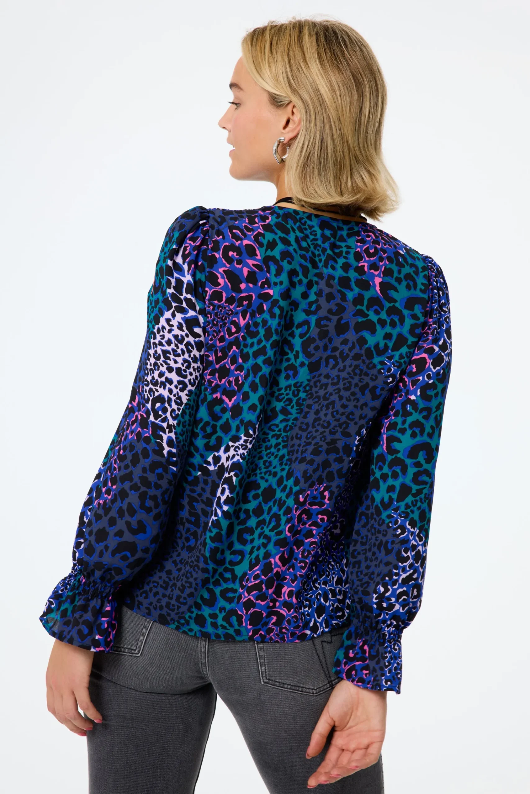 Flattering and feminine, our blue with green spliced leopard and lightning bolt print flute sleeve blouse looks great styled with your favourite Scamp & Dude denim. It’s made from recycled polyester which makes the blouse incredibly soft and comfortable, perfect for all-day wear.