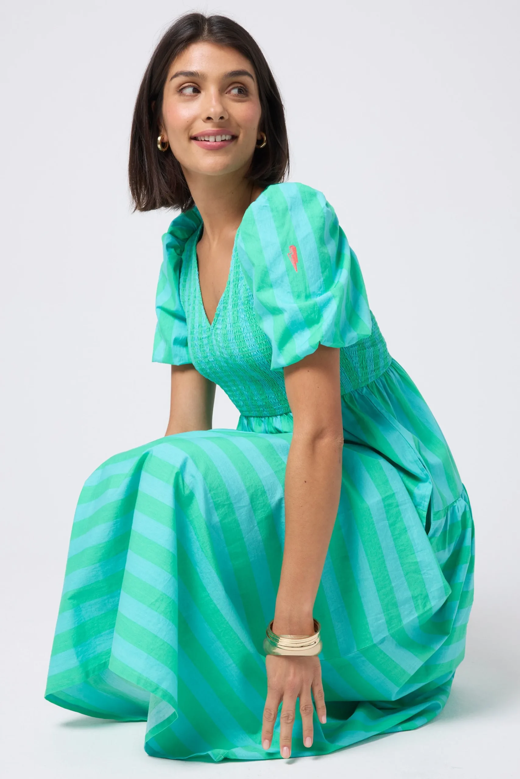 A timeless addition to your wardrobe, our blue with green stripe maxi dress was designed to impress. With short puffed sleeves, a tiered skirt and vintage-inspired shirred bust detailing, it’s definitely a need – not a want.