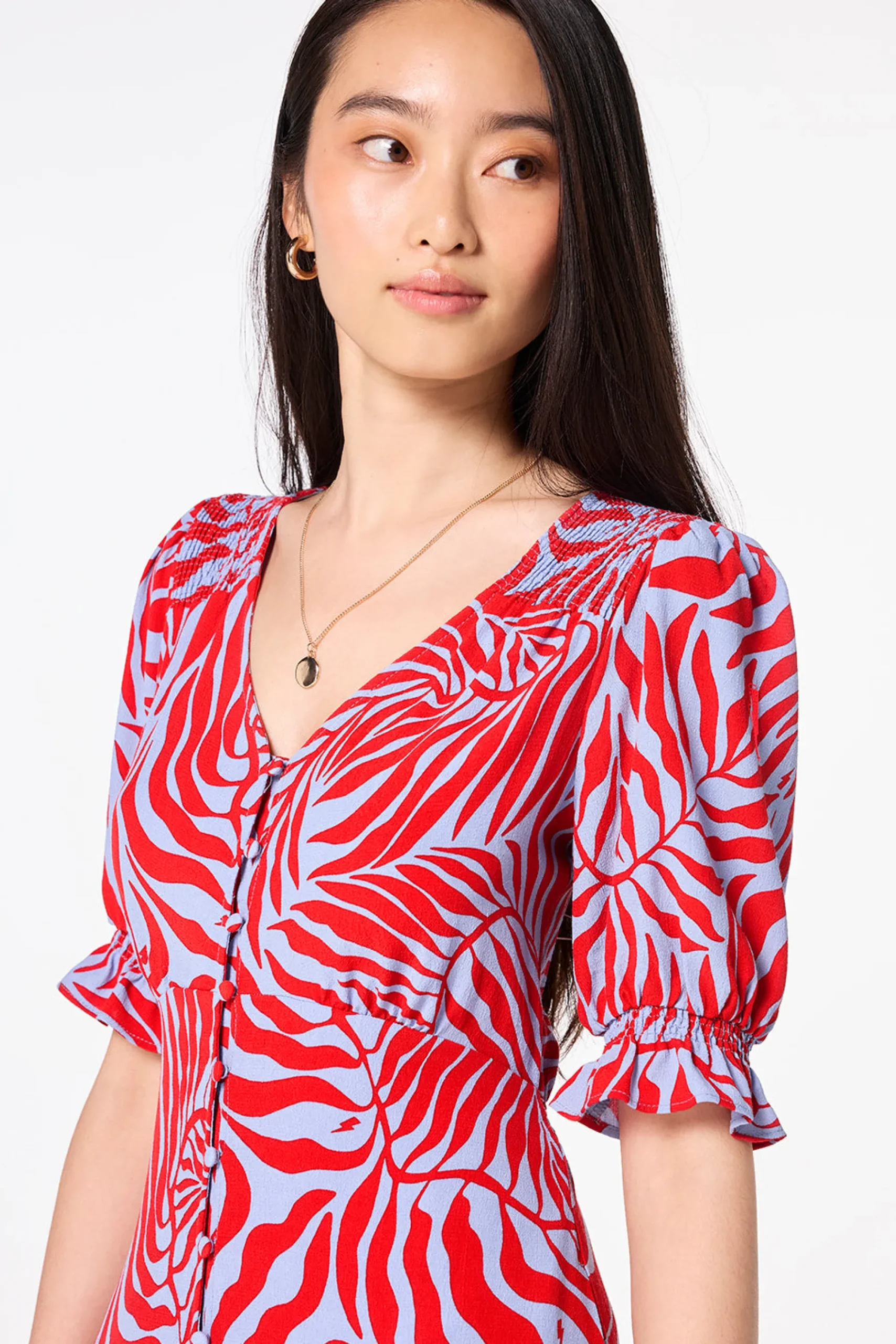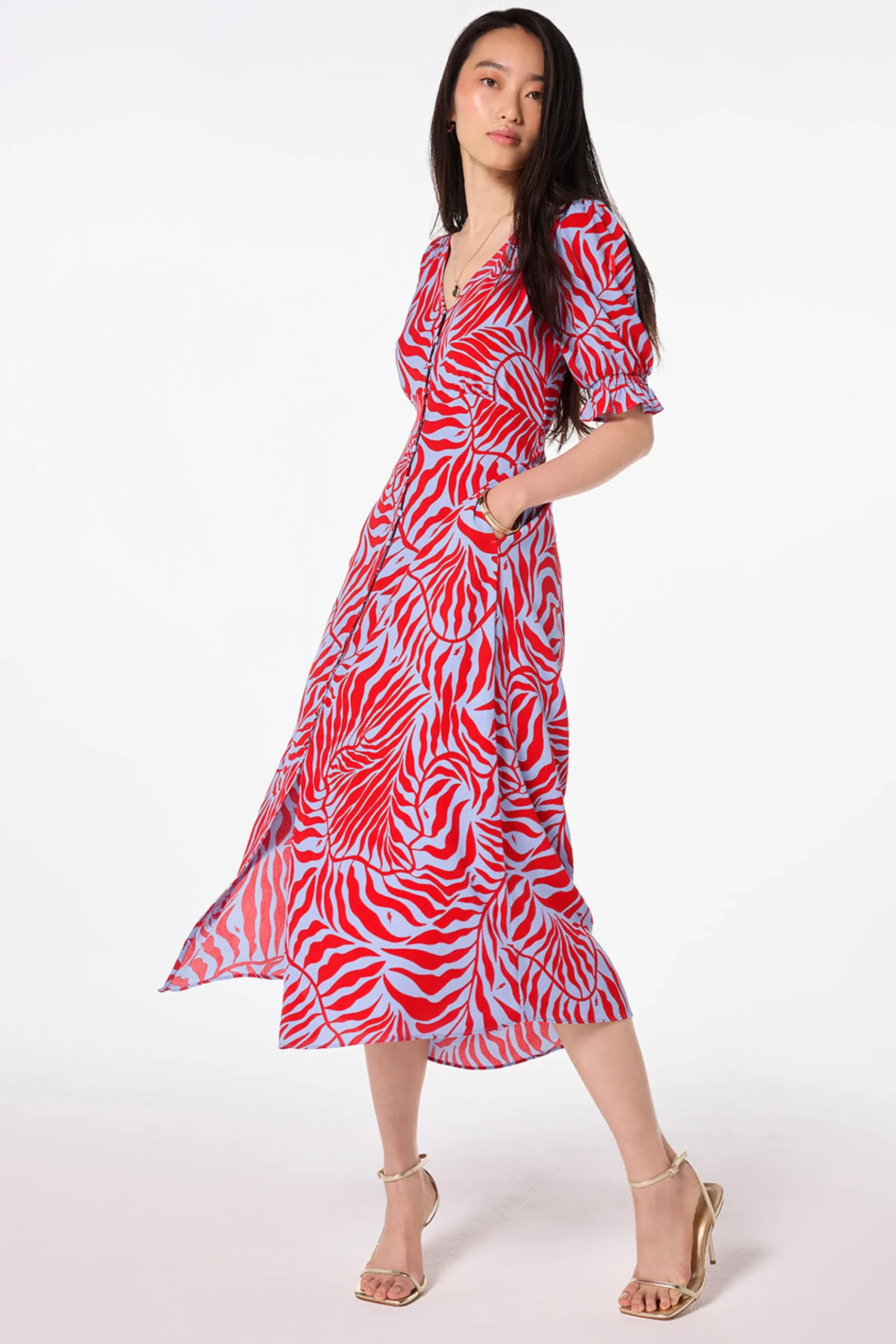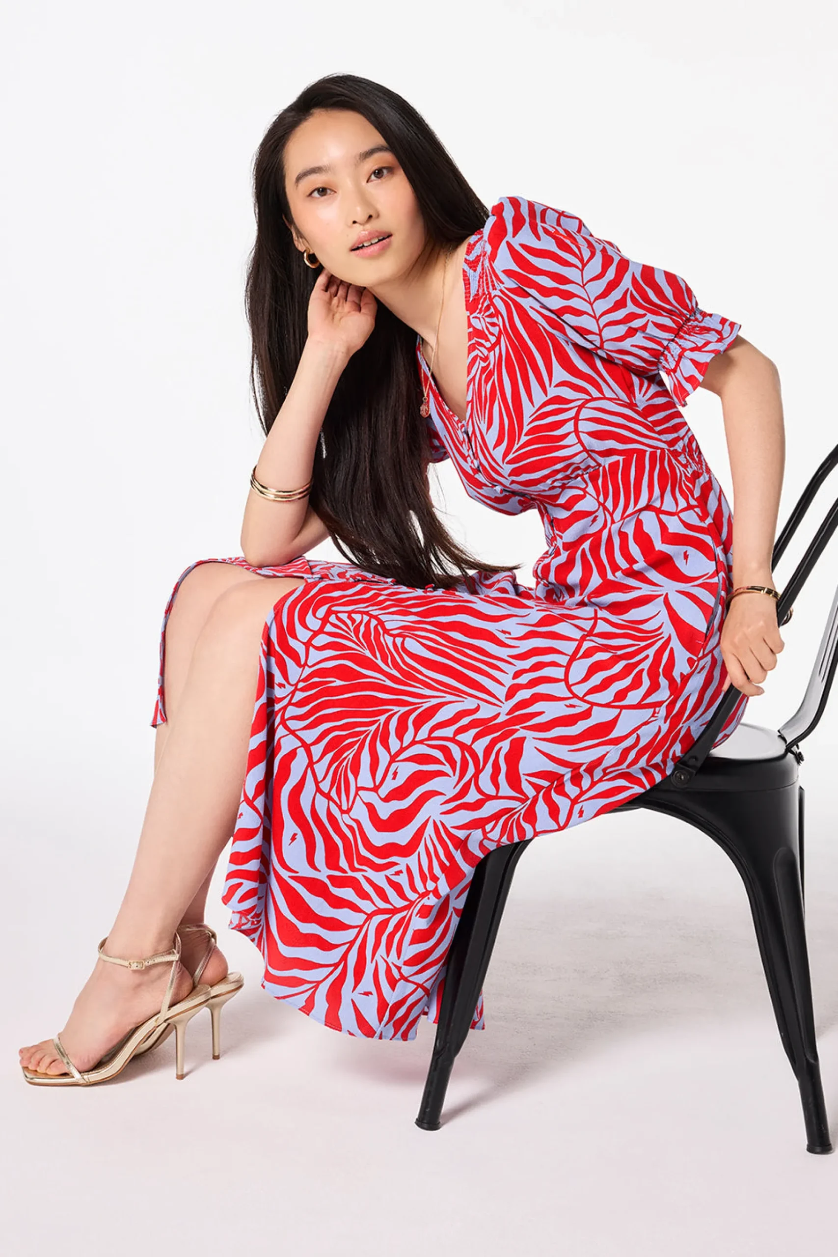 Bold and beautiful, this blue with red palm and lightning bolt flute sleeve midi tea dress will make a joyful addition to your wardrobe. Made in a soft viscose crepe fabric, this versatile midi-length dress features a timeless V-neck. Effortlessly flattering, it is one you’ll reach for on relaxed days with friends.