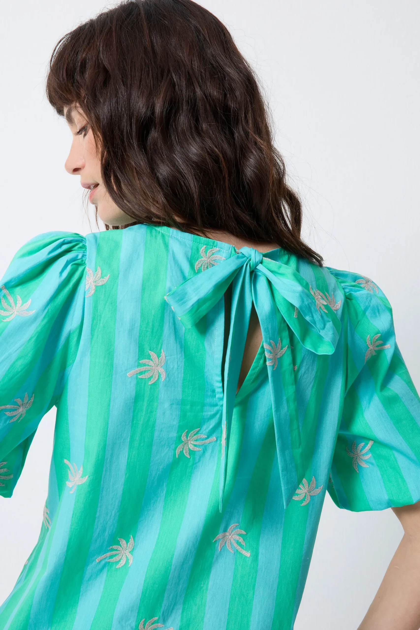 Jeans and a nice top’ just got an upgrade. Made from super-soft cotton with a statement tie at the back, our stripe with palm embroidery top is the perfect conversation starter (mostly, “where did you get that?”).