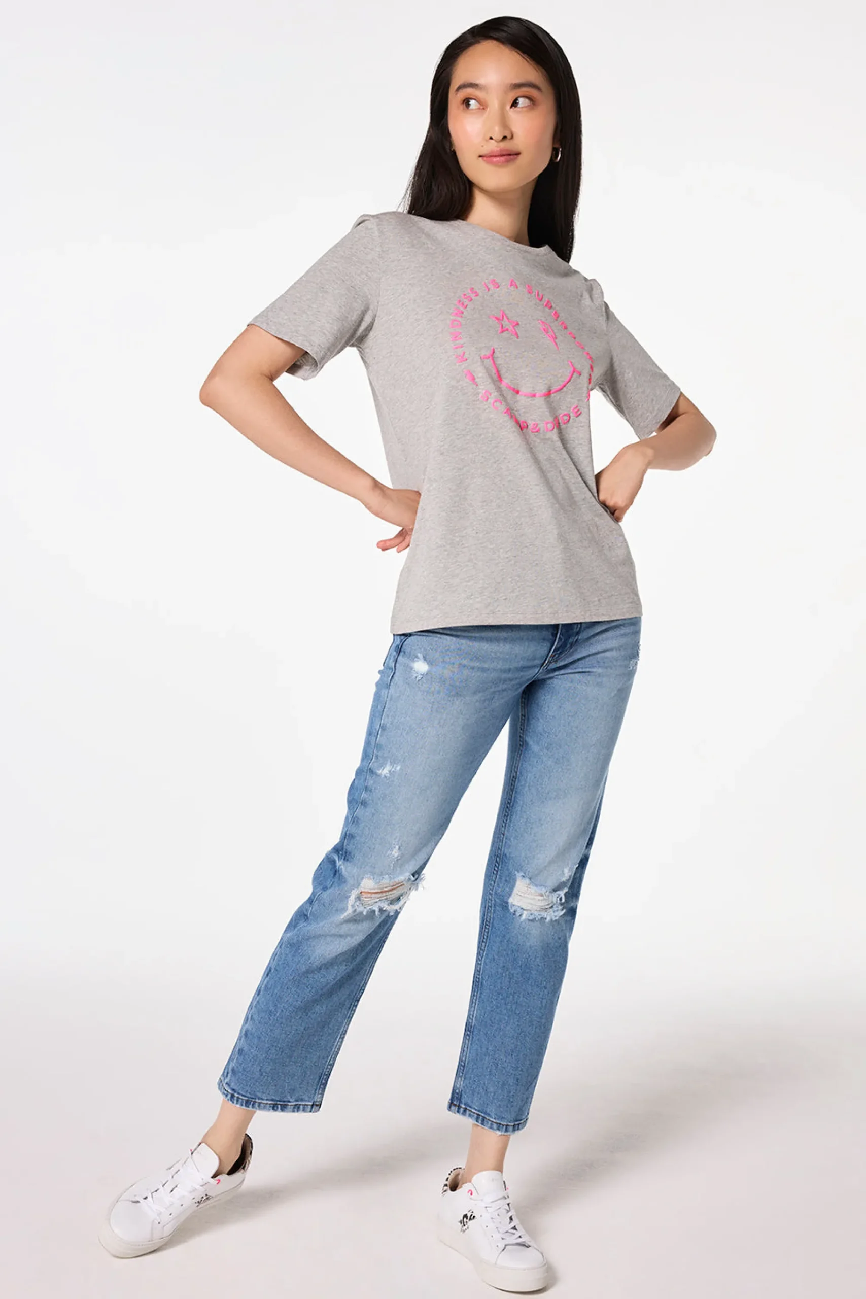 Our grey marl T-shirt with pink smiley face on the front will become your off-duty staple. It’s stylish, comfy and filled with superpowers. Complete the look with a pair of flattering Scamp & Dude jeans.