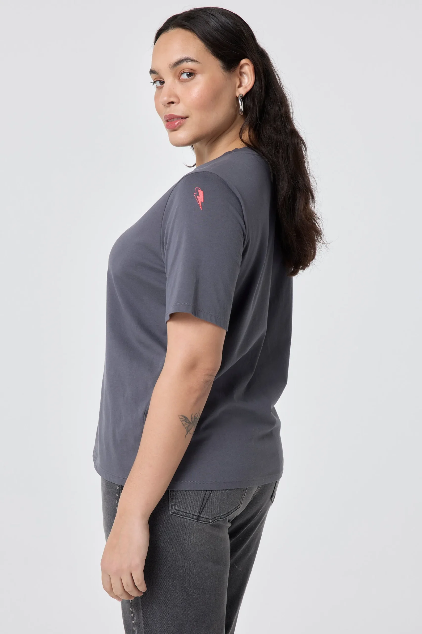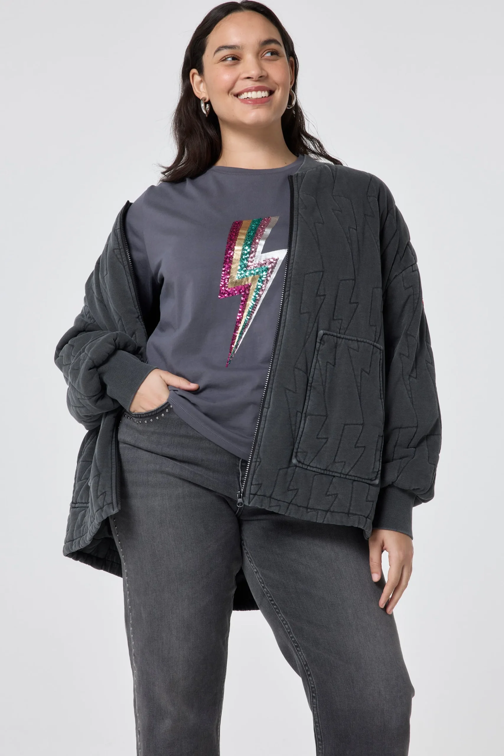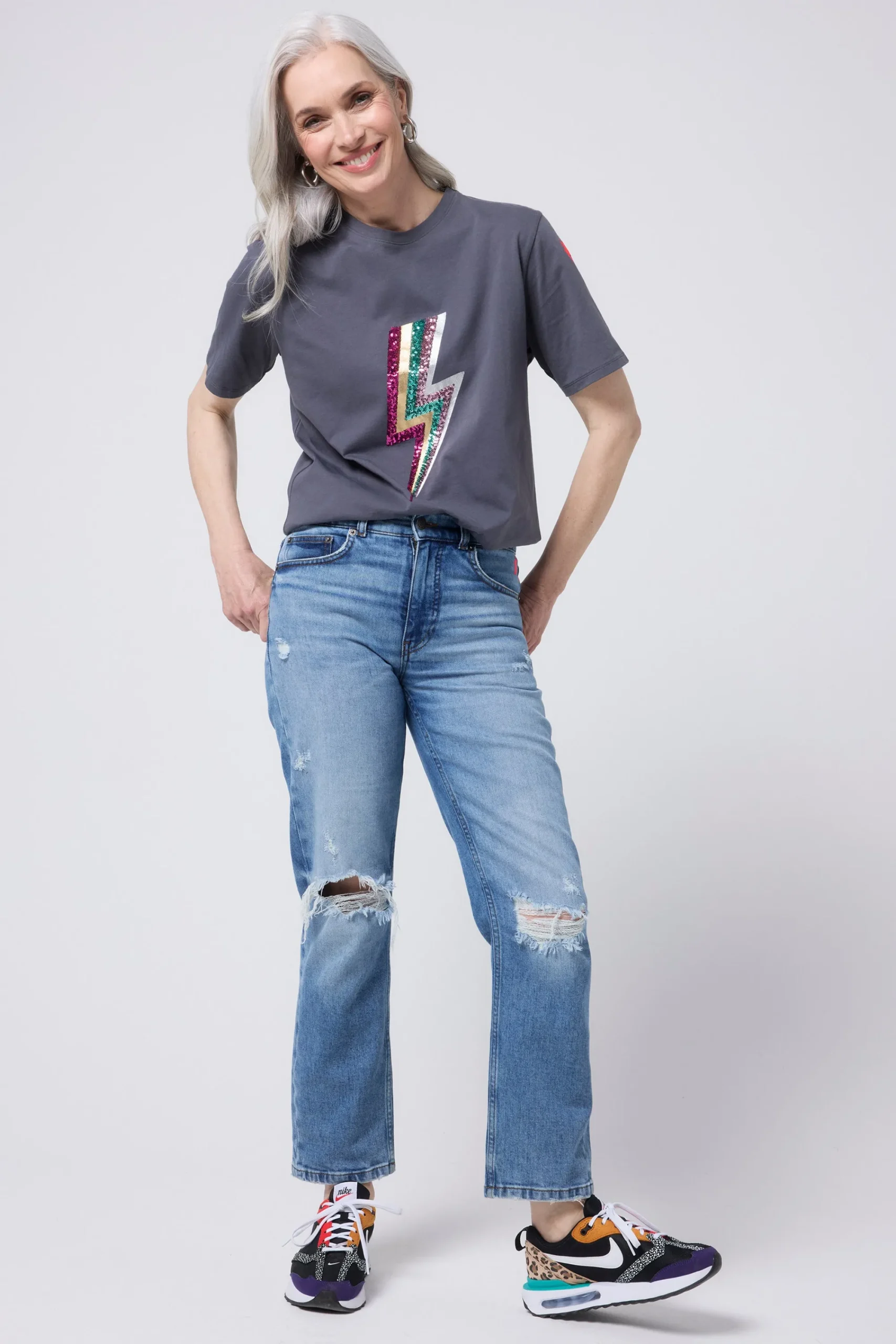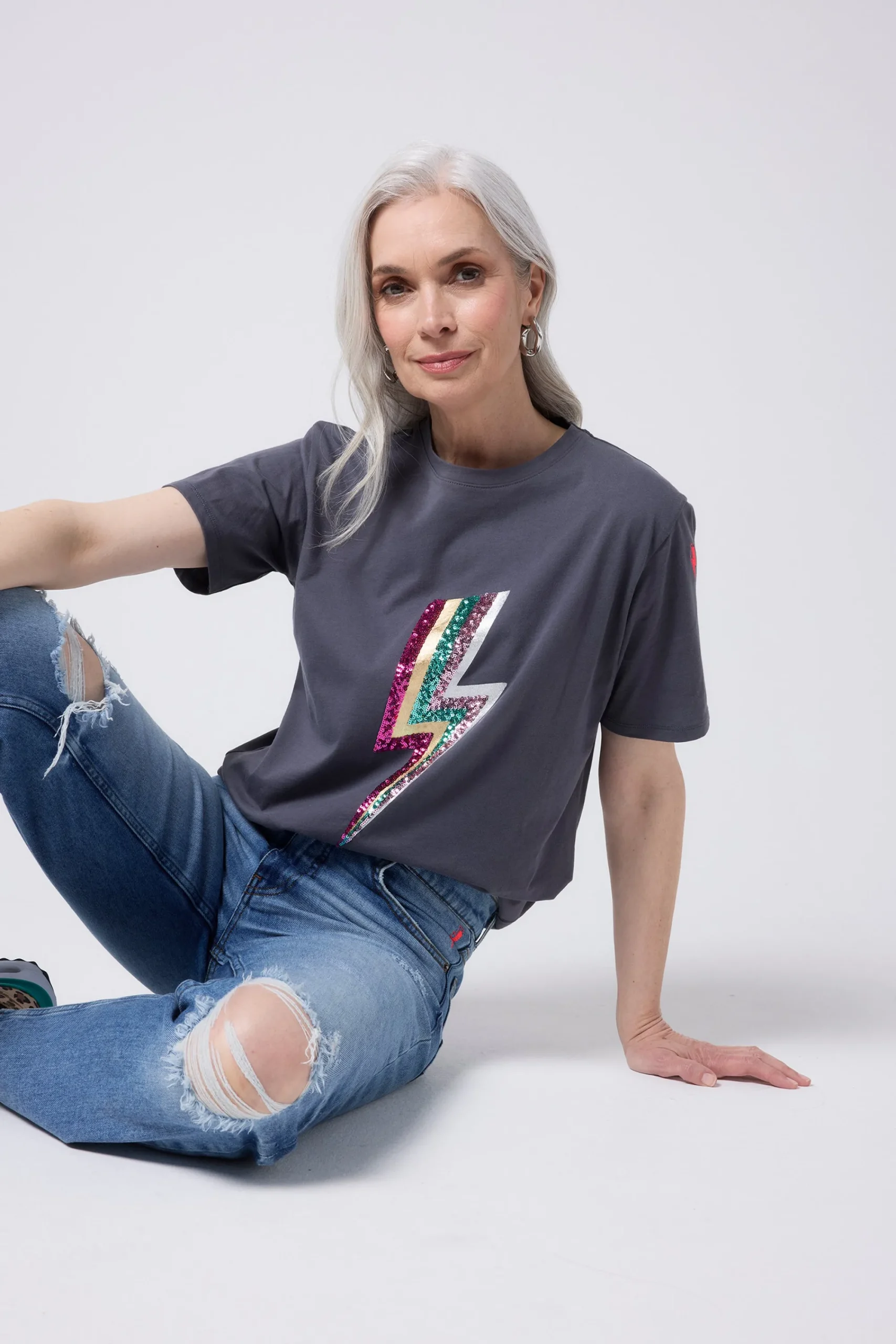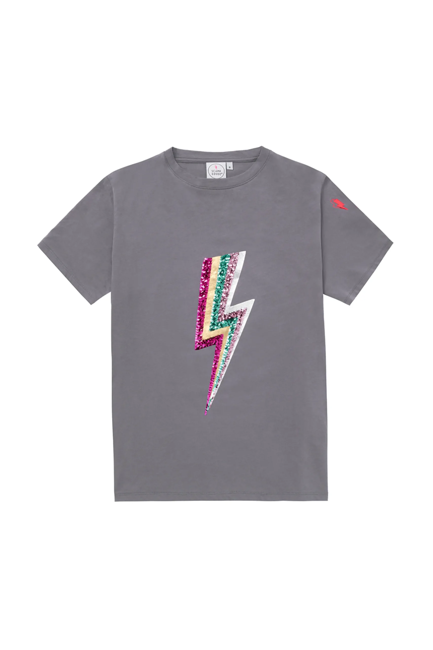 Our grey T-shirt with multi coloured sequin and foil lightning bolt on the front will become your off-duty staple. It’s stylish, comfy and filled with superpowers. Complete the look with a pair of flattering Scamp & Dude jeans.