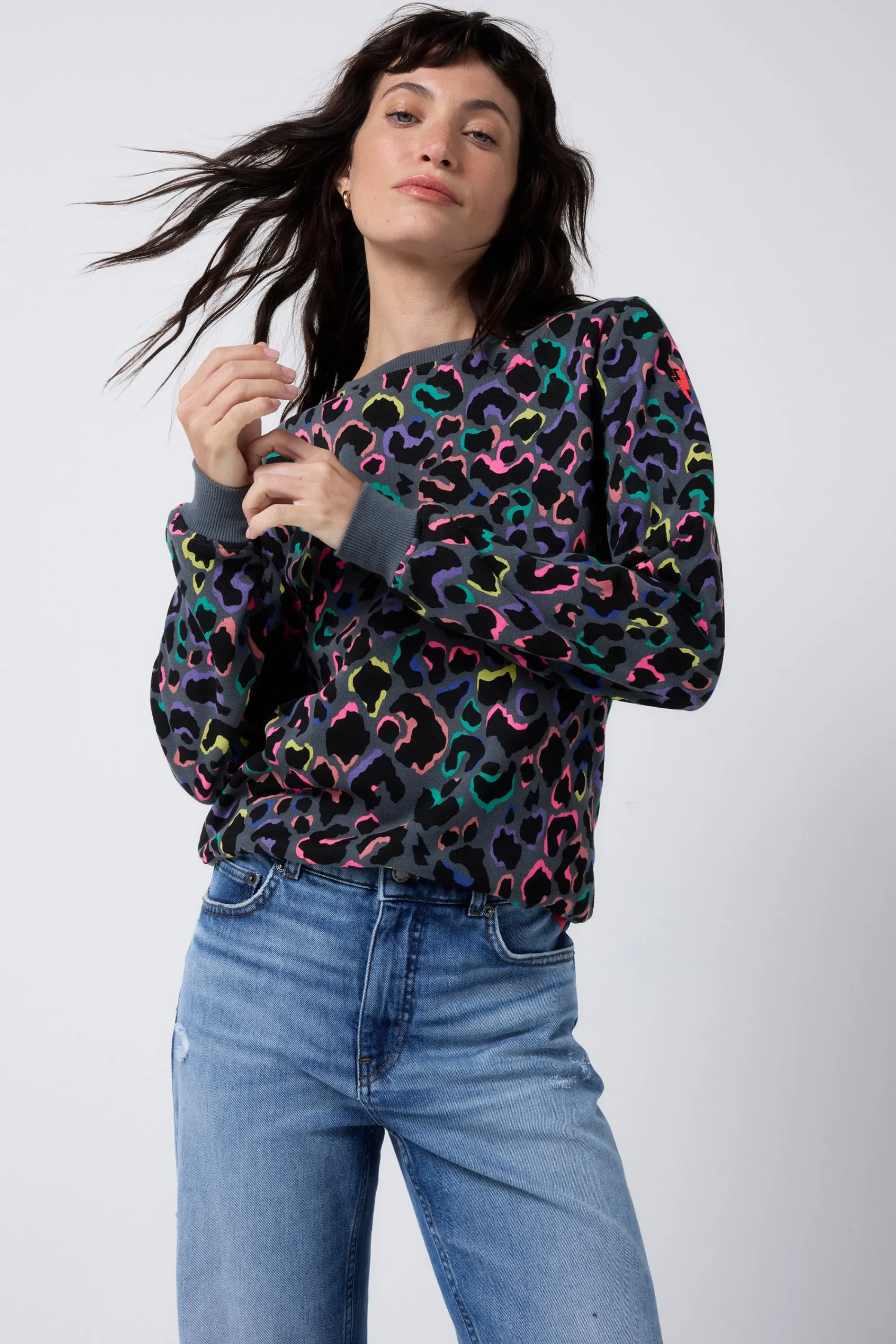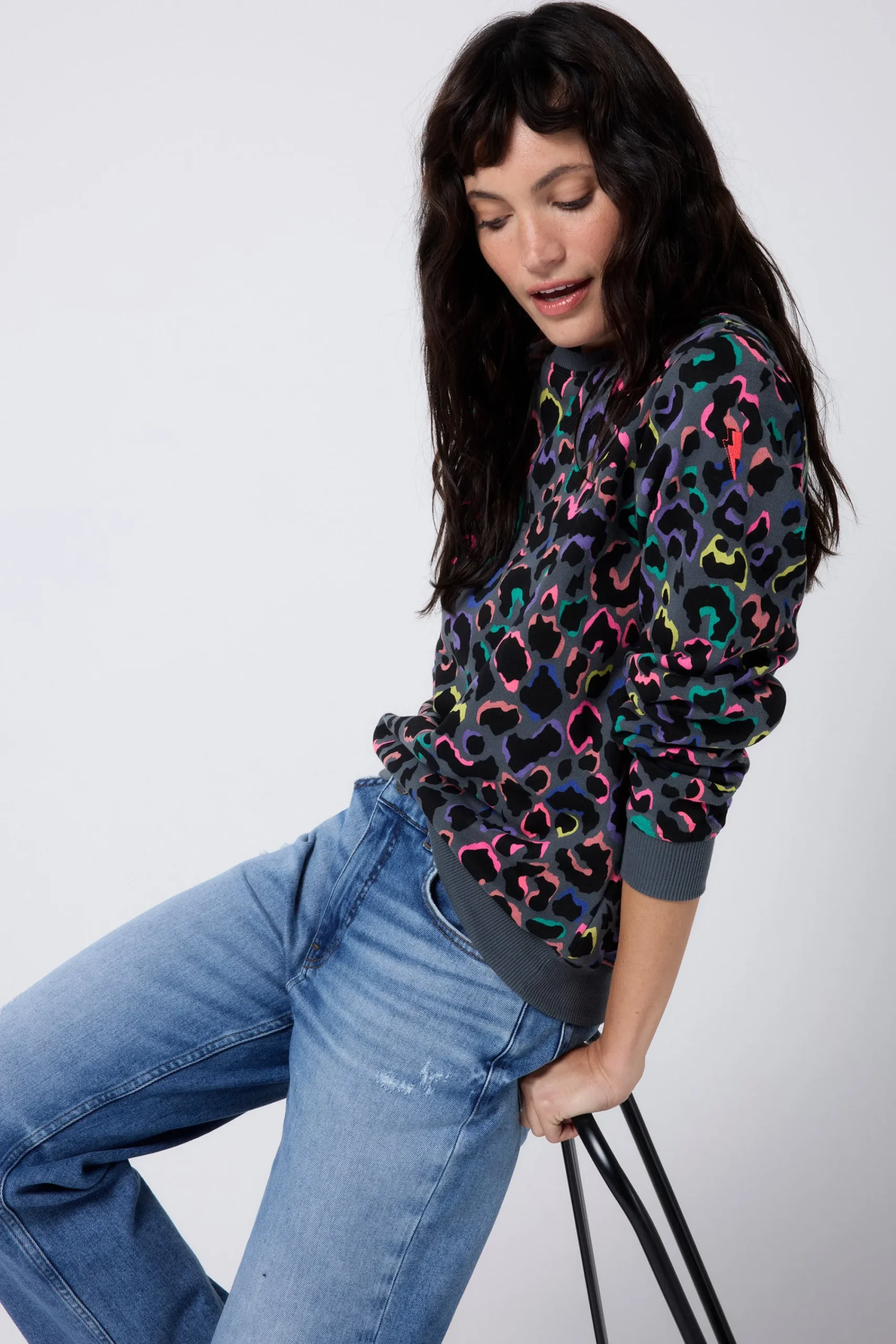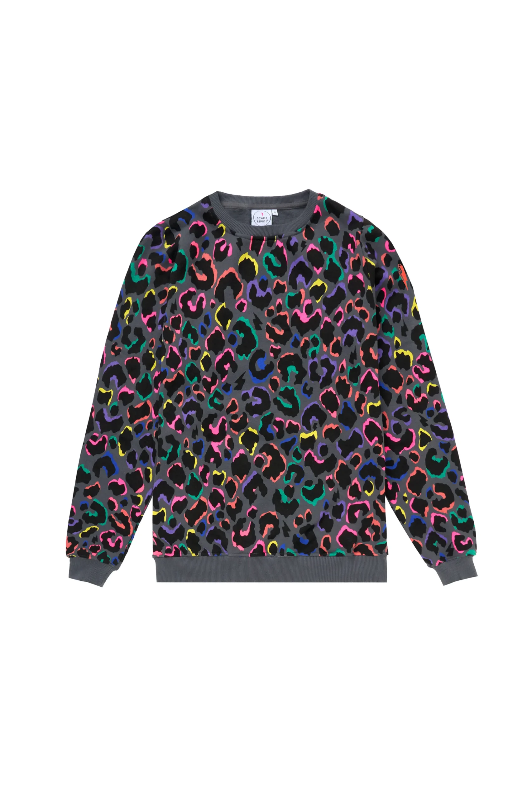 Amp up your casual collection with this grey with rainbow shadow leopard and lightning bolt print classic sweatshirt. The eye-catching design is bound to draw attention wherever you go.