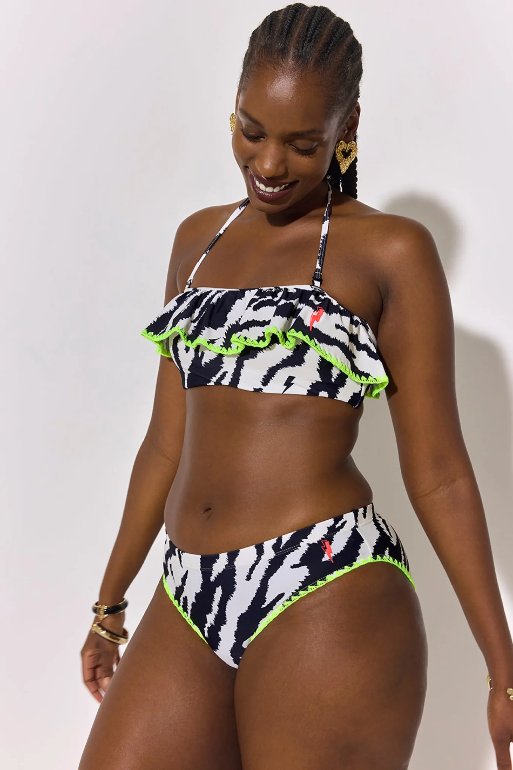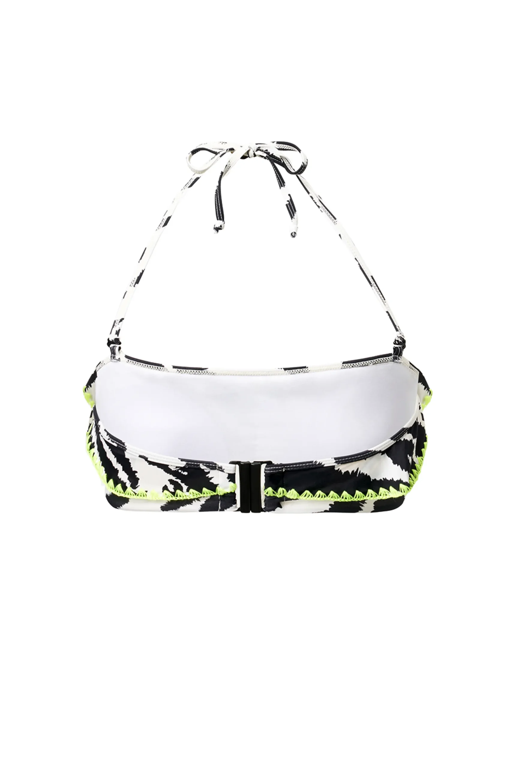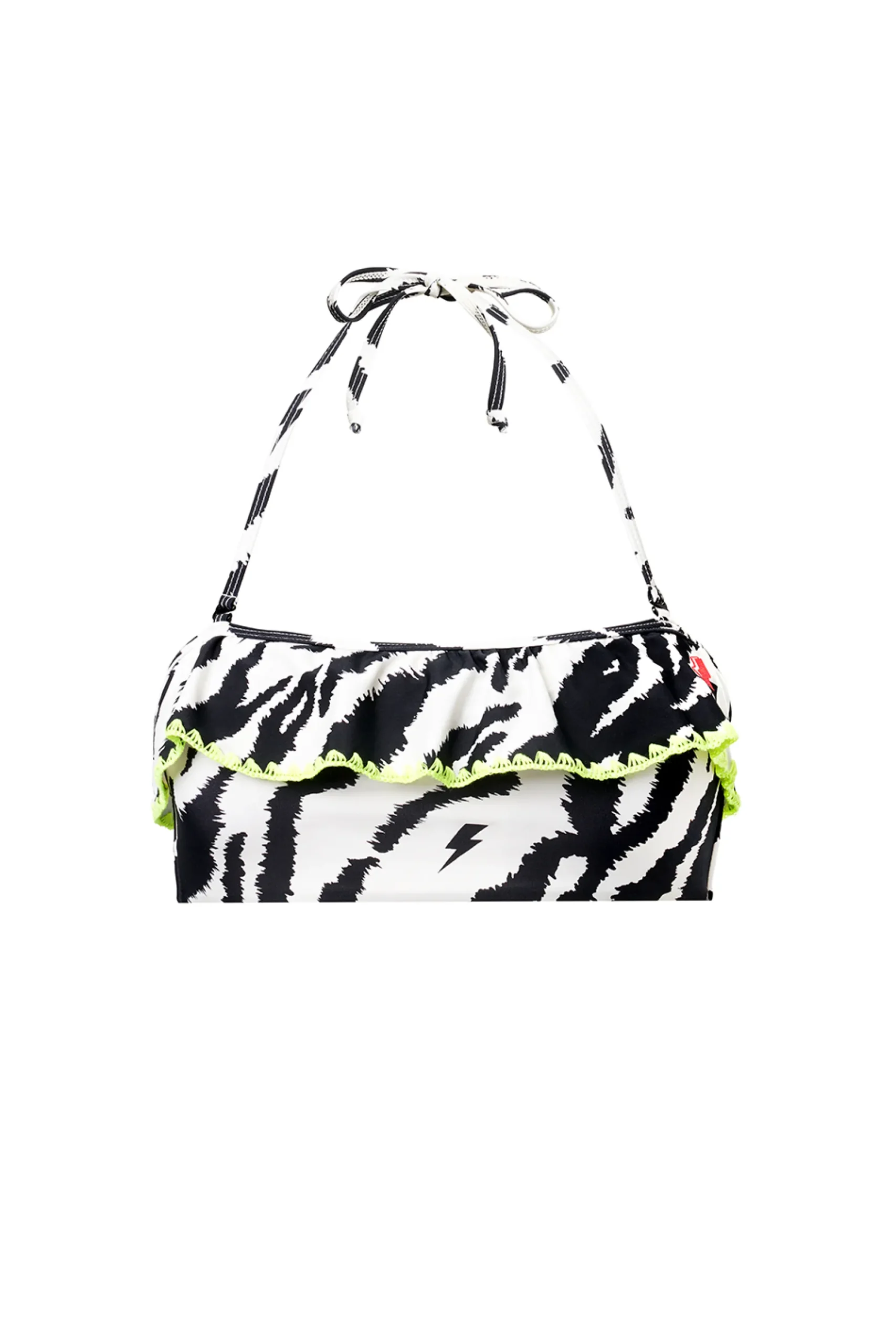 Soak up the sun with our ivory bandeau bikini top, adorned with a daring tiger and lightning bolt print. Designed with soft, stretchy fabric for supreme comfort, the removable adjustable tie straps allow for a personalised fit and neon yellow stitching adds a striking touch. Perfect for a sun-drenched beach day, this top promises a stylish adventure by the sea.