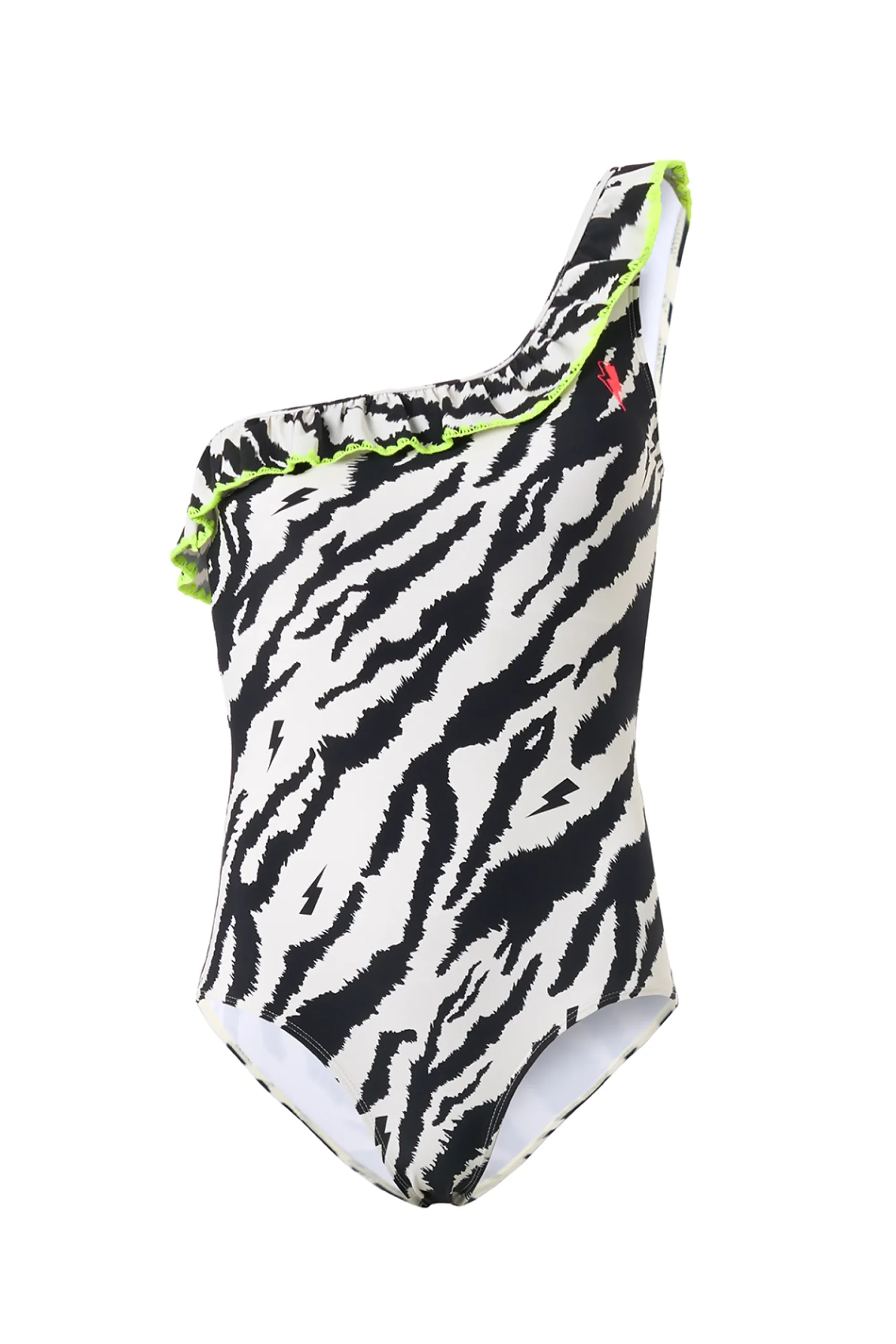 - Ladies swimsuit in ivory and black tiger lightning bolt print