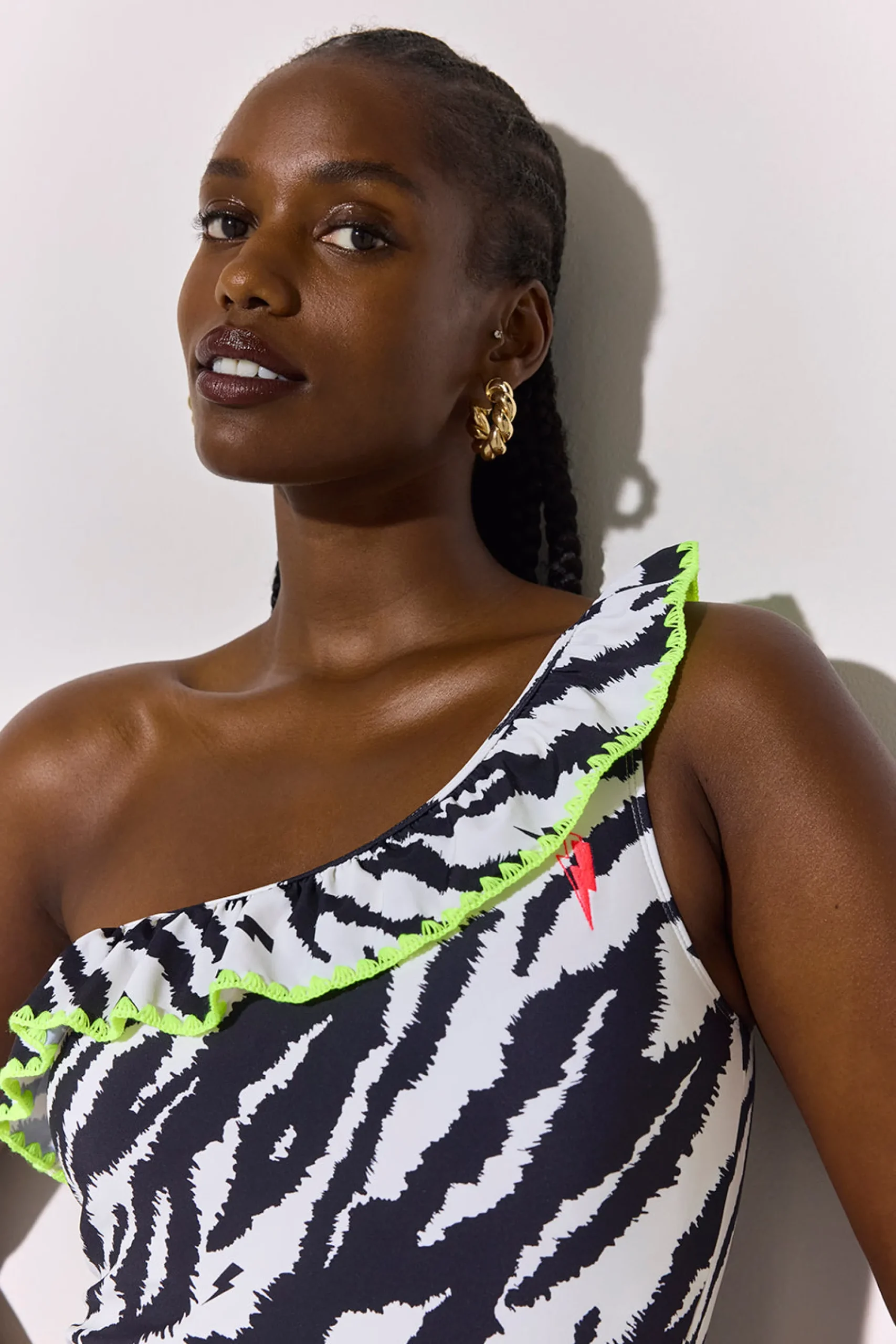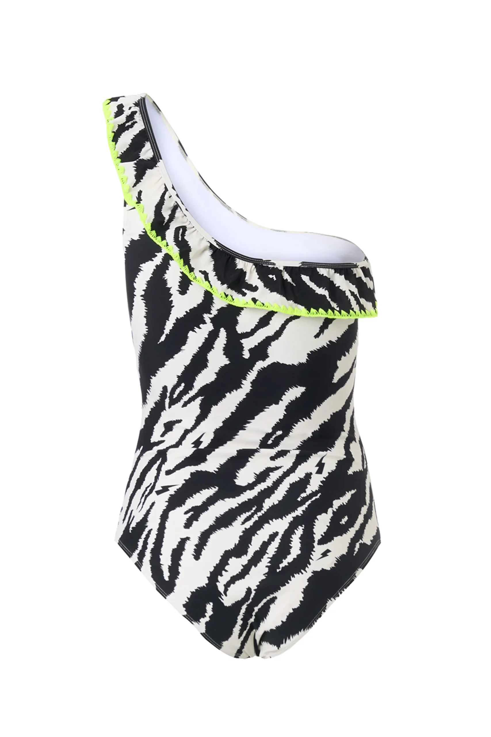 Dive into summer with this striking one-piece. Featuring a neon trim, bold tiger print and asymmetric shoulder, it’ll make you feel pool day perfect no matter where you’re headed.