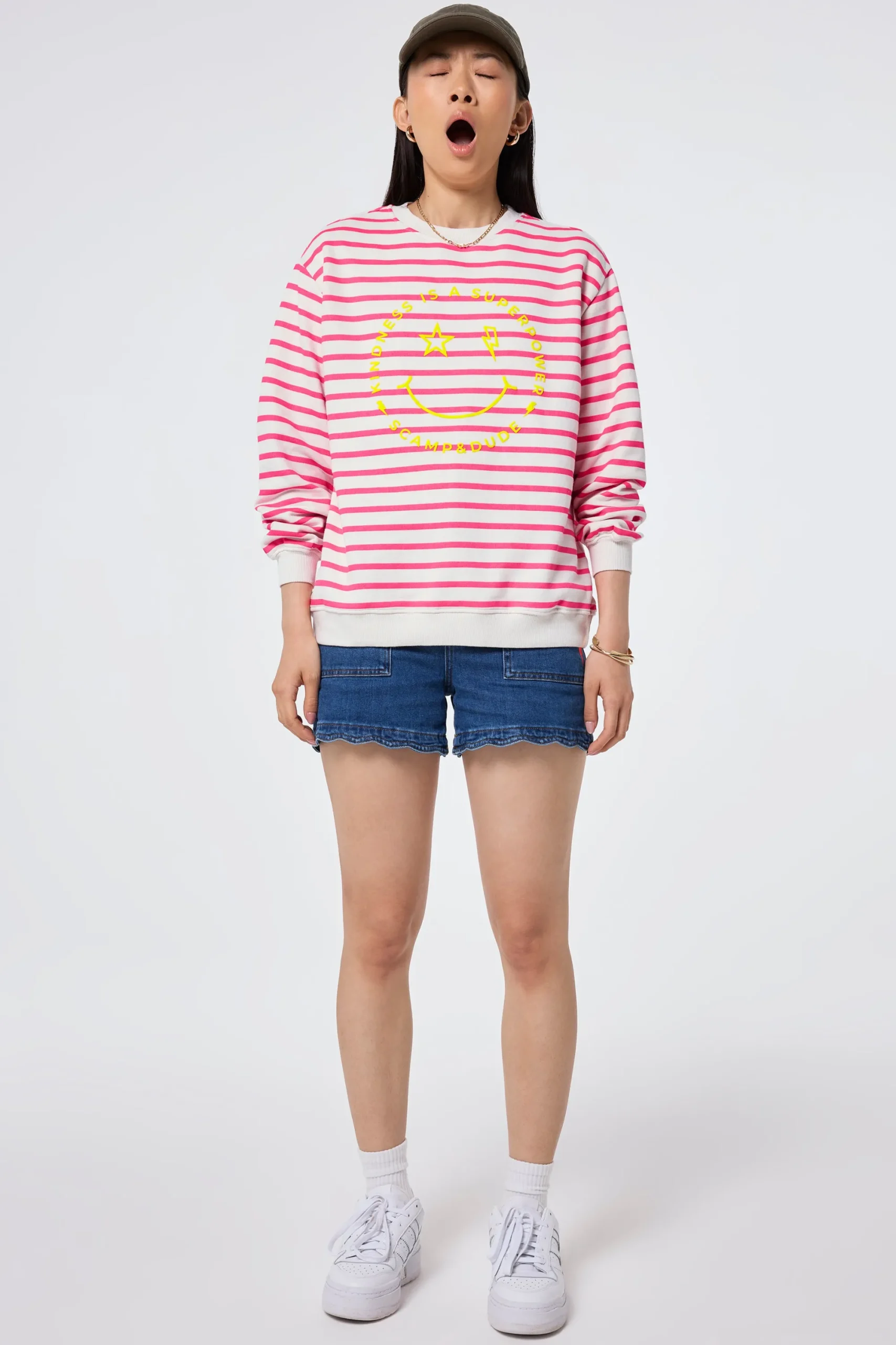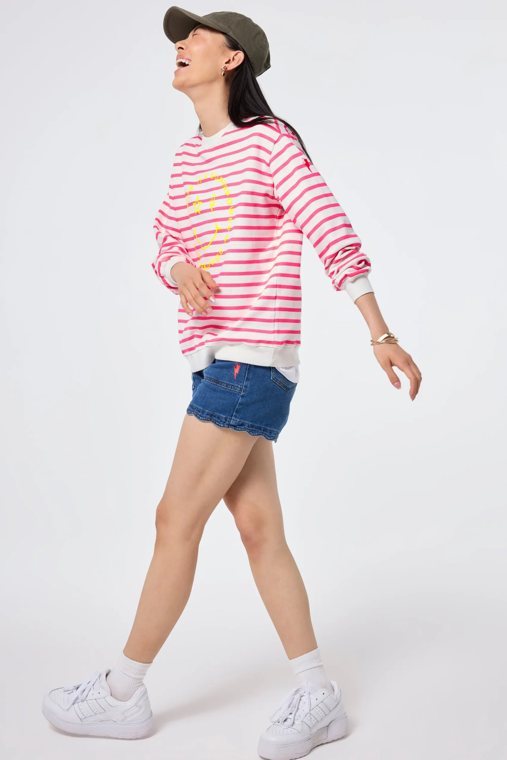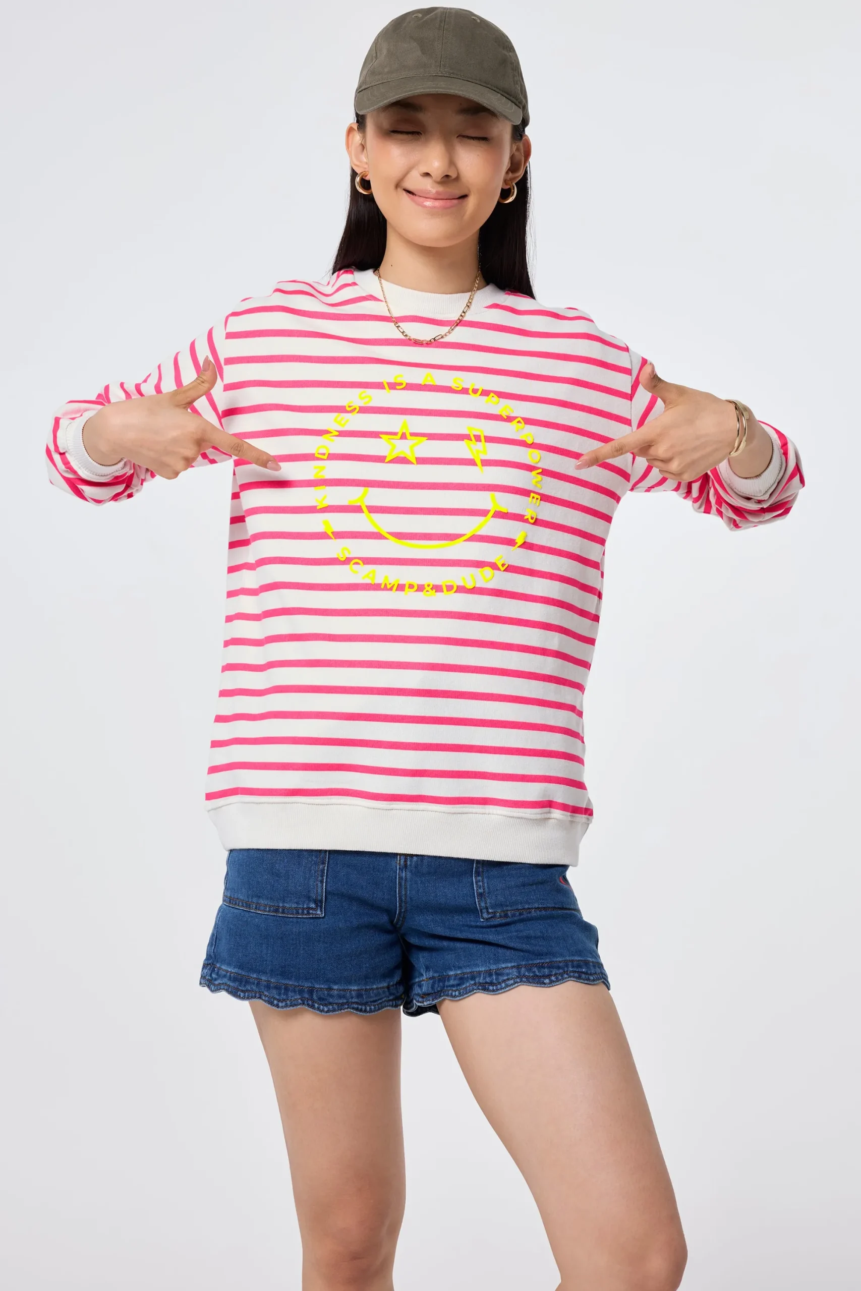 A feel-good essential designed for your everyday wardrobe. This ivory with neon pink stripe sweatshirt offers an extra roomy fit (great for layering in chilly weather) and features relaxed dropped shoulder seams and a joy-filled smiley face graphic, front and centre. Crafted from ultra-soft, 100% organic cotton, it’s as snug as your favourite duvet. Warning: you might not want to take it off…