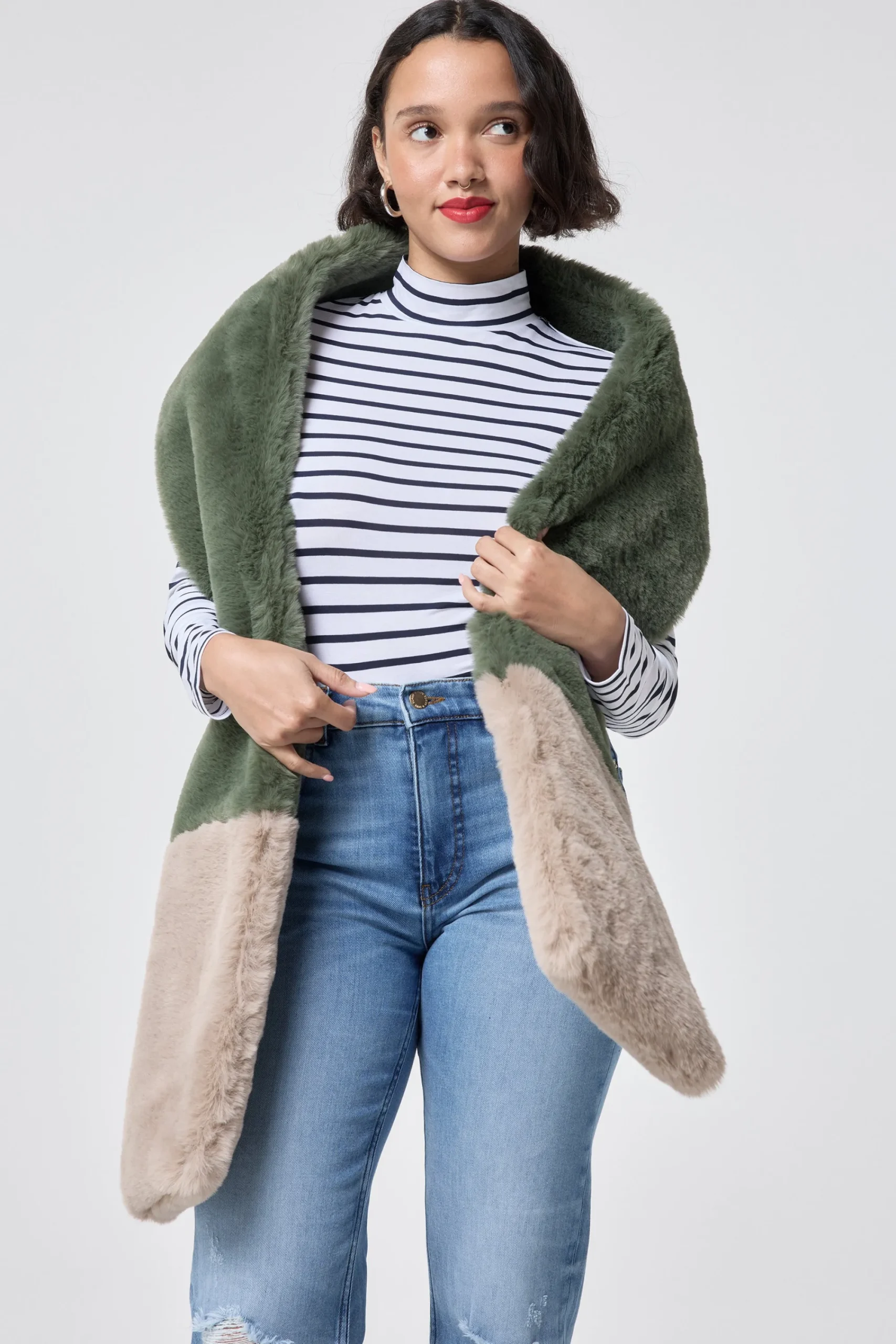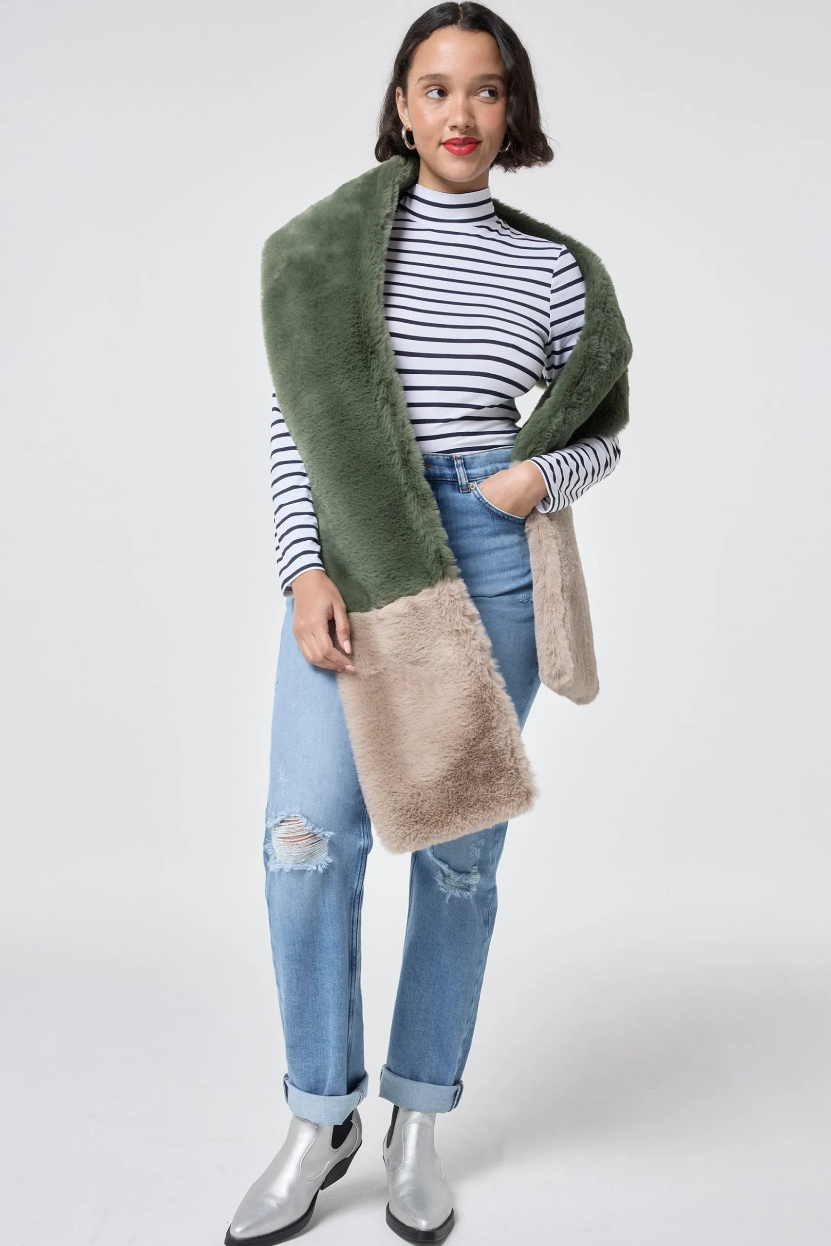 Wrap up warm in chilly weather with this super soft khaki and taupe faux fur scarf. Wrap it around a sweatshirt with a puffer coat. It’s oh-so-cosy.