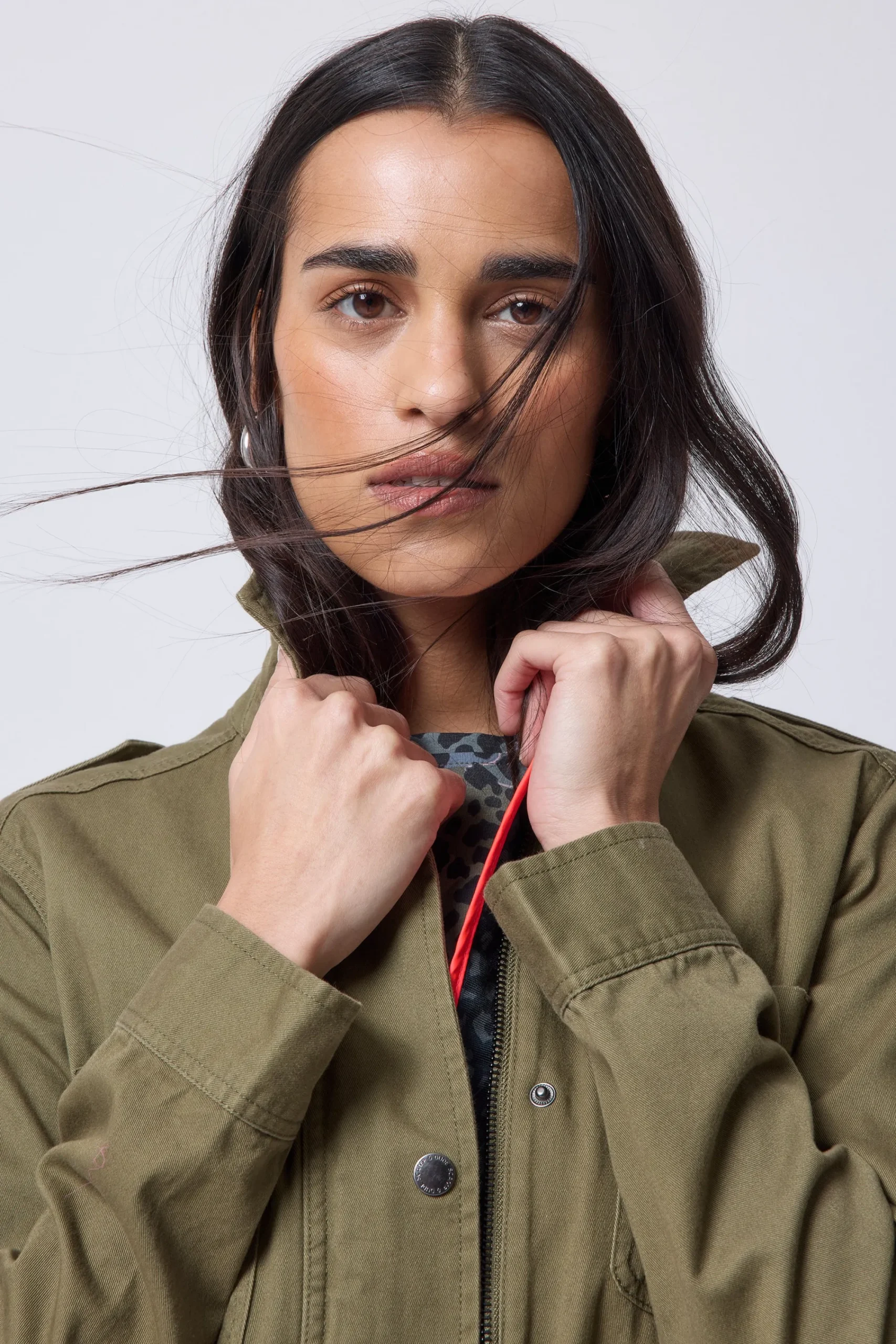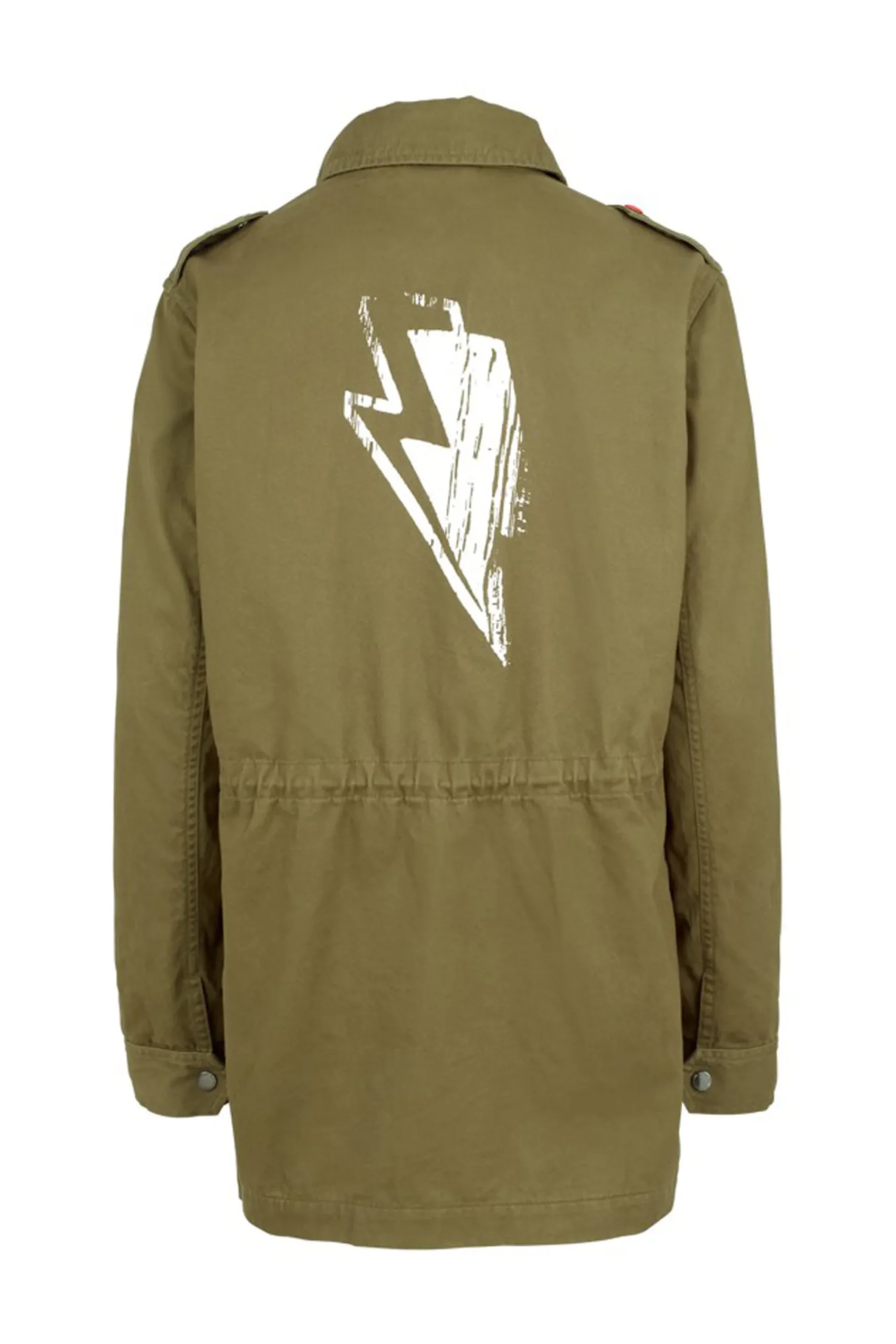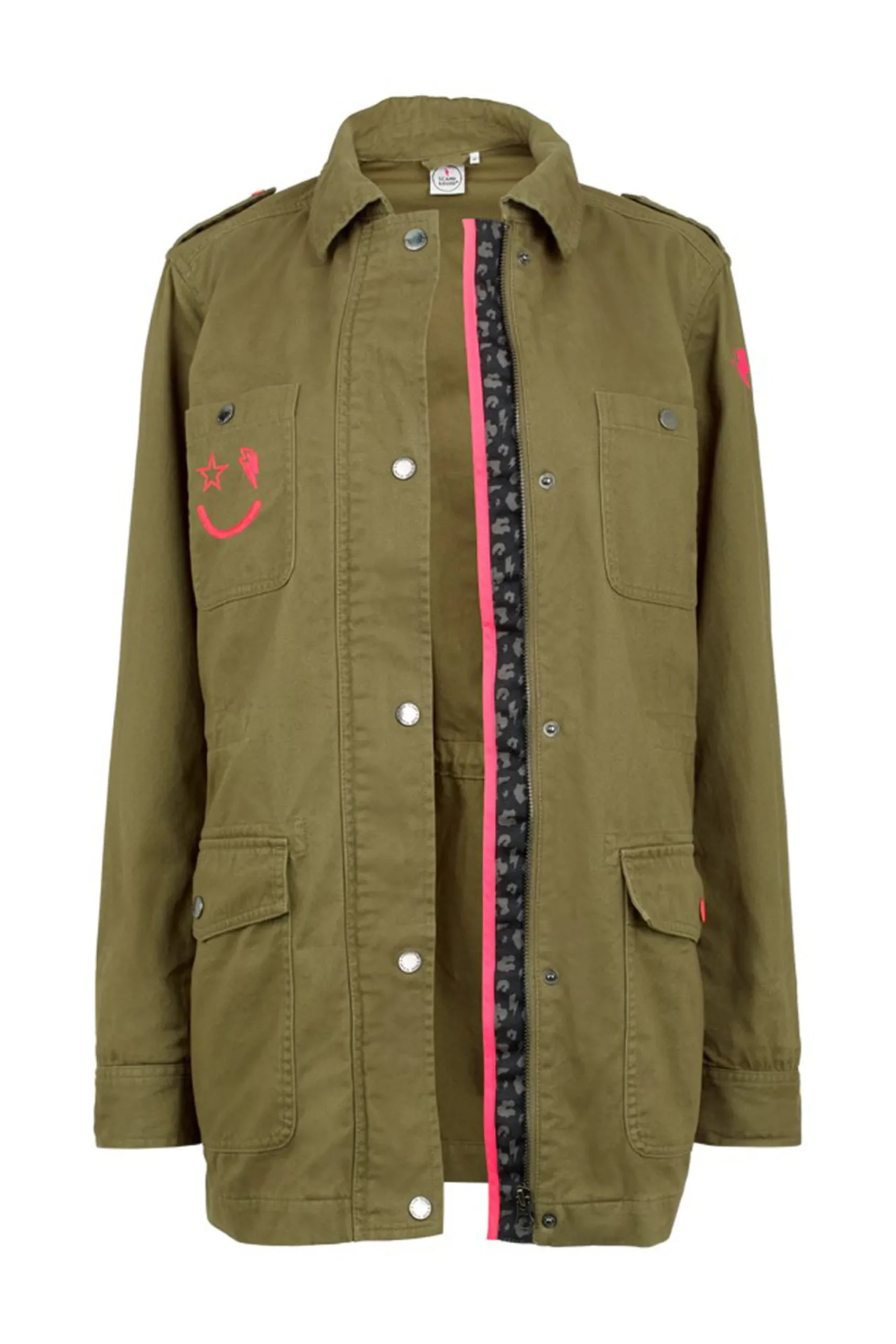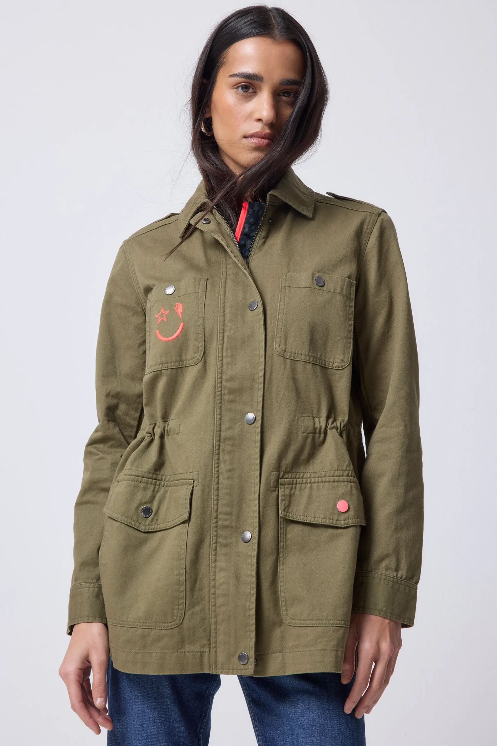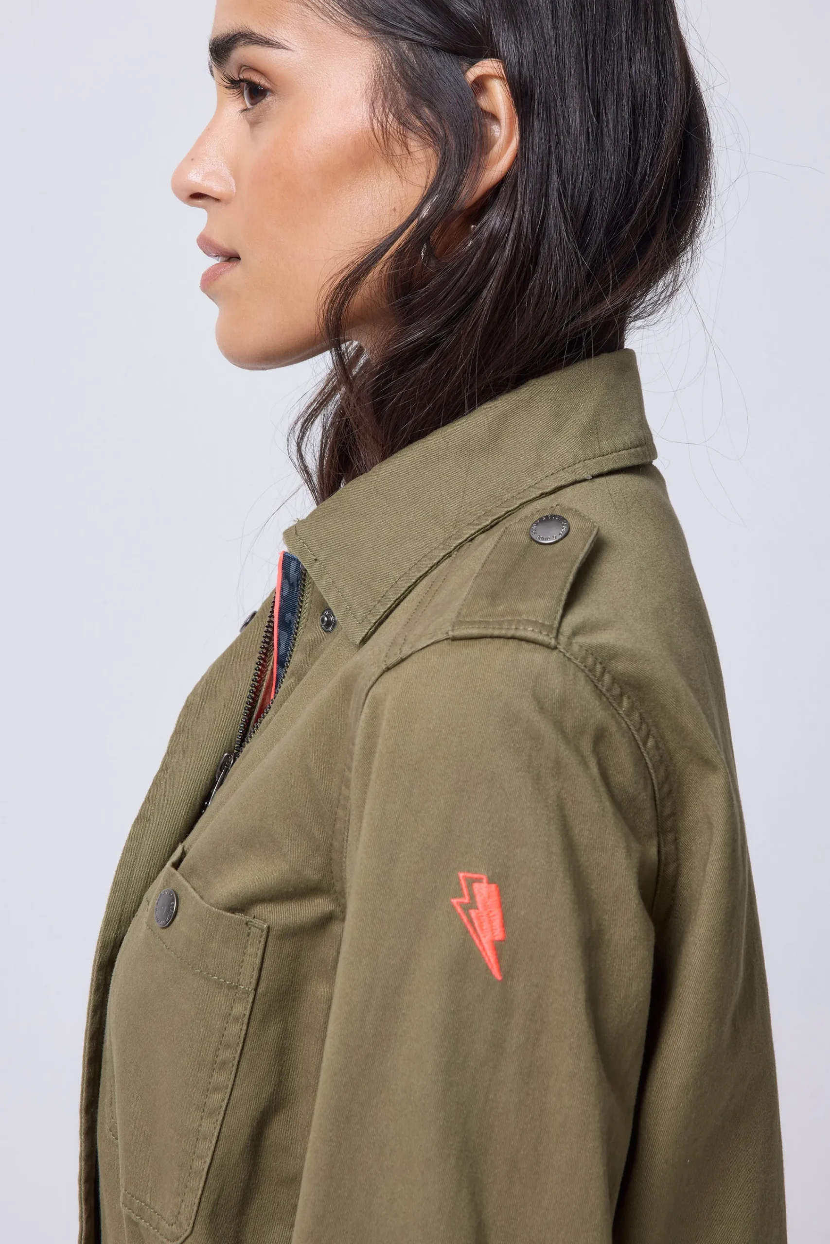 We’re wearing our classic washed cotton twill, khaki utility jacket with our lightning bolt and star winking smiley logo embroidered on the front all year round. We’ve designed it with all our favourite details, from the oversized white lightning bolt on the back to spacious pockets – throw on over a leopard print dress when the sun goes down or layer over your outfits to beat the chill in cooler weather.