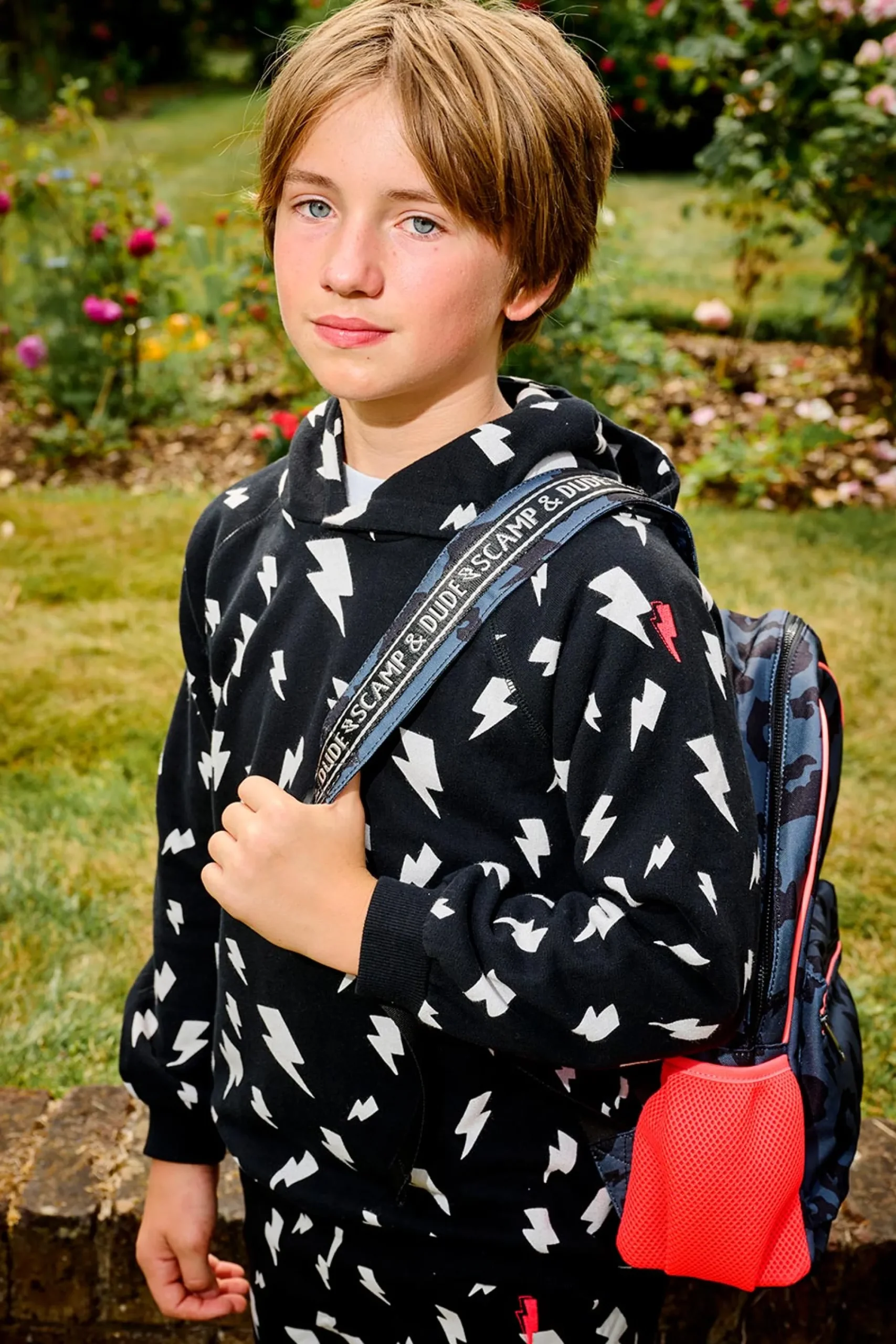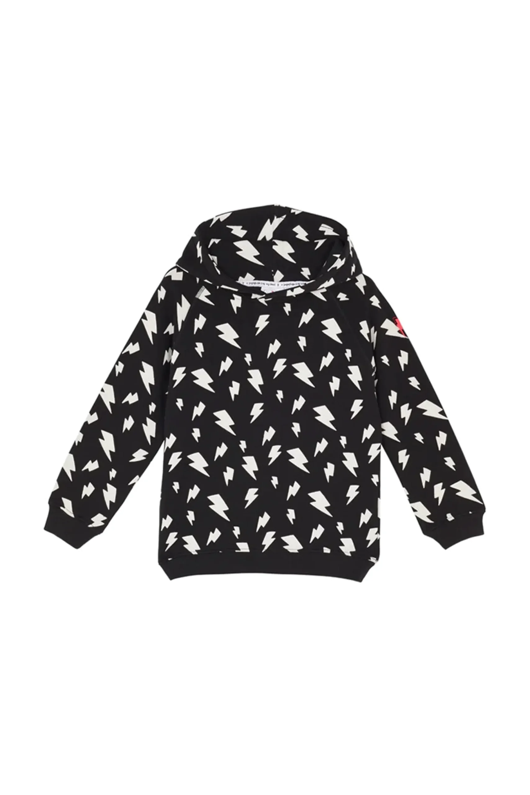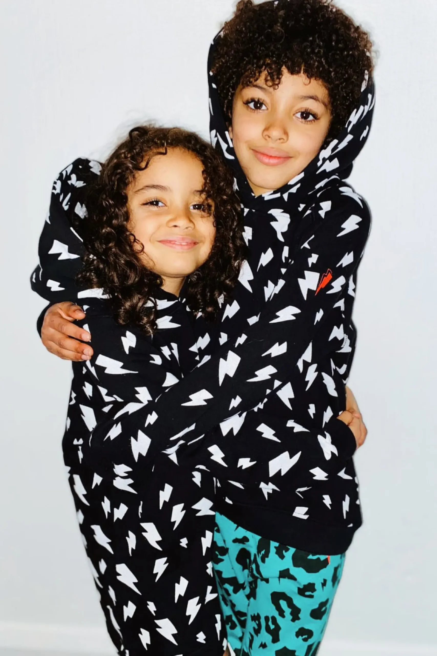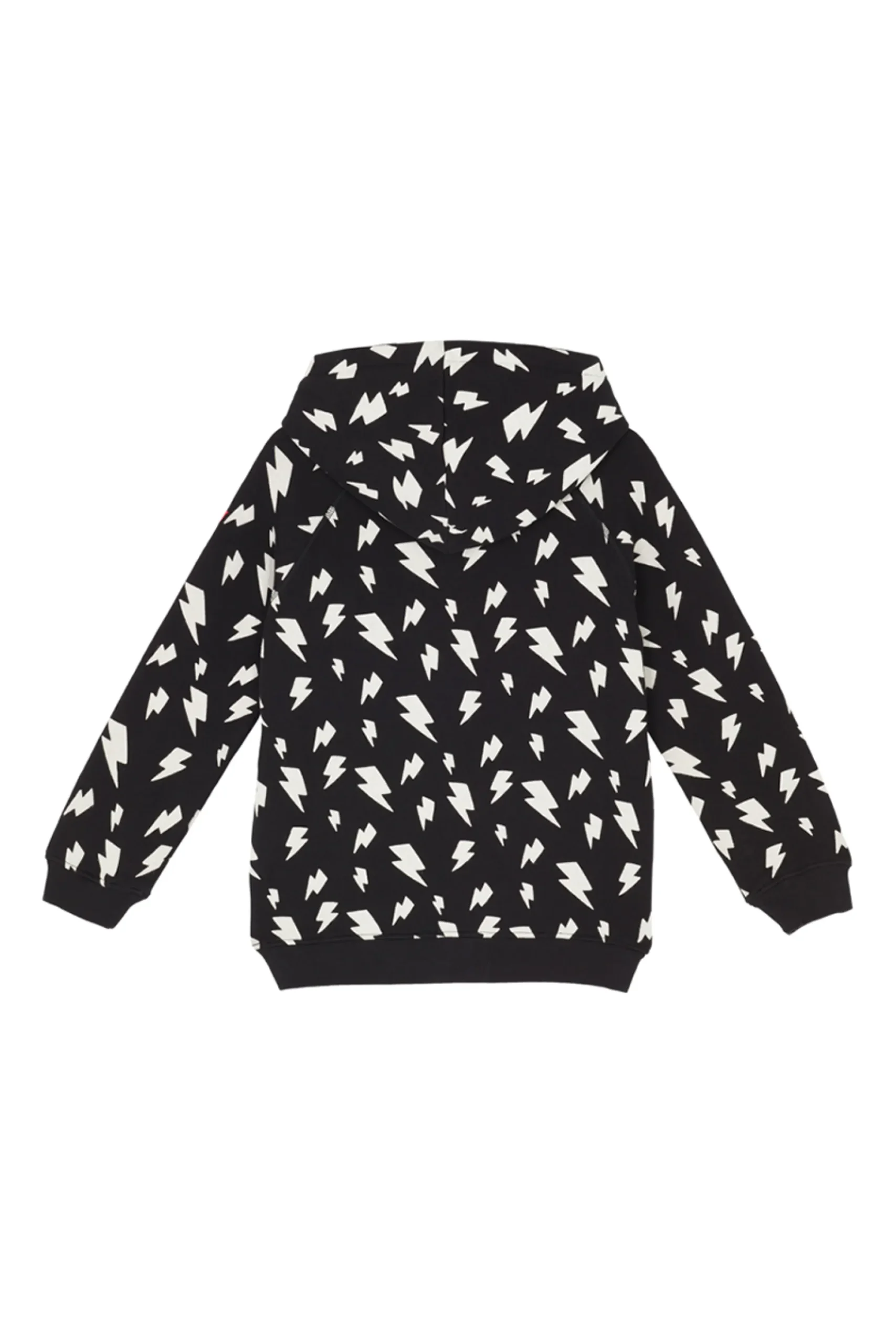 Organic cotton kids hoodie in black with white lightning bolt print.