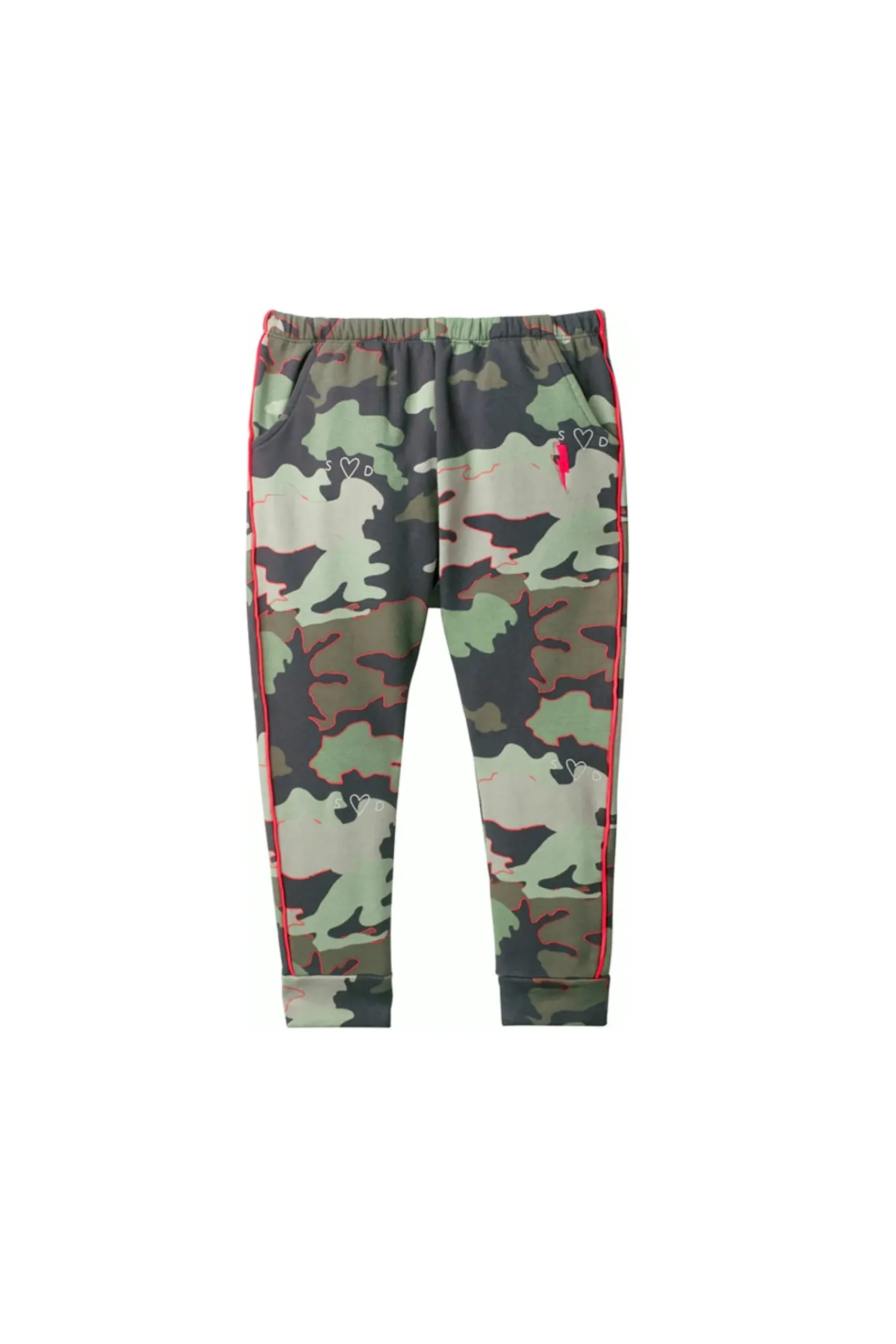 Khaki camouflage print, cosy, super soft joggers with signature neon outlines and piping at the side seam