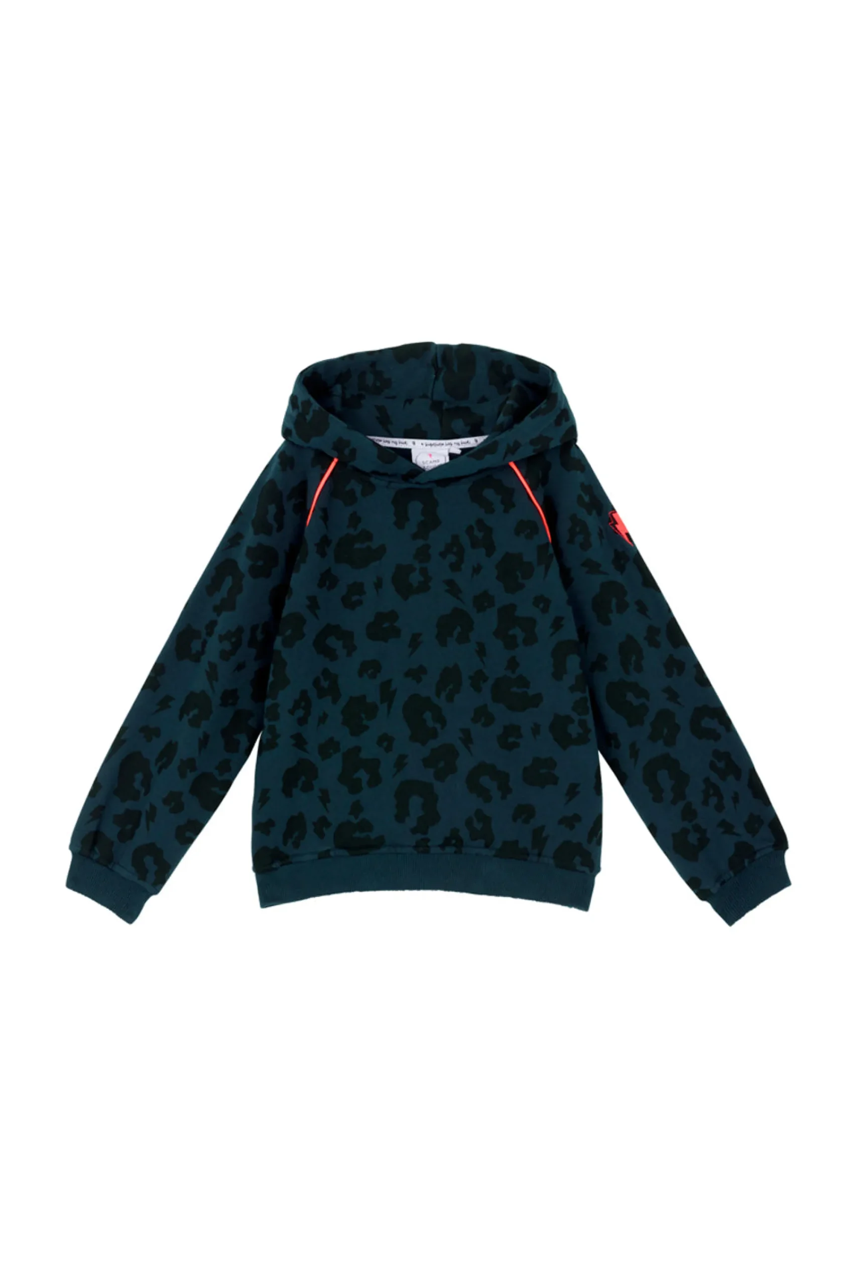 Organic cotton kids hoodie in navy with black leopard and lightning bolt print. A relaxed comfy fit in super soft fabric, with a raglan sleeve featuring our signature neon piping.