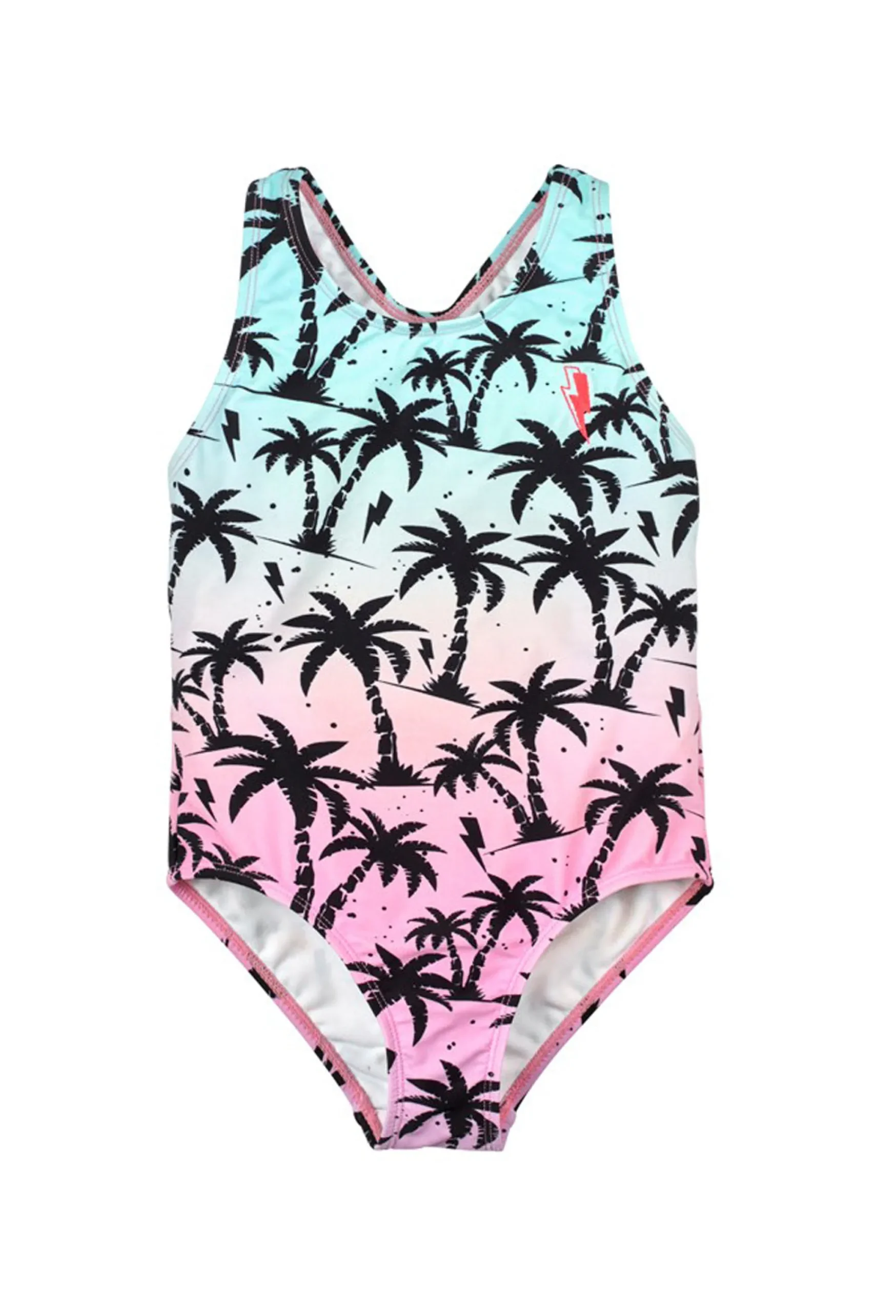 Kids swimsuit in our new ombre with black palm and lightning bolt print.