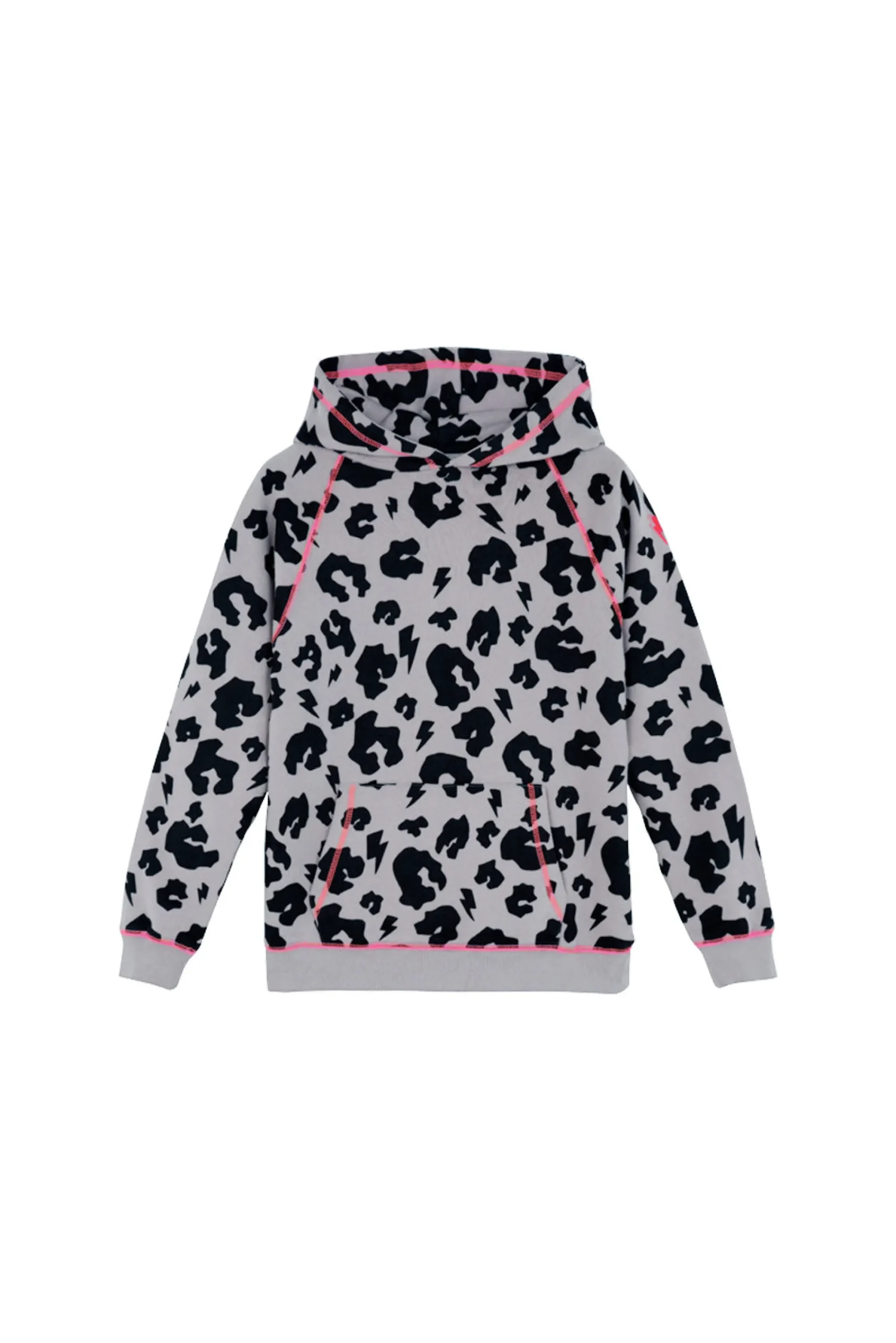 Every kid needs a warm wardrobe staple that works for play time on cooler days and summer evenings. Our stone grey with black leopard and lightning bolt hoodie with neon pink stitching detail is as stylish as it is cosy.