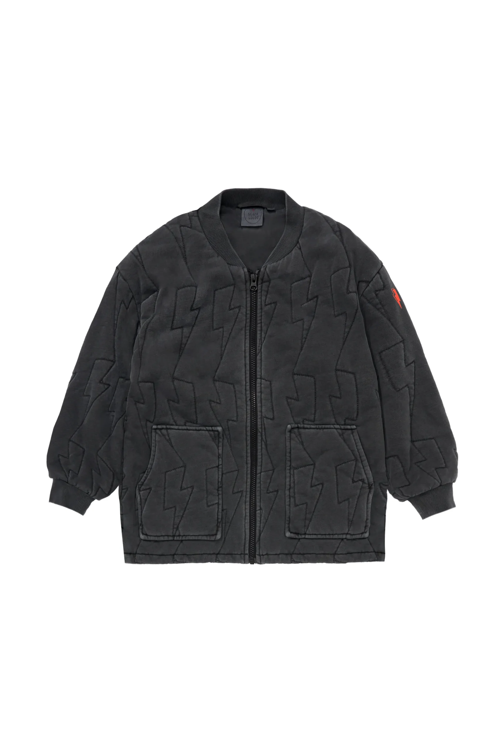 Our kids washed black organic cotton quilted lightning bolt bomber jacket can be easily thrown on when the weather’s being unpredictable. It has a comfy oversized fit and a zipper fastening.