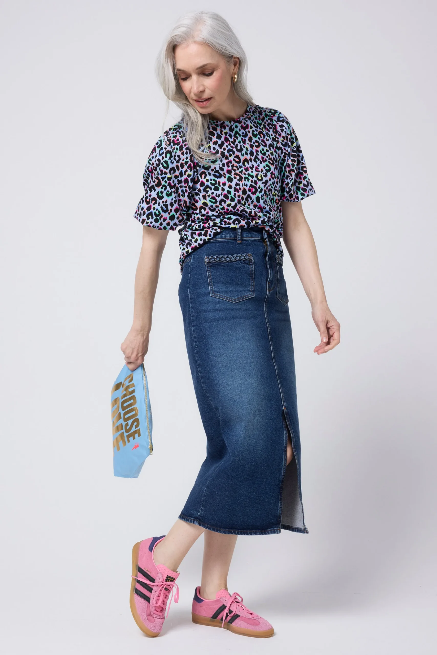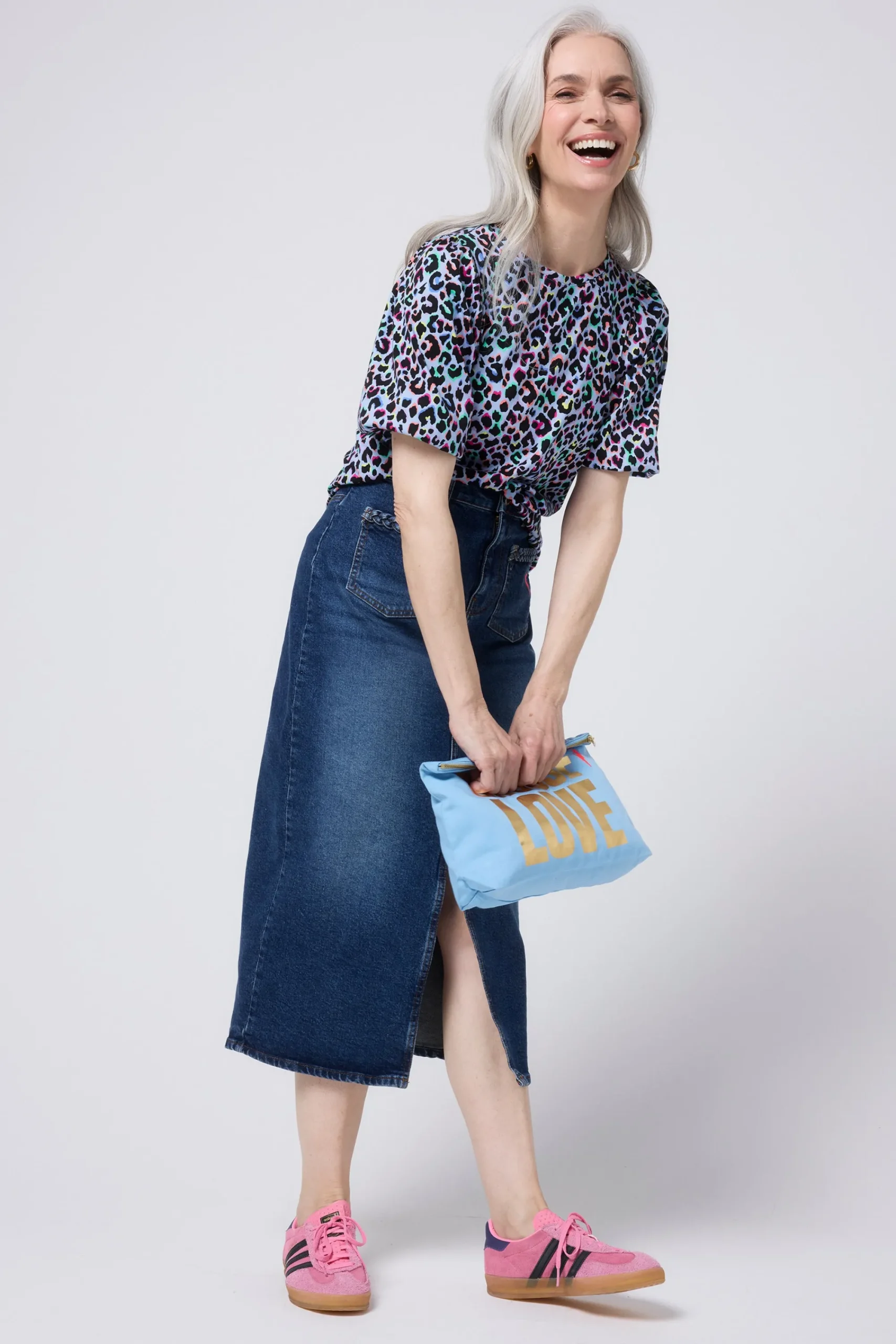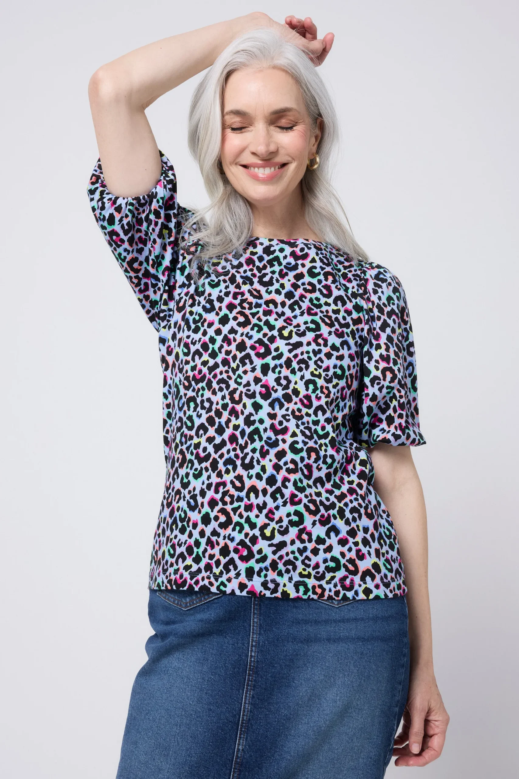 Make a statement in our light blue with rainbow shadow leopard and lightning bolt puff sleeve T-shirt. Complete with a crew-neckline and feminine puff sleeves with an elasticated cuff, this comfortable piece will be the perfect addition to your wardrobe. We’ll be pairing ours with dark denim and boots for a casual yet stylish outfit.