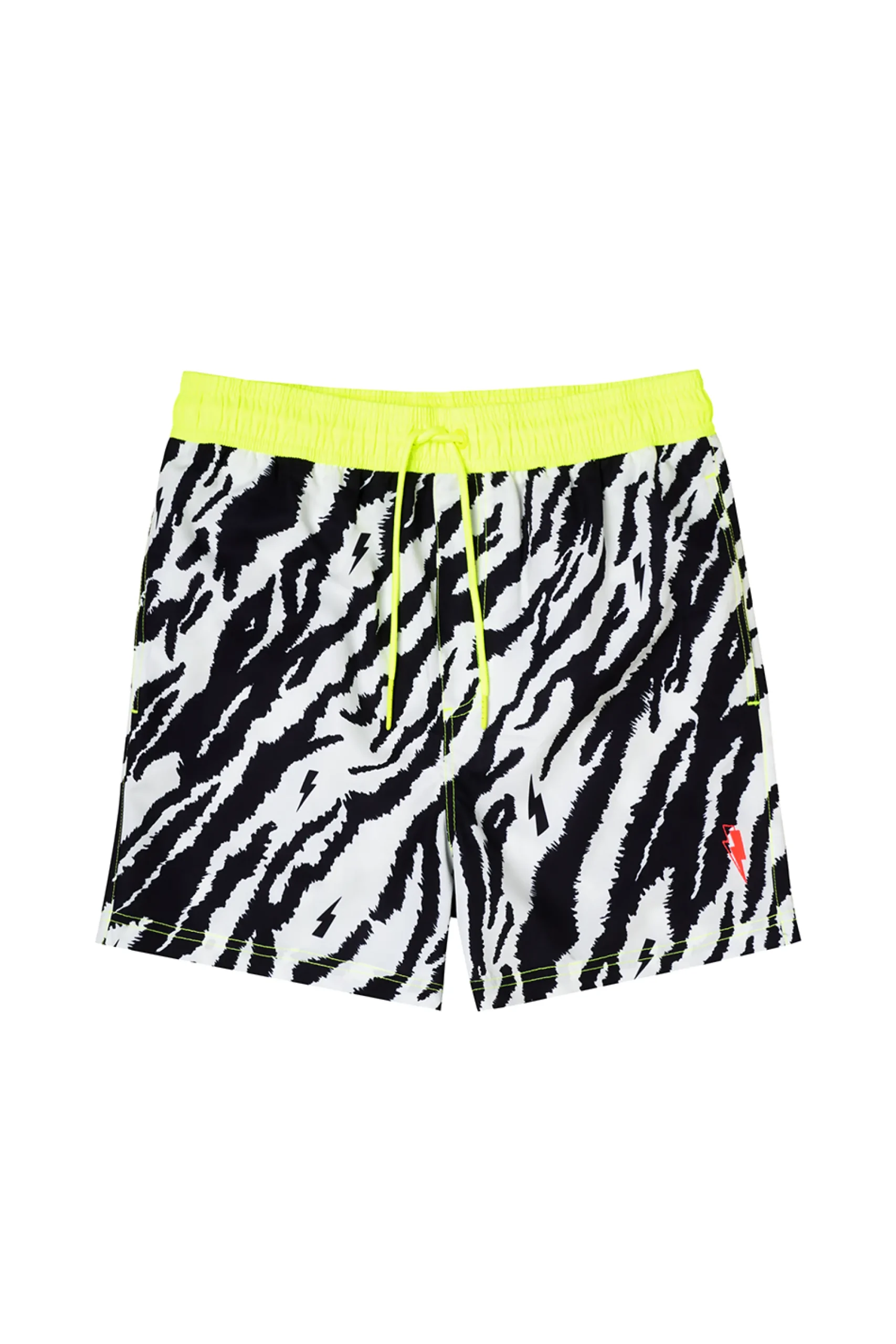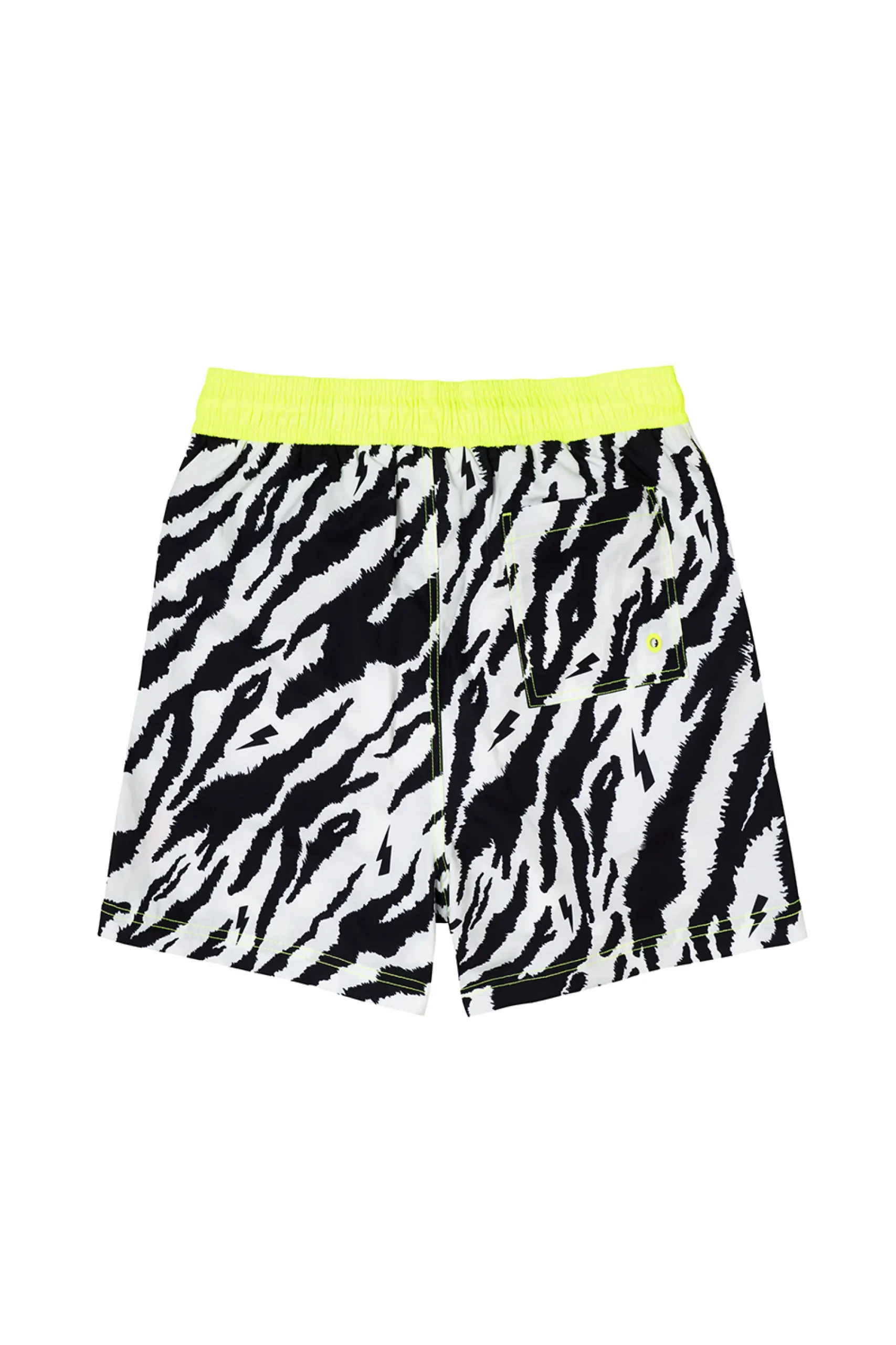 - Mens Swim Shorts in Ivory with Black Shadow Tiger and Lightning Bolt Print