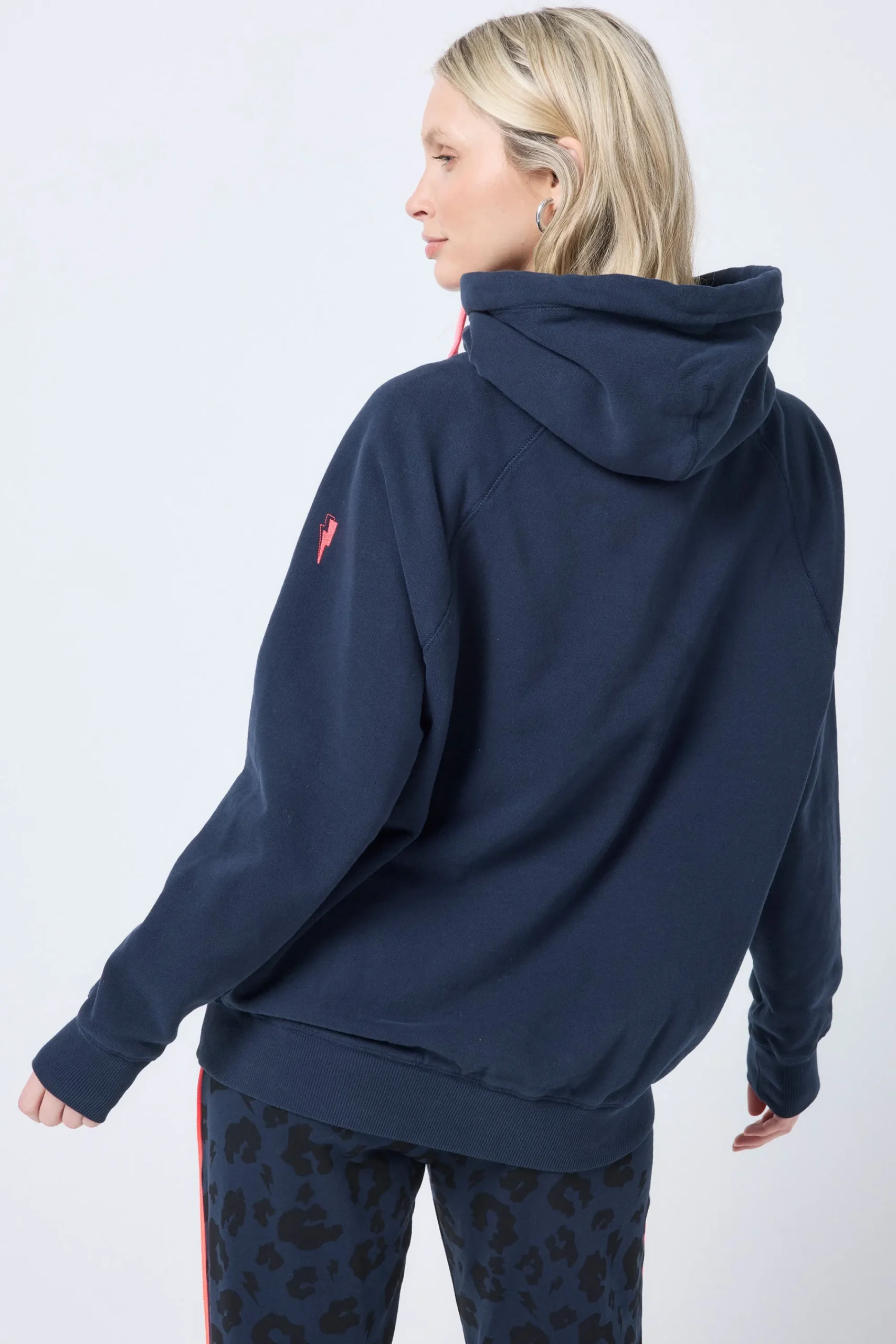 Our navy cowl neck hoodie with neon coral drawstrings is the ultimate in stylish loungewear. The super soft, organic cotton cowl neck hoodie will be one of the cosiest items in your wardrobe.