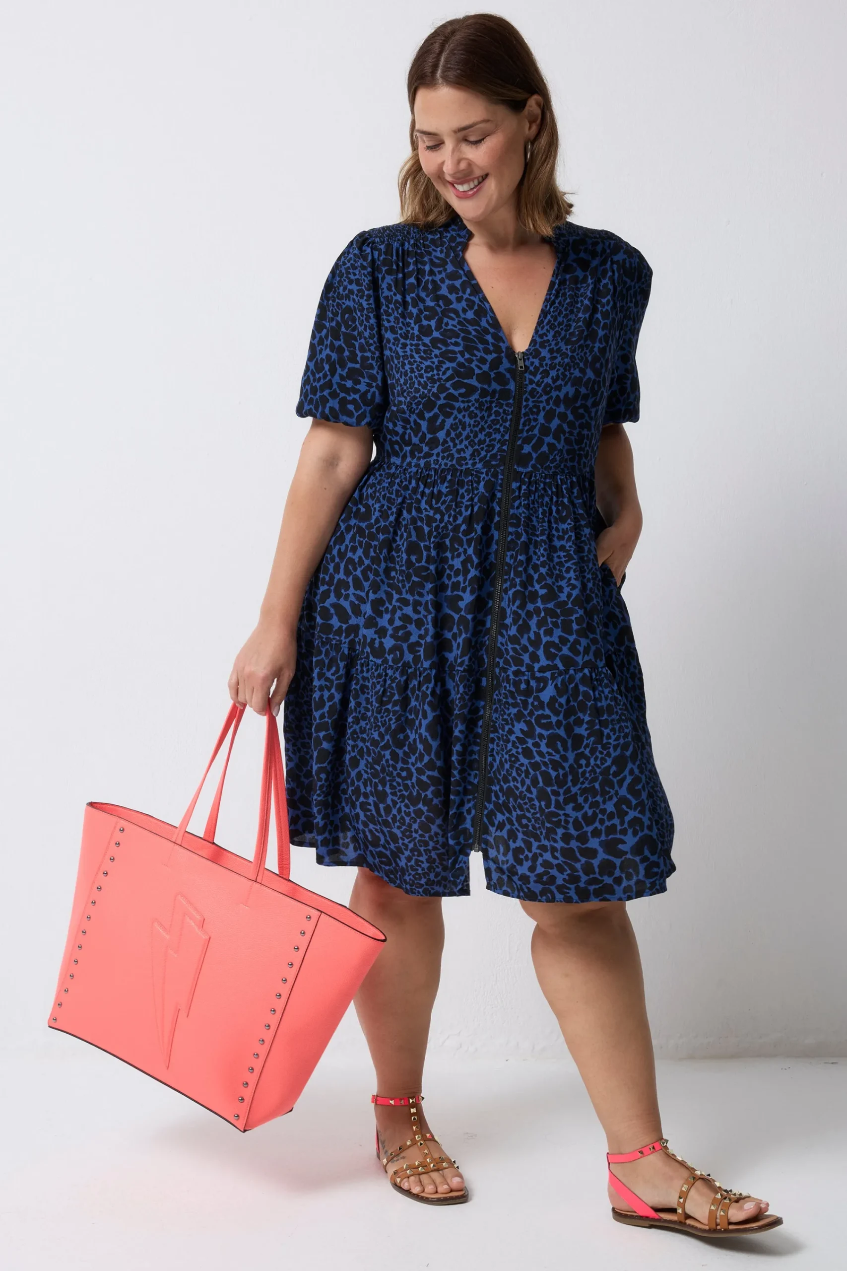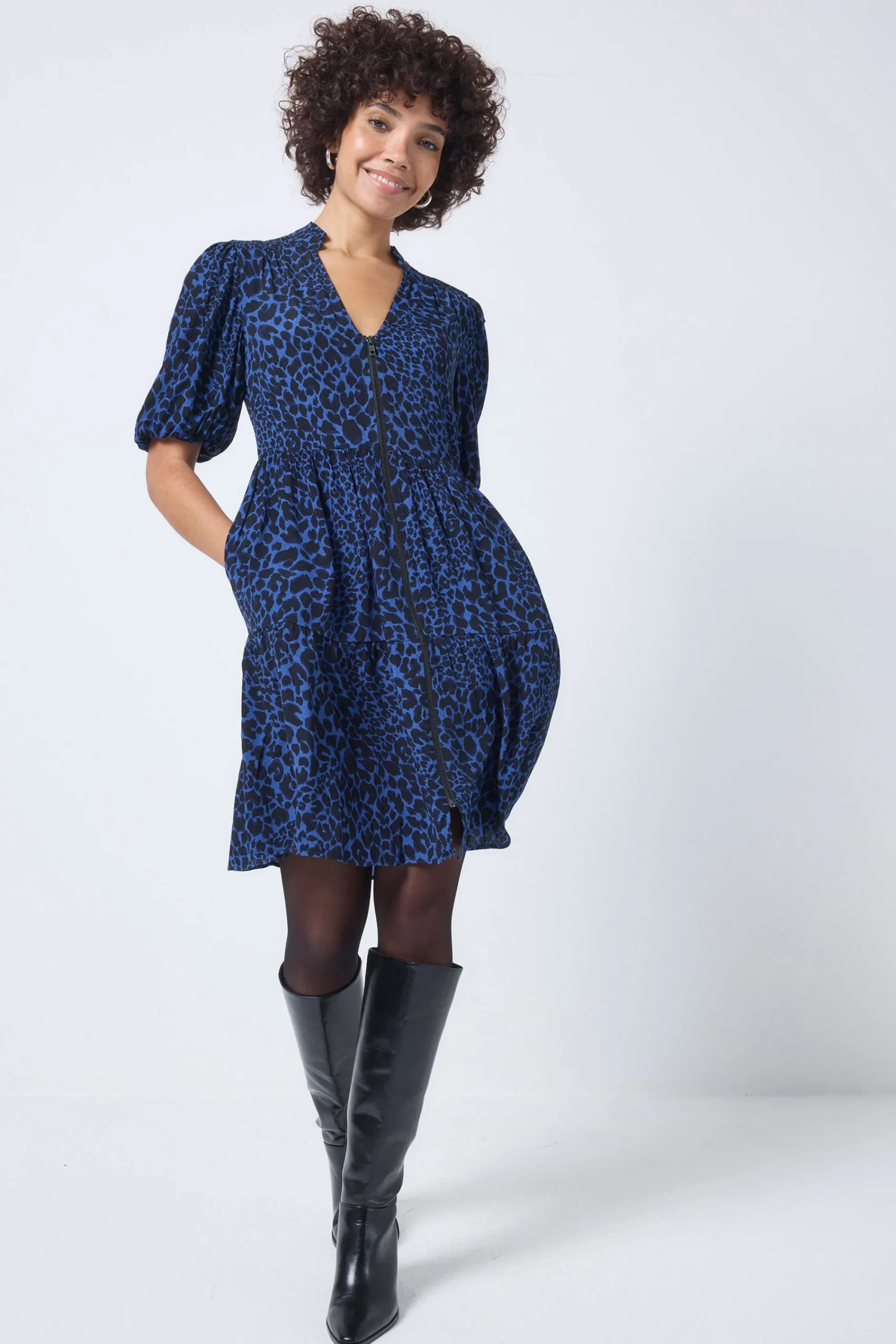 Crafted from soft viscose crepe this navy zip detail tiered short dress is all about off-duty charm. It’s crafted with romantic short blouson sleeves, a smart v-neckline and a contrast zip fastening. For a flattering silhouette, the short length skirt fall in tiers in a flattering fit and flare style.