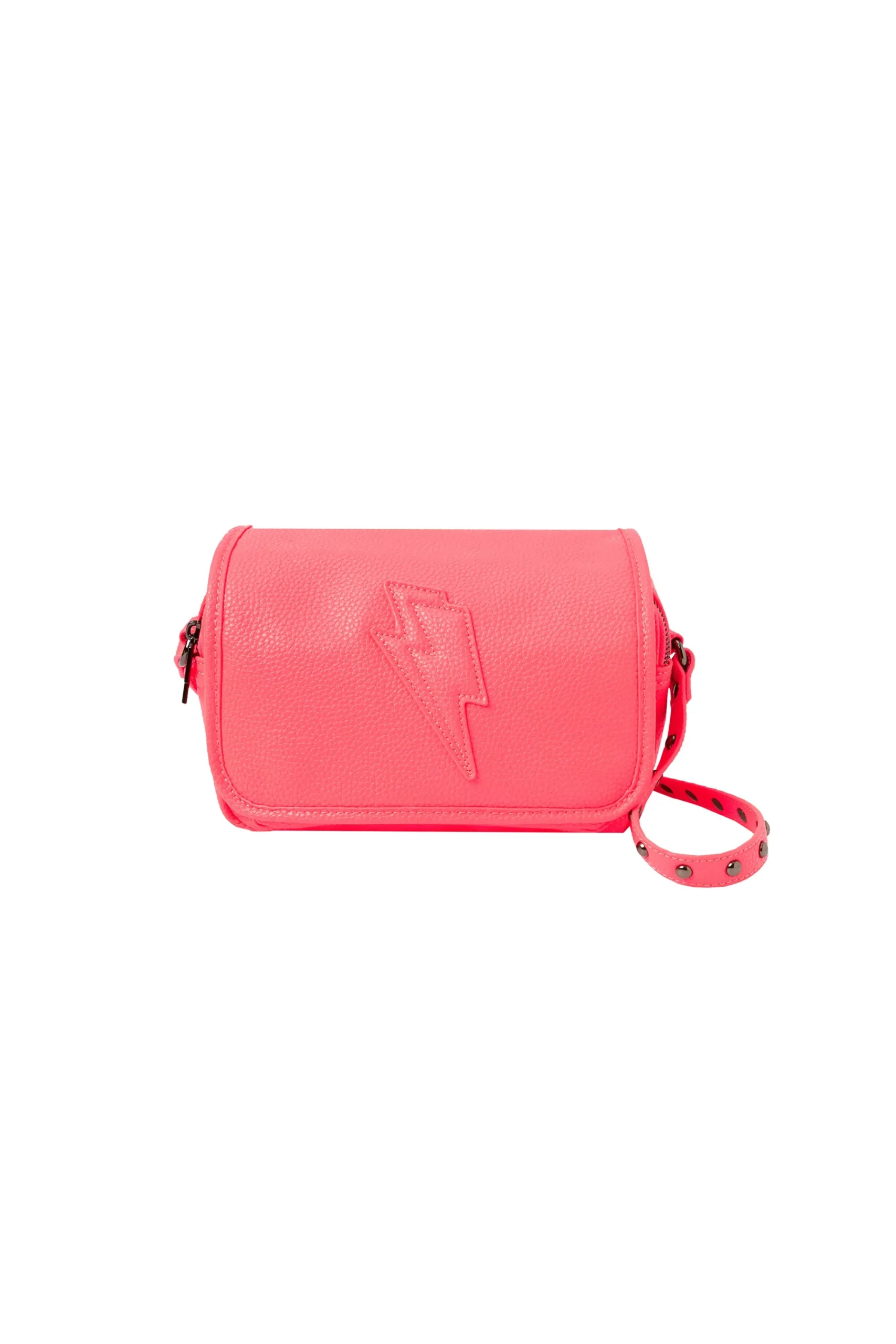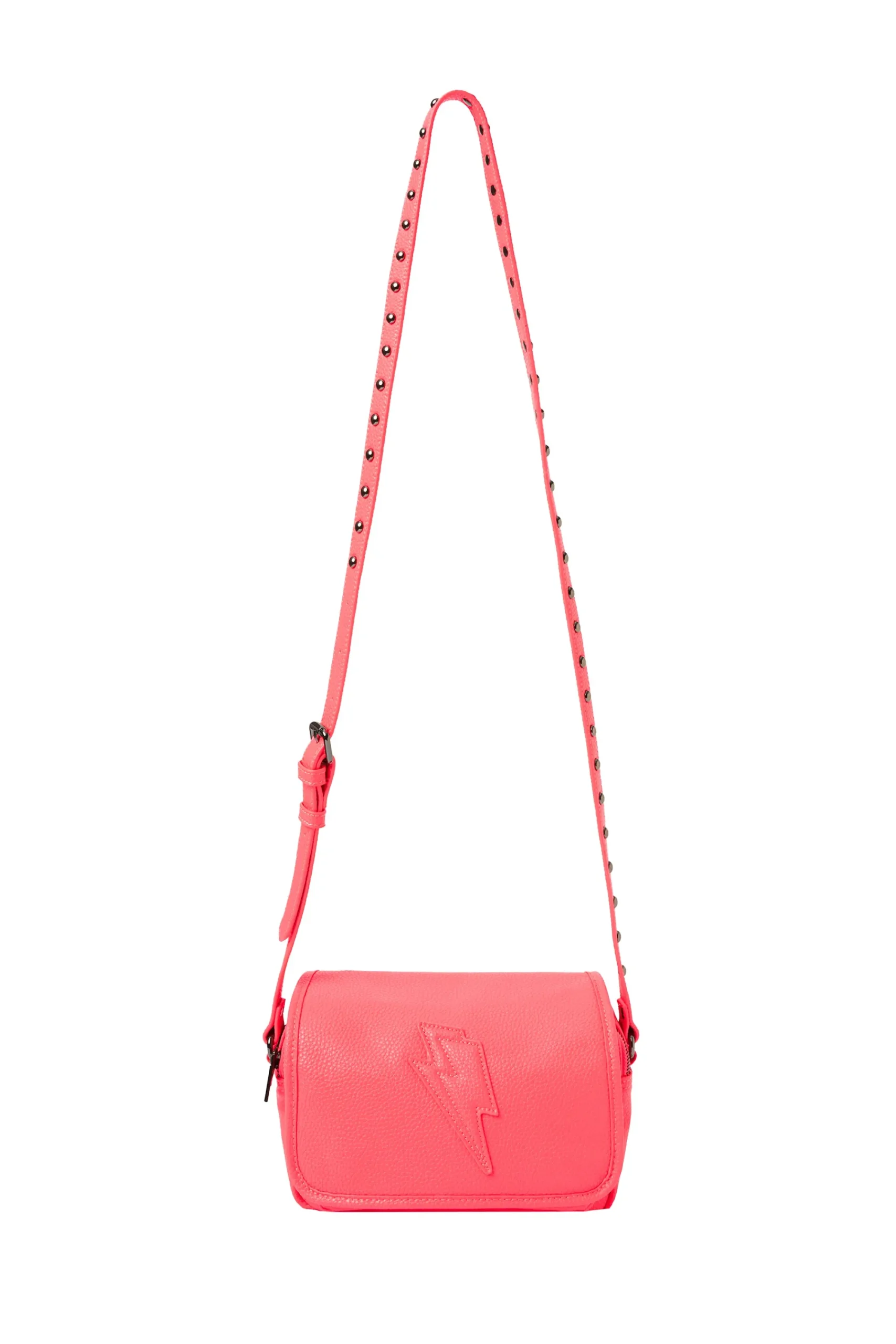 Our neon coral twin compartment cross body bag will add a fun pop of colour to your weekend wardrobe. Ideally sized and spacious enough to store all your essentials, this sleek bag is detailed with a lightning bolt on the front. Finished with a studded adjustable cross body strap. Please note, the coral on this bag is a little camera-shy. It’s a true, vibrant neon and pops in real life. Enjoy!