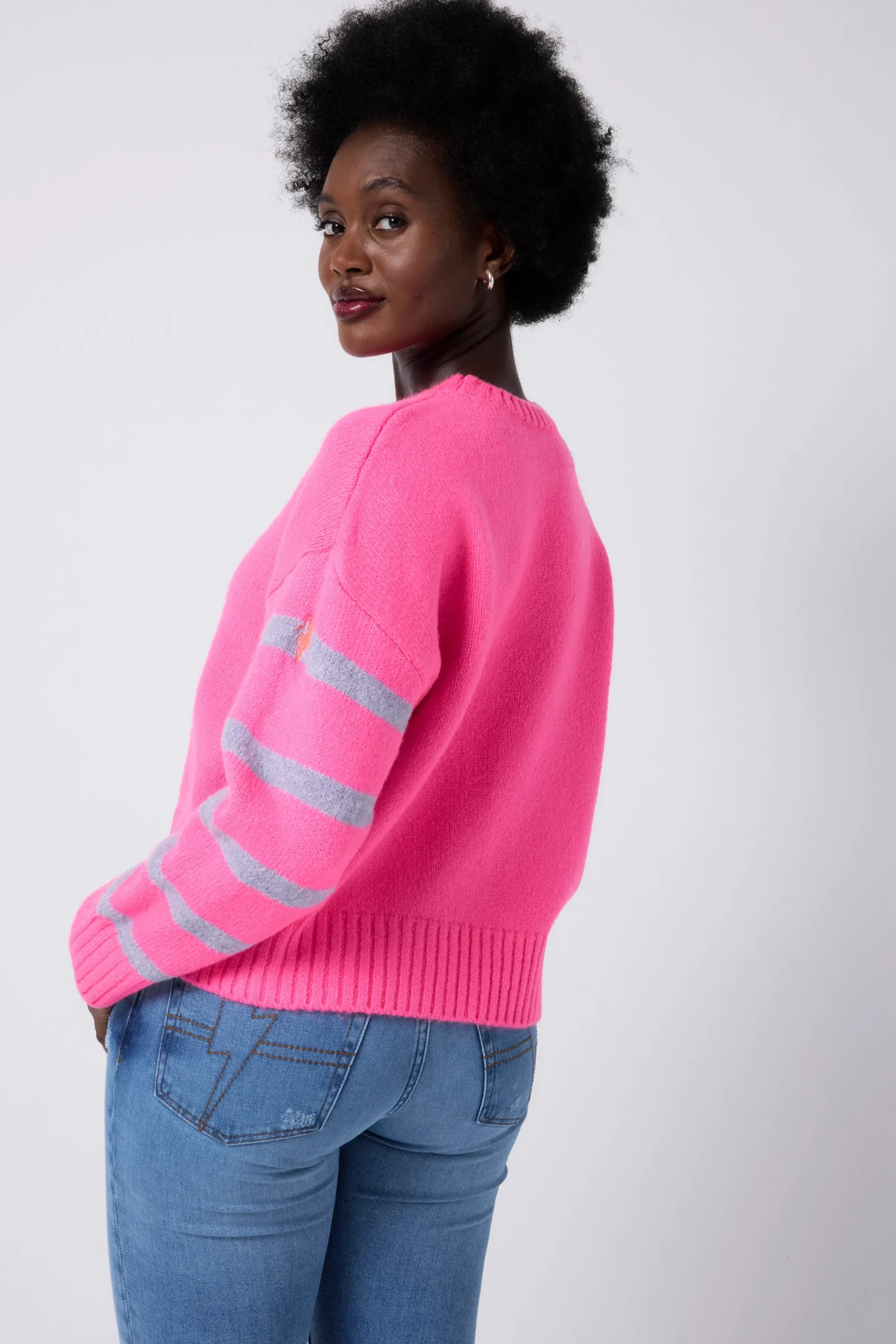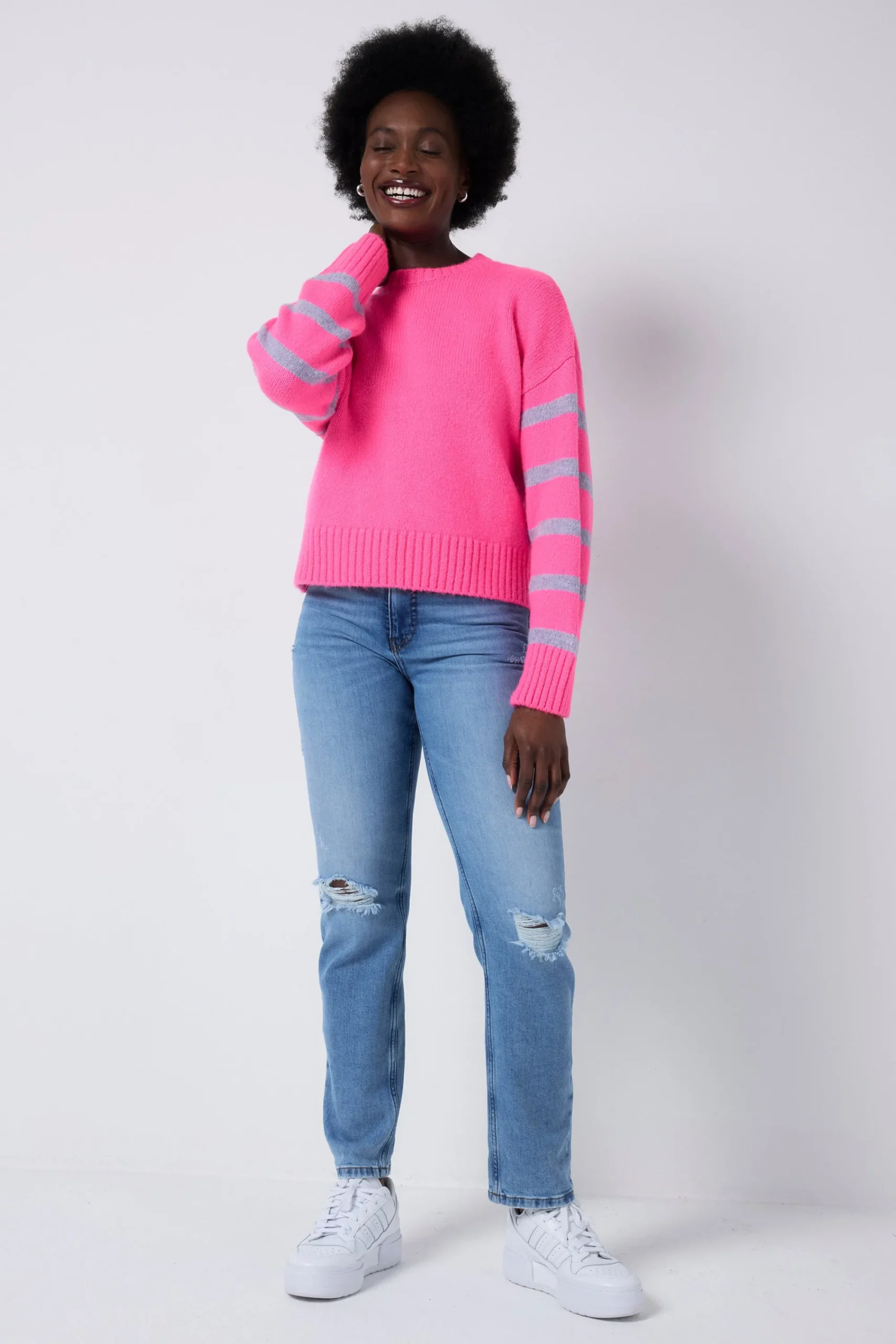 Our soft, neon pink and lilac stripe knit jumper is a wardrobe staple and a must-have for snuggling up. This charming soft knit boasts eye-catching hues. For seasonal chic pair with a denim skirt or jeans.