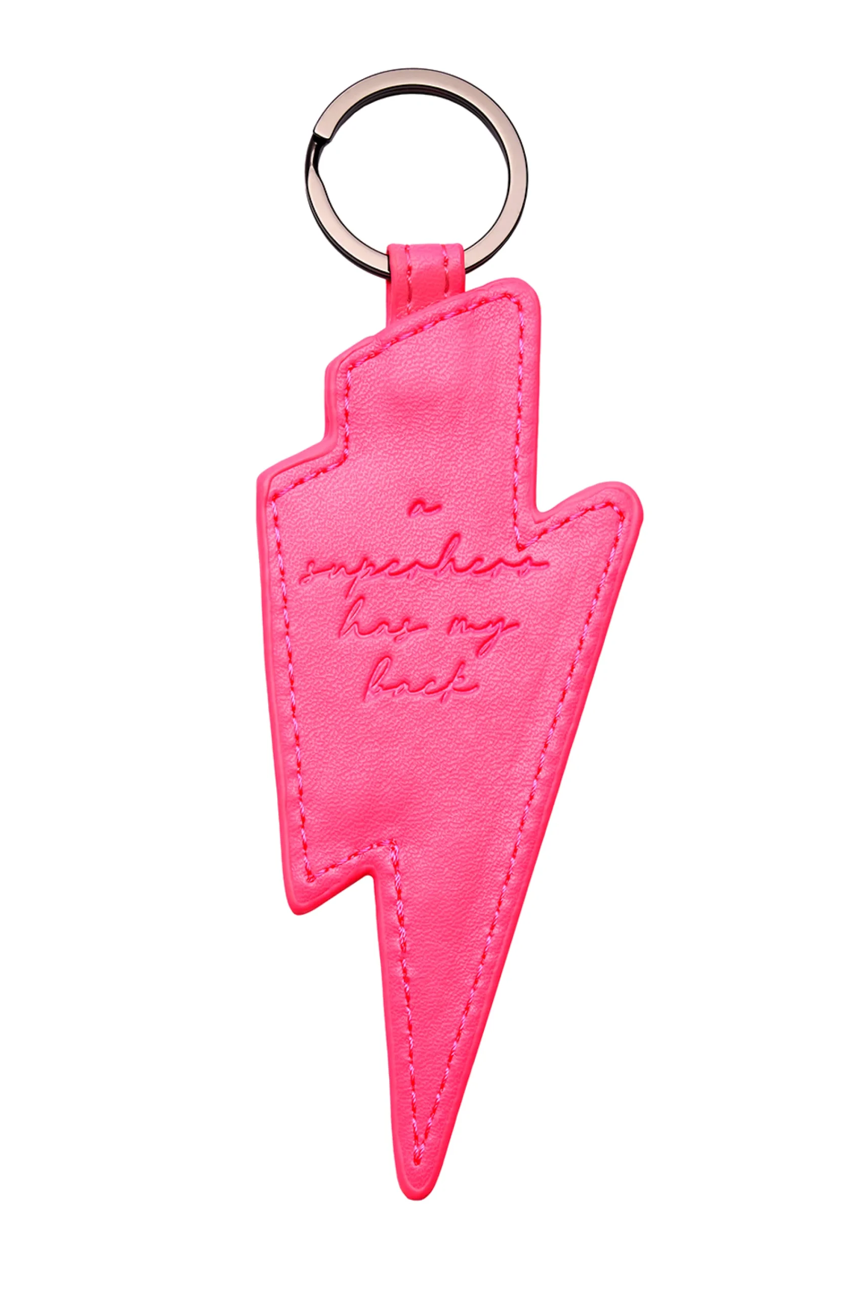 Our padded neon pink ‘superpower button’ lightning bolt shaped keyring will give the wearer comfort and confidence when they need it most. It is the perfect fantastic fashion accessory to add a pop of colour to your bags.