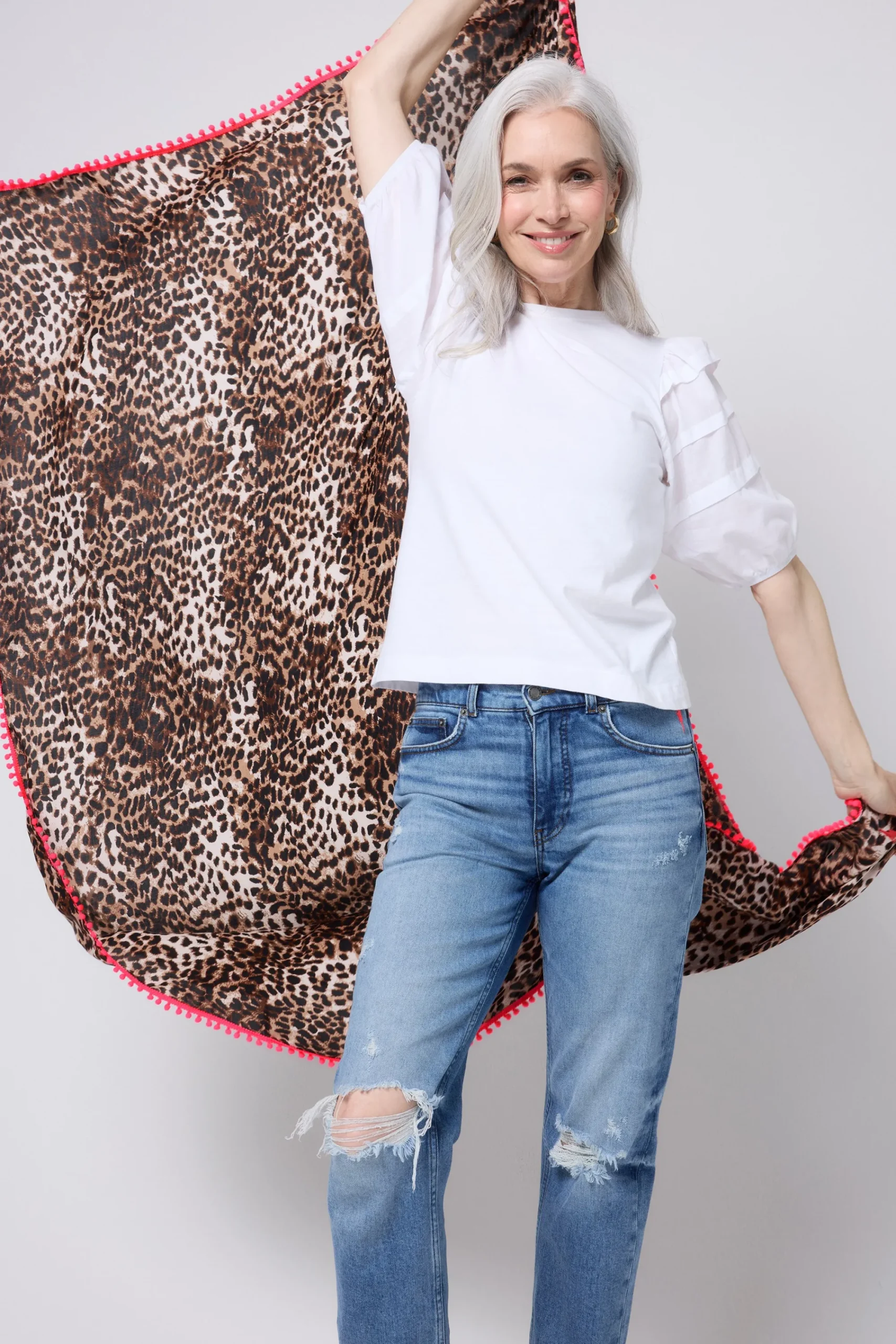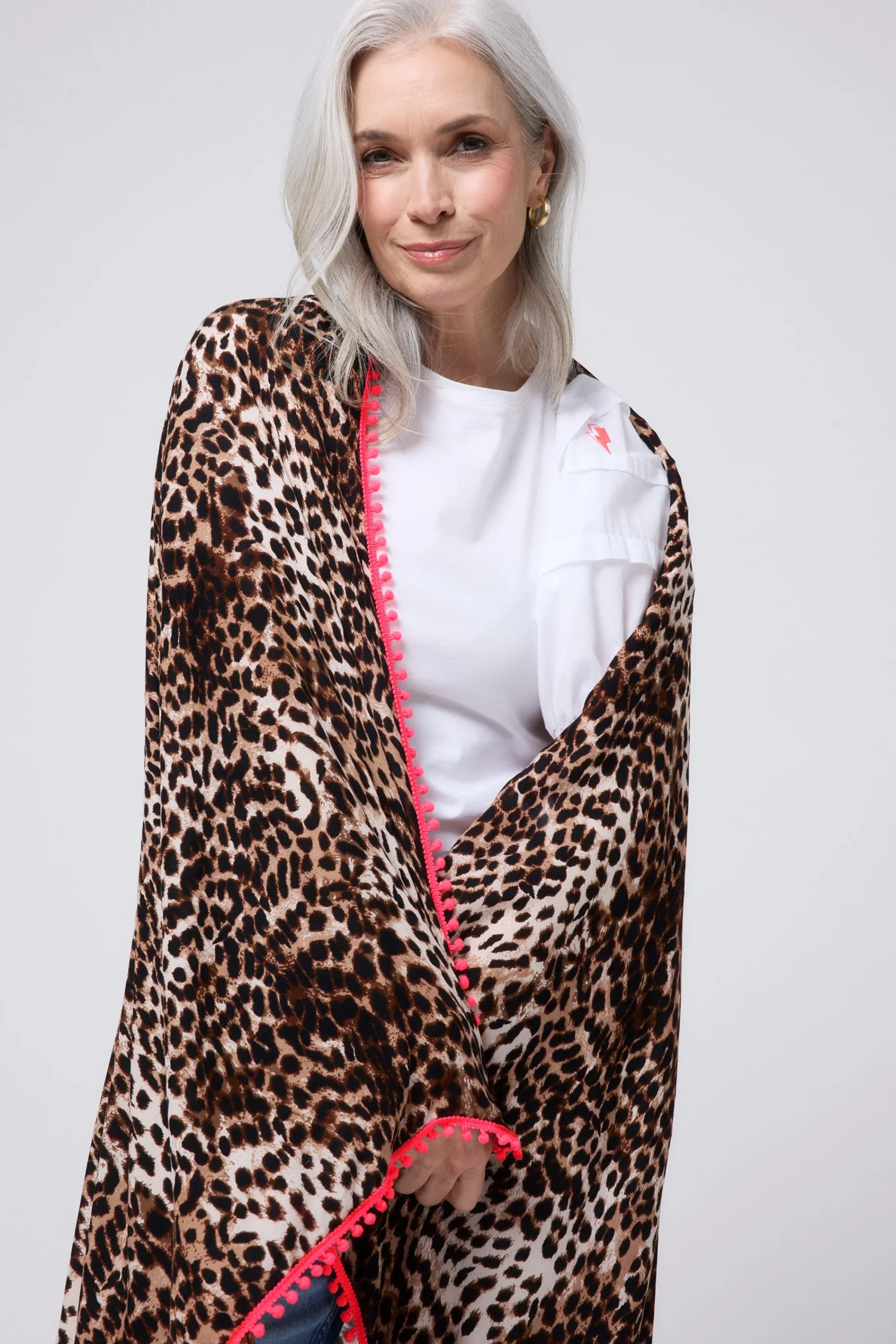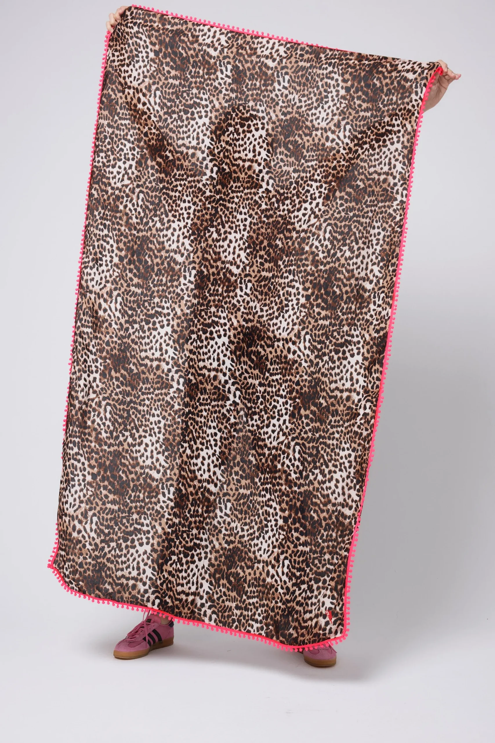 A super soft, superpower infused scarf in our neutral with black cheetah and lightning bolt print. Featuring a neon coral pom pom trim and neon pink embroidered lightning bolt Superpower Button.
