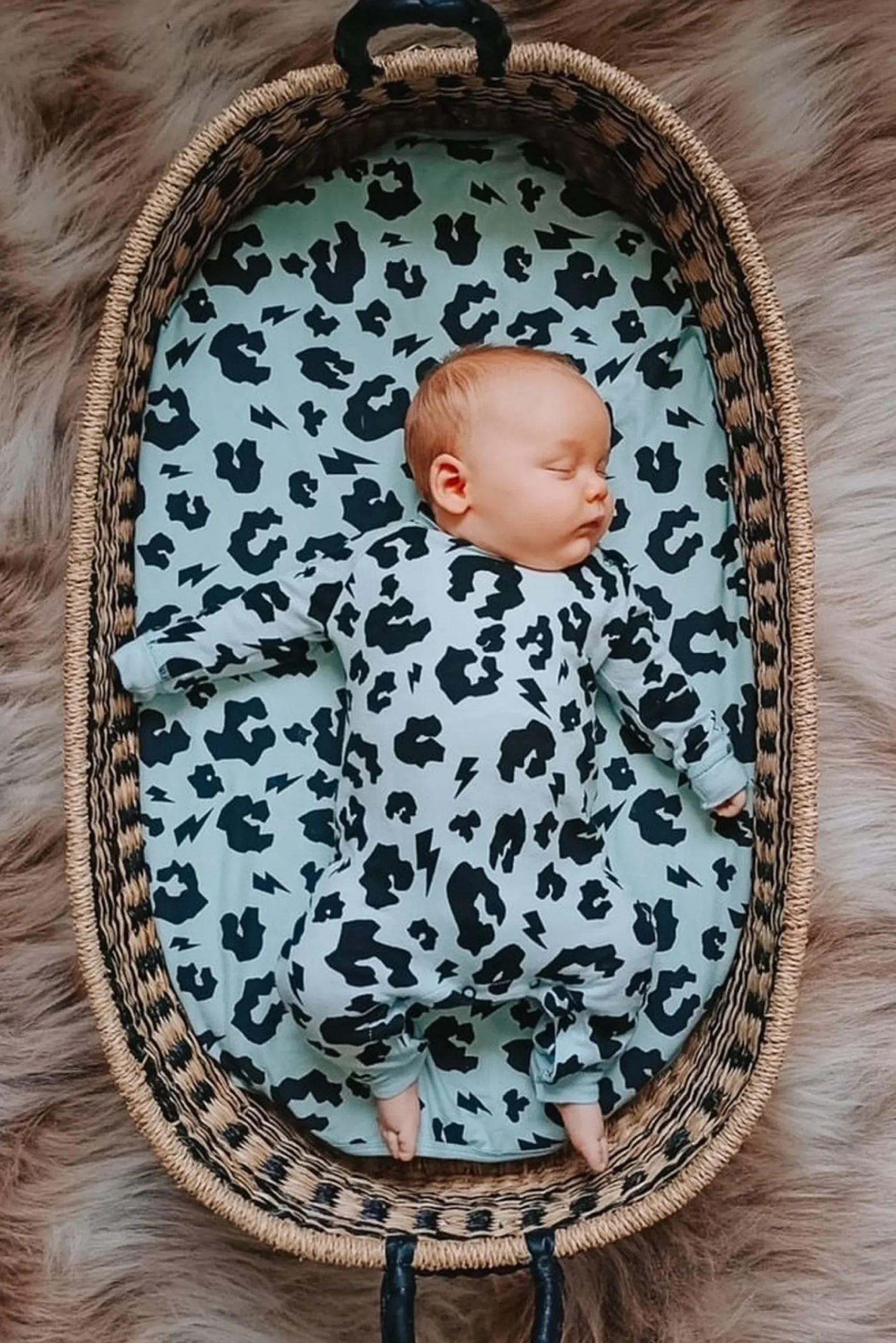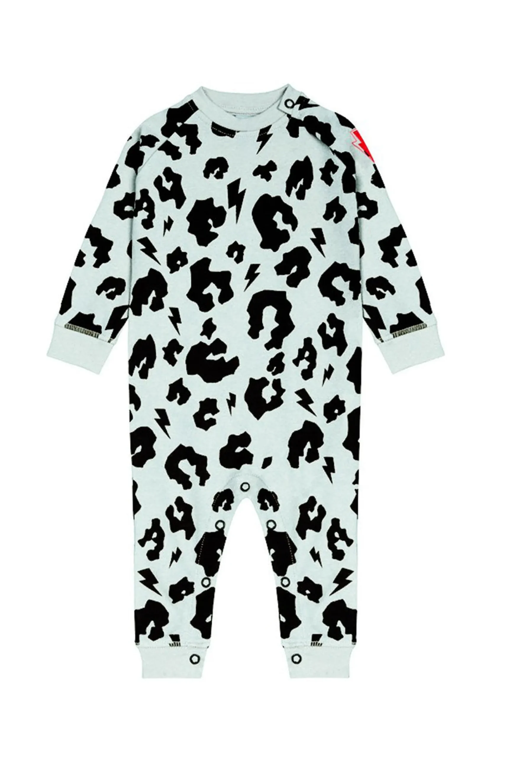 Super soft pale green cotton baby romper featuring our signature leopard and lightning bolt print. Neon pink embroidered bolt ‘Superpower Button’ on sleeve.