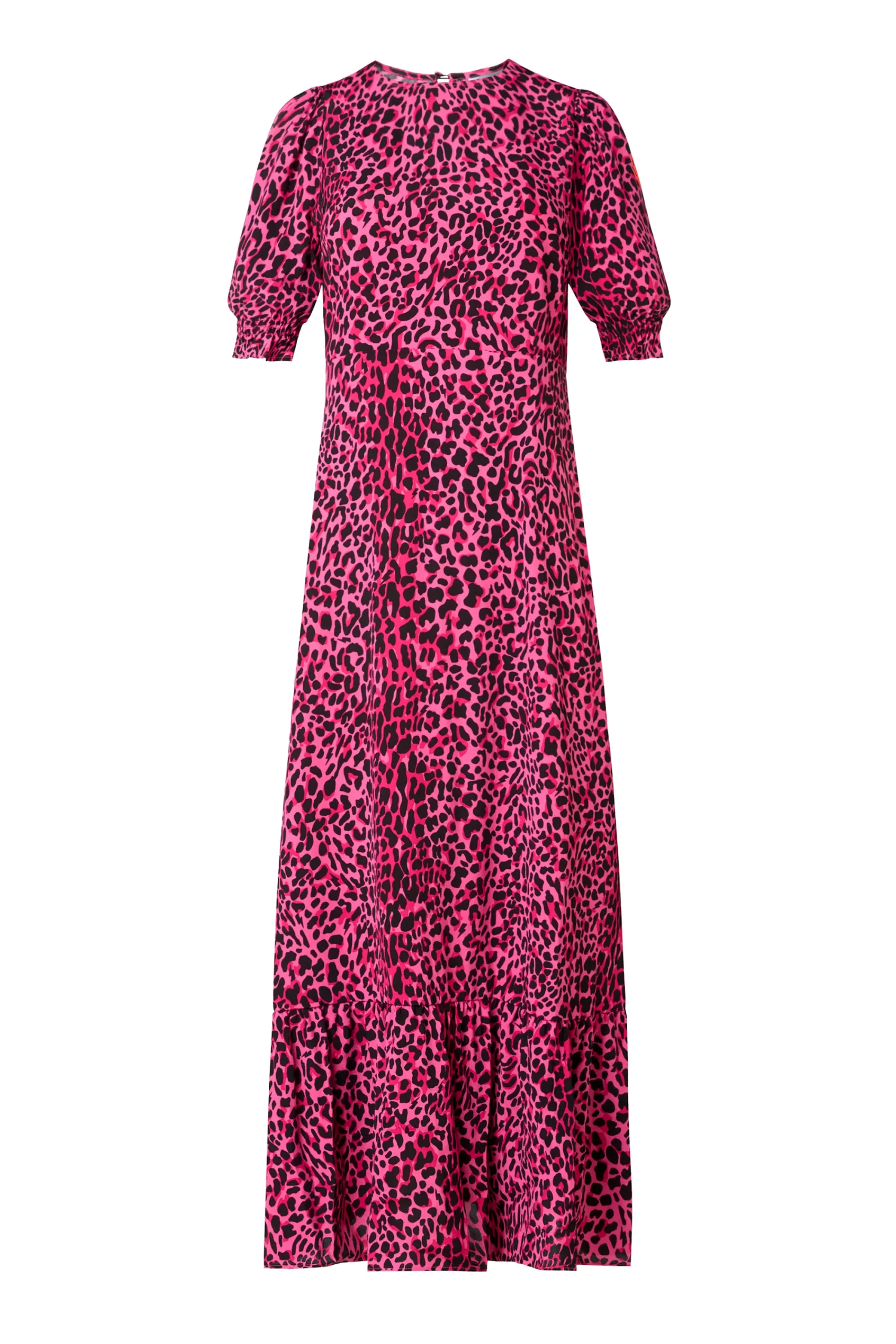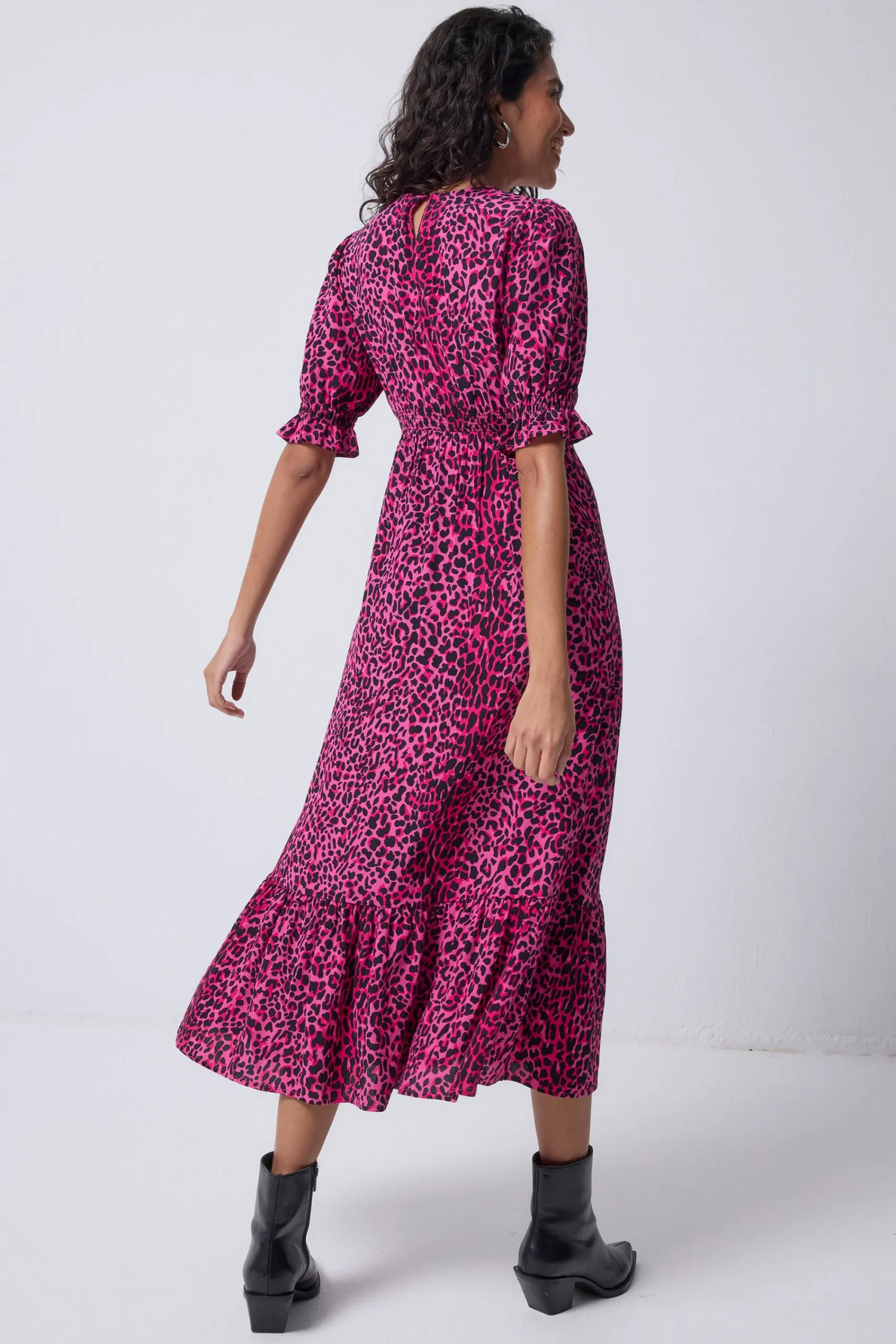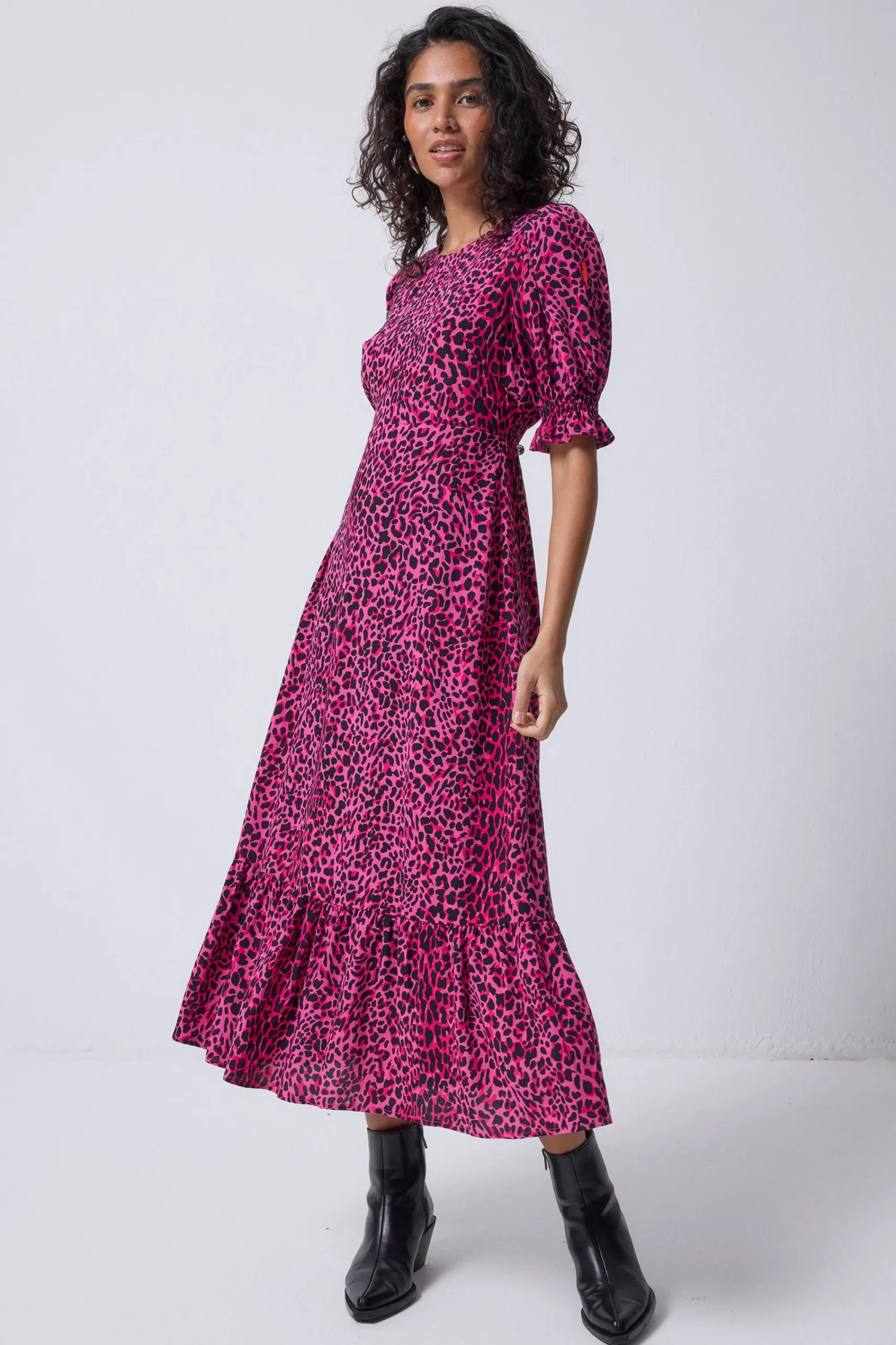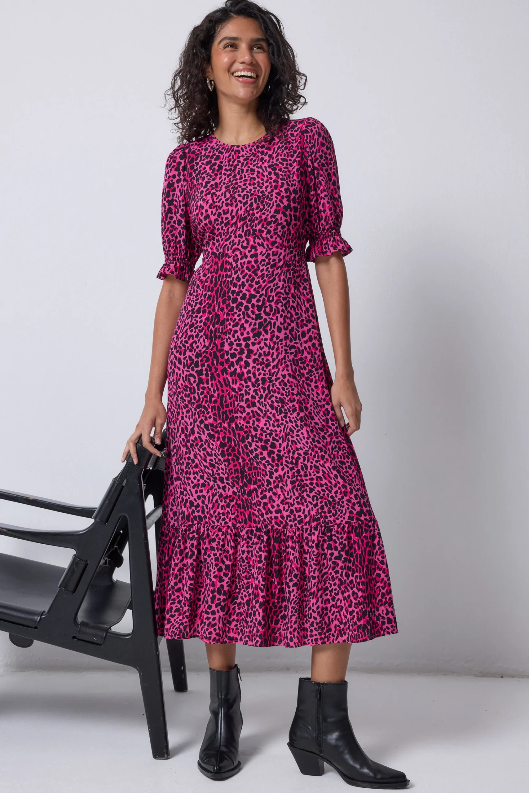 Our pink with black leopard and lightning bolt print flute sleeve midi dress is perfect for work or play. Add heels for an evening style or trade them in for trainers and a denim jacket for everyday wear.