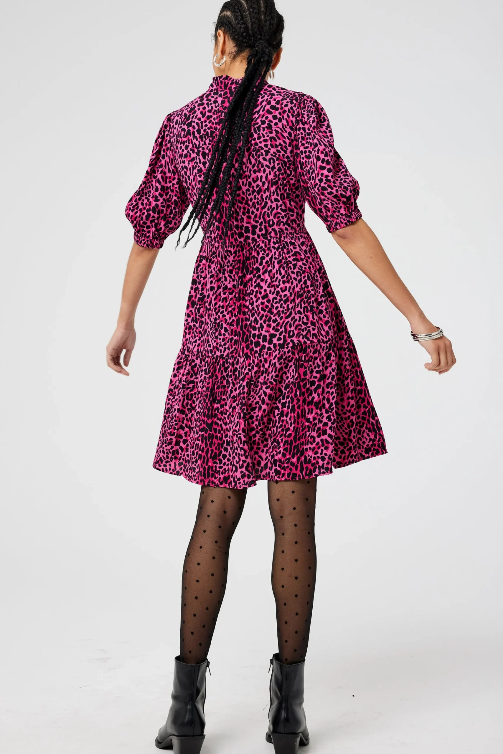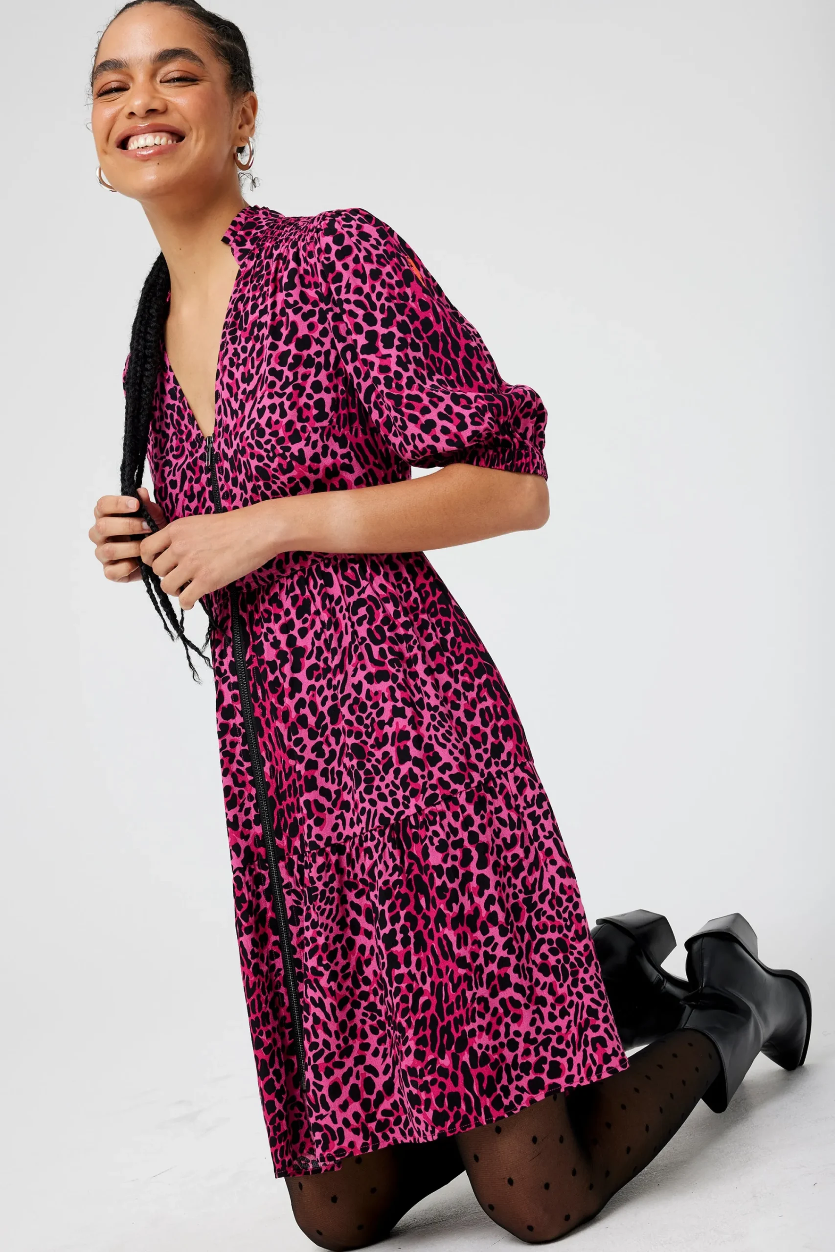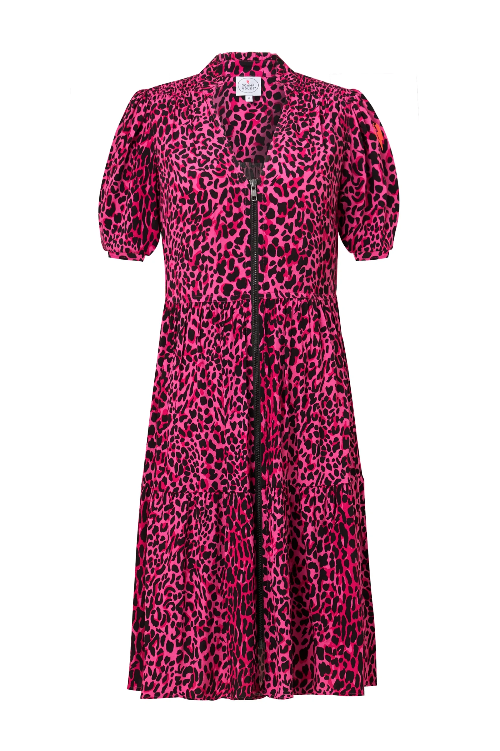 Crafted from soft viscose crepe this pink zip detail tiered short dress is all about off-duty charm. It’s crafted with romantic short blouson sleeve sleeves, a smart v-neckline and a contrast zip fastening. For a flattering silhouette, the short length skirt fall in tiers in a flattering fit and flare style.