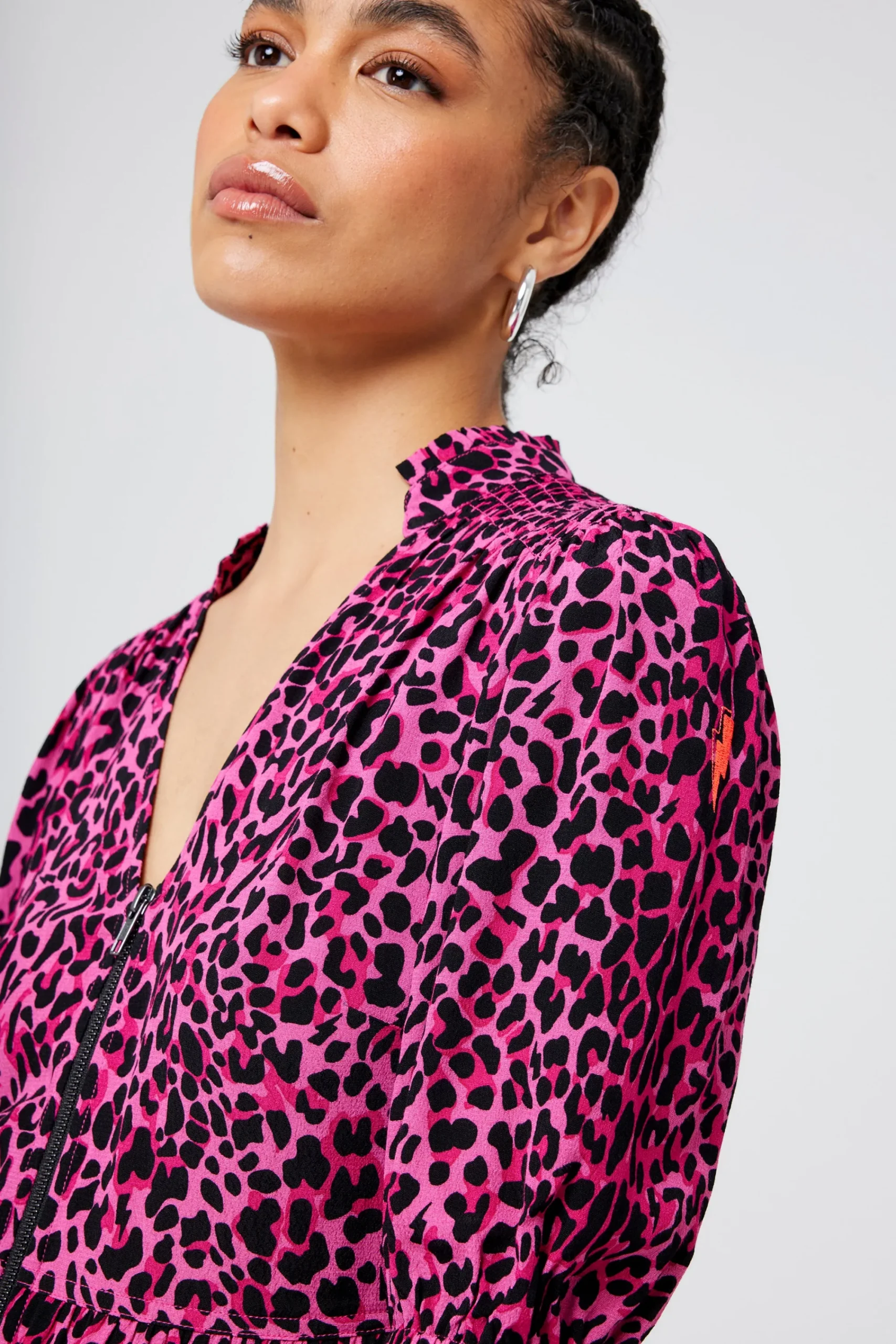 - Signature neon pink embroidered lightning bolt on the sleeve