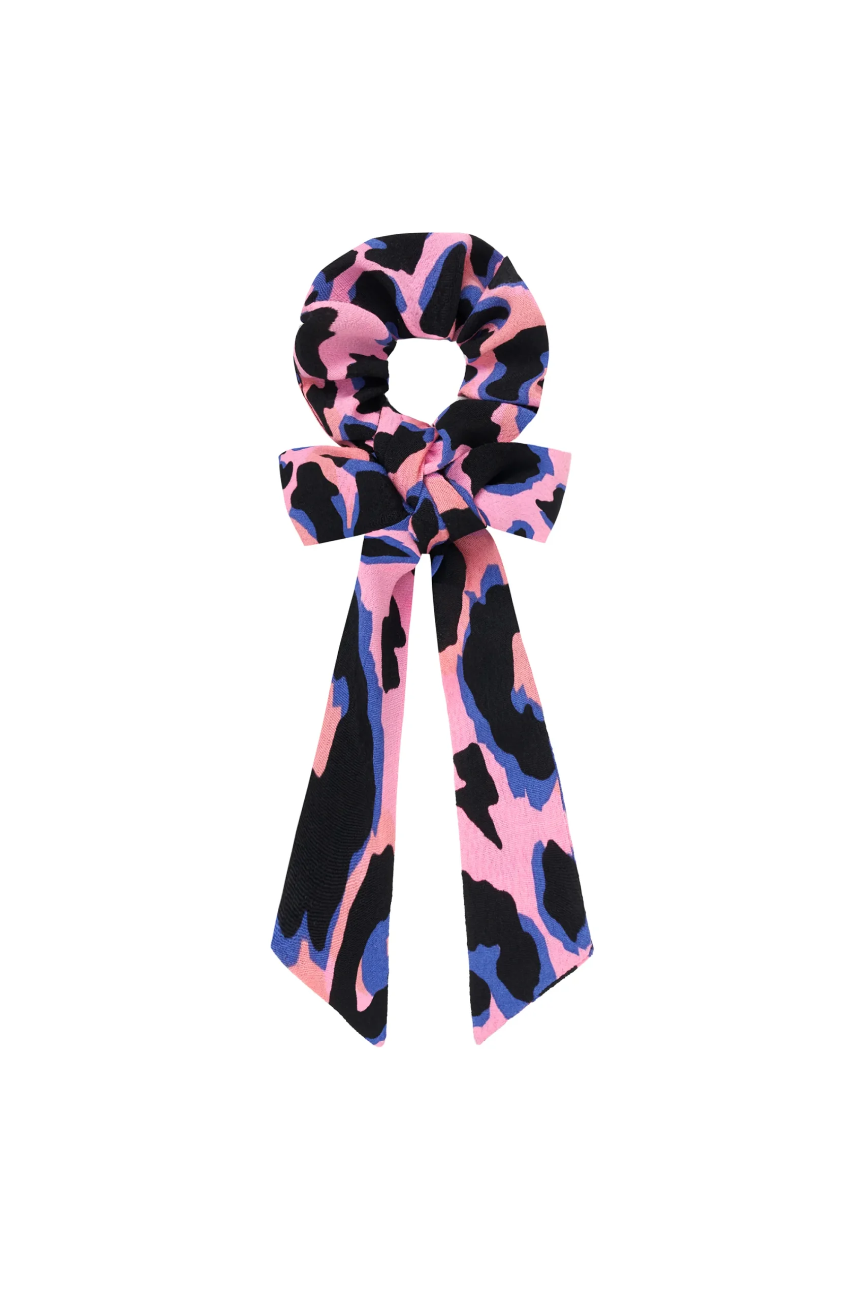 - Pink bow scrunchie in our blue and black shadow leopard and lightning bolt print