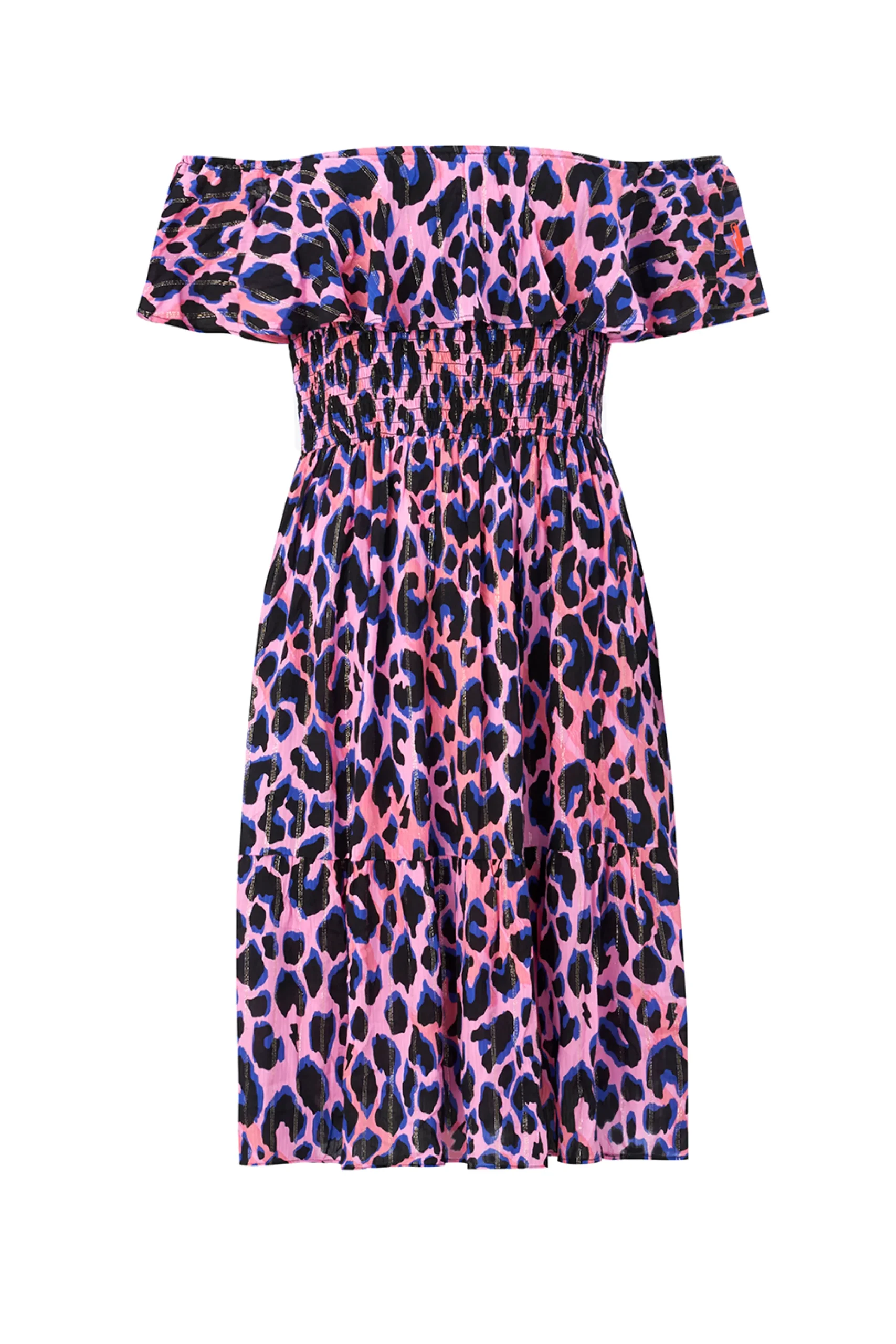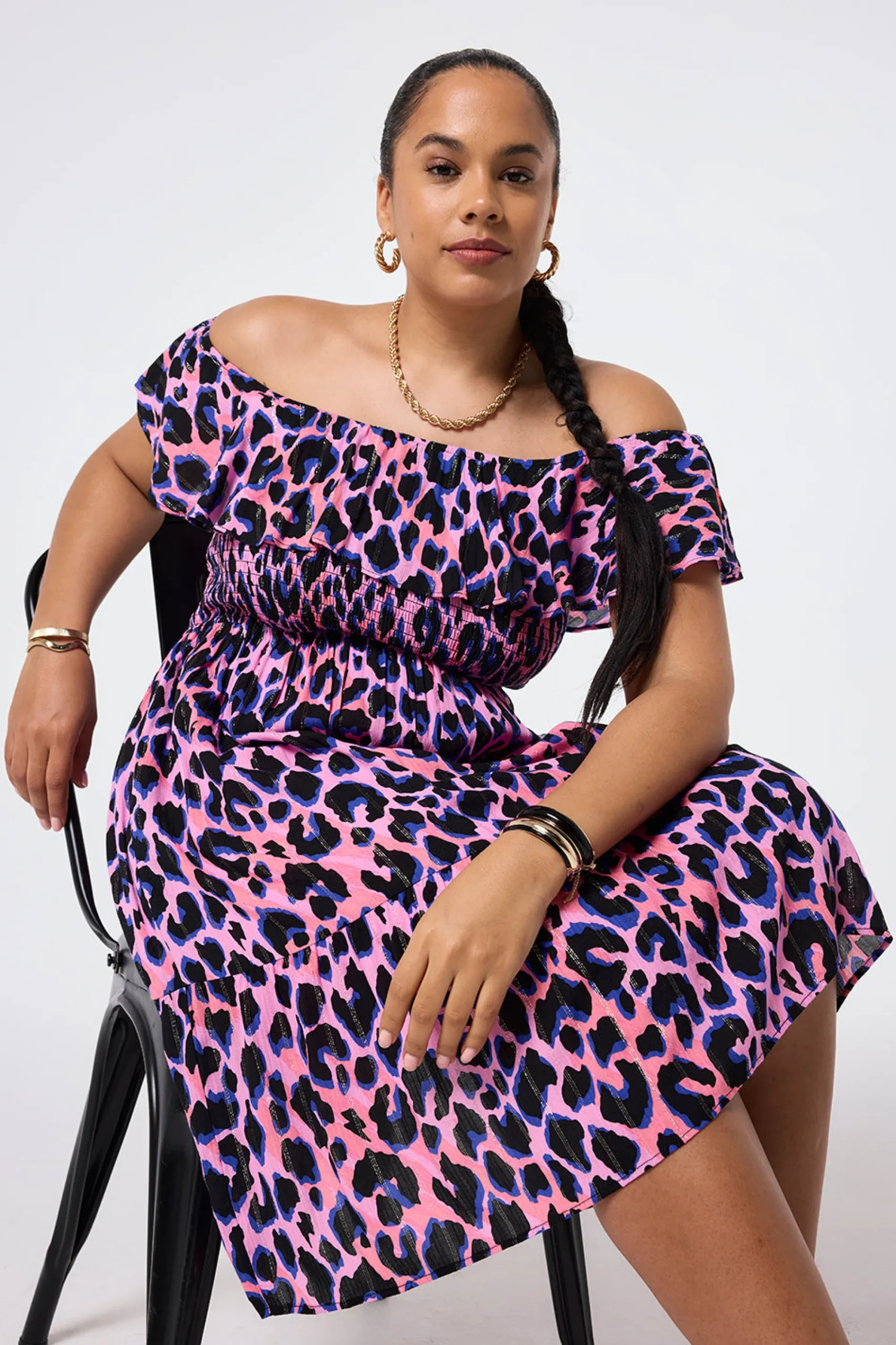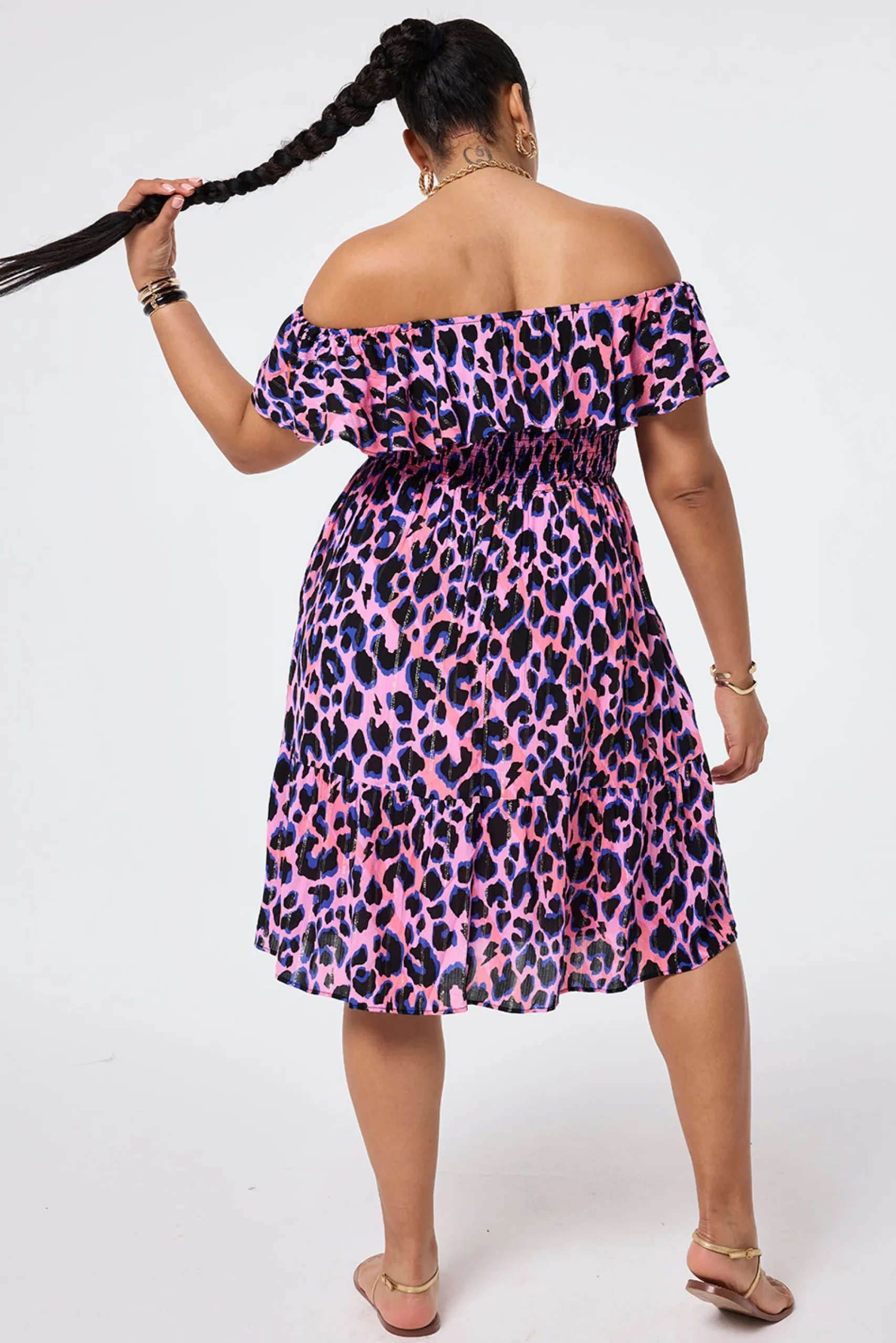Combining comfort and glamour, our stunning pink with blue and black with lurex shadow leopard short bardot dress is made to flatter. Style it three different ways, depending on your mood – on the shoulder, off the shoulder or strapless, by tucking the lightweight fabric in under your arms for a bandeau style. A versatile addition to any summer wardrobe, this dress can be pared back for casual days or up styled for evening affairs with shimmering accessories and strappy heels.