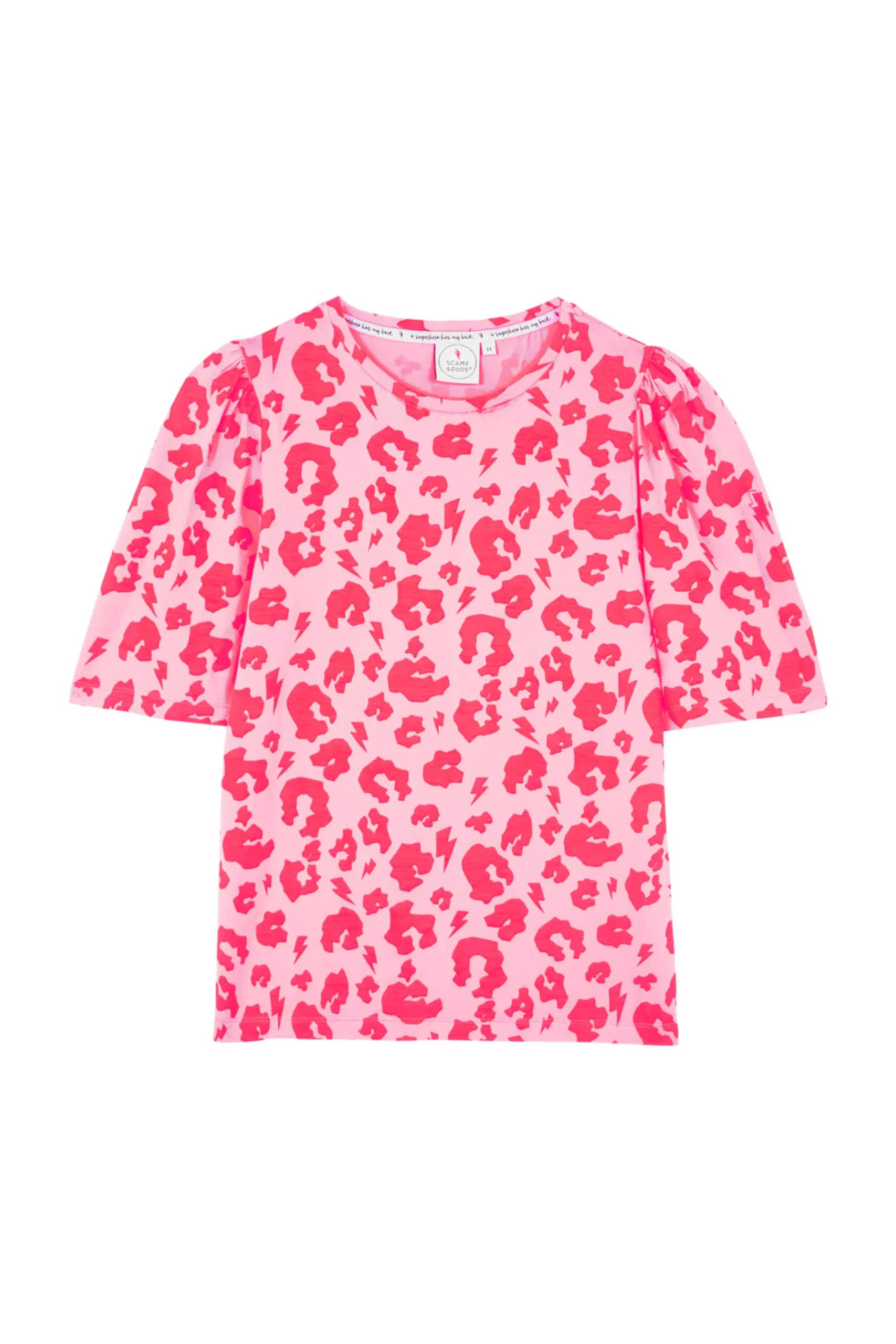 Pink super soft viscose, crew neck t-shirt with our neon coral leopard and lightning bolt print.